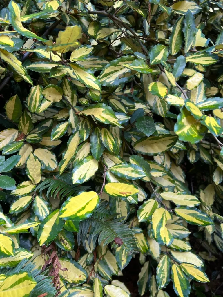 Elaeagnus pungens 'Maculata' is an evergreen shrub reaching 6–10 feet (1.8–3 m) tall with a spread of 6–10 feet (1.8–3 m). This cultivar of E. pungens is distinguished by leaves with an irregular bright golden-yellow to yellow-green central blotch or splash against a dark green background; the variegation pattern varies from leaf to leaf and ranges from small central spots to blotches covering most of the leaf surface. The leaf underside retains the characteristic dense silvery scaling of the species. Leaves are leathery, oval to oblong, 2–4 inches (5–10 cm) long with wavy margins. Stems bear stiff thorns and are covered with rust-colored to silvery scales on young growth. The plant forms a broad mounding to spreading habit, generally somewhat less vigorous than the plain green species. In October through November, small tubular white flowers approximately 1/4 inch (6 mm) long appear in leaf axils and produce an intensely sweet honey-like fragrance. All-green reverted shoots grow faster than the variegated portions and must be removed promptly to prevent them from dominating the plant. Growth rate is moderate to vigorous; plants reach mature dimensions in 5–8 years.