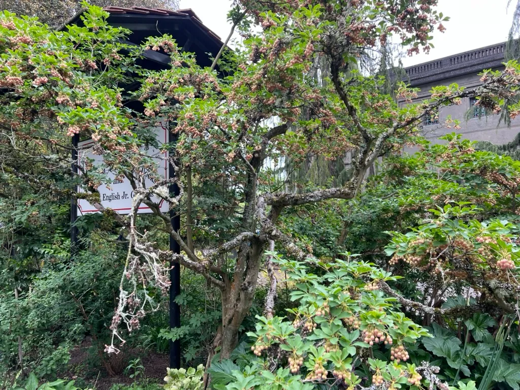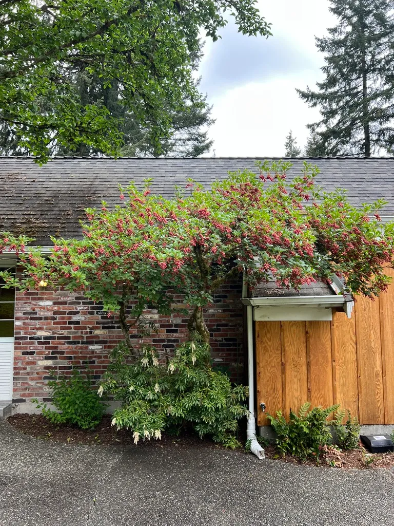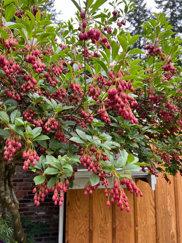 One of the finest four-season shrubs for PNW woodland and acid-soil gardens — Great Plant Picks endorsed. The tiered architectural branching provides year-round structure; the pendant cream-and-red-veined spring bells are elegant; the summer foliage is clean and textural; and the fall color rivals the best Japanese maples in brilliance. Excellent in woodland gardens alongside rhododendrons, Japanese maples, and pieris where it fills the mid-story shrub layer. Equally effective as a stand-alone specimen where the architectural tiered form can be fully appreciated. Associates naturally with ferns, hellebores, and shade-tolerant groundcovers. The fall color is best with some direct sun — full shade reduces intensity.How to Identify