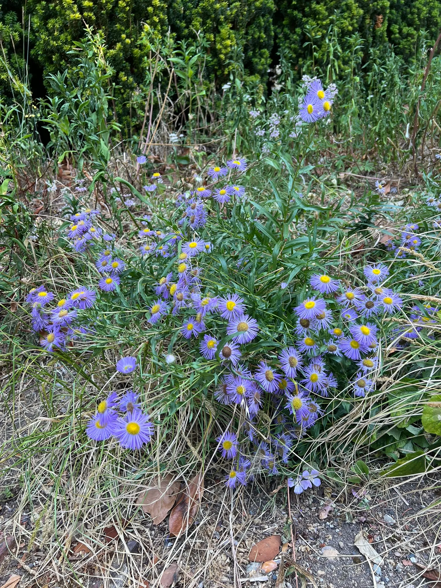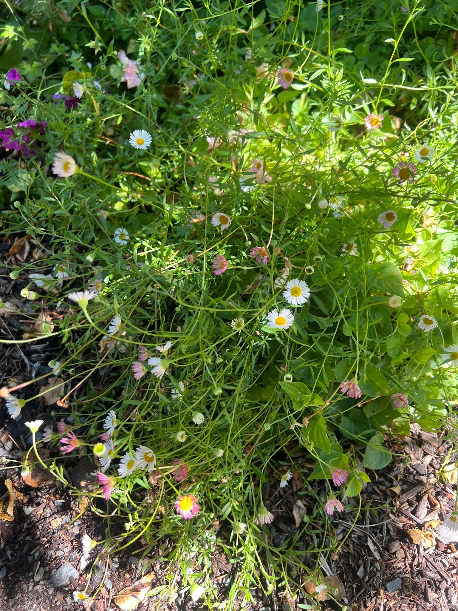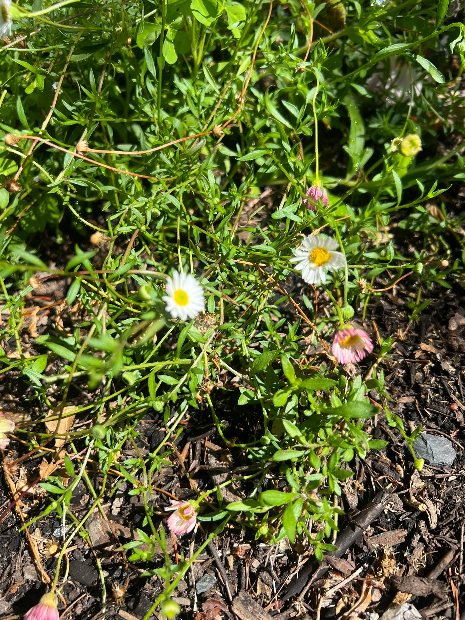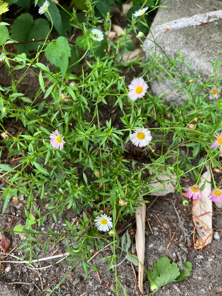A spreading, semi-evergreen perennial in the family Asteraceae, native to Mexico and Central America. Plants form loose mounds 6–12 inches (15–30 cm) tall and 18–36 inches (45–90 cm) wide of slender, branching stems bearing small, lance-shaped to spoon-shaped leaves 0.5–1.5 inches (1.3–4 cm) long. From late spring through first frost, plants produce an almost uninterrupted succession of small daisy-like flower heads 0.5–0.75 inch (1.3–2 cm) across. Each flower head opens white with yellow disc florets, then ages through pink to purple-pink over several days, so plants carry flowers in all three color stages simultaneously, giving a soft, multicolored effect. Self-seeds prolifically in suitable conditions — between paving, in wall crevices, and on gravel — creating naturalized colonies that require little management. Hardy to approximately 23°F (-5°C); root-hardy to zone 5 in sheltered positions with good drainage. In zones 9–11, plants may remain in flower nearly year-round. The species is listed as invasive or potentially invasive in parts of the British Isles, New Zealand, and Australia.