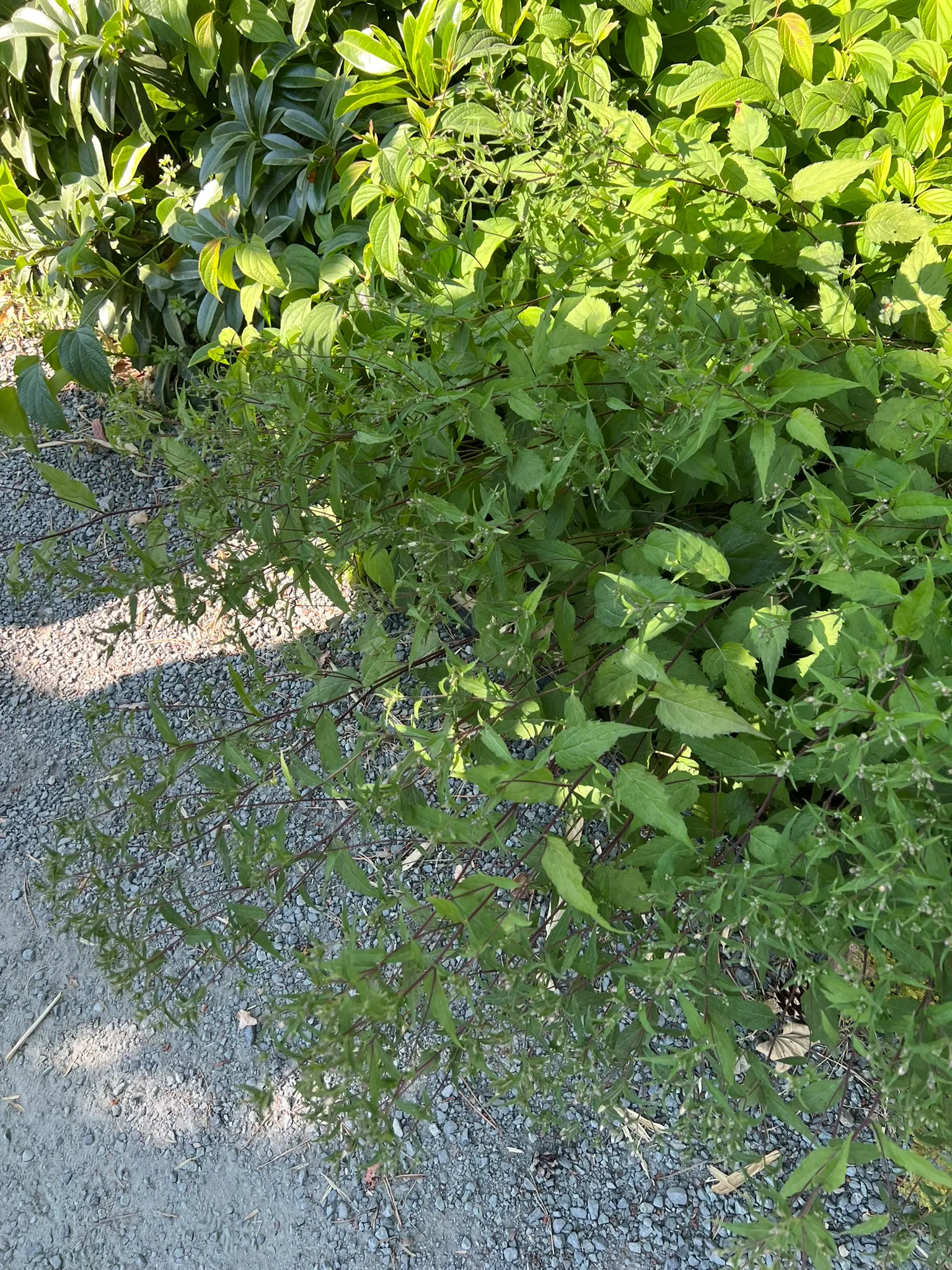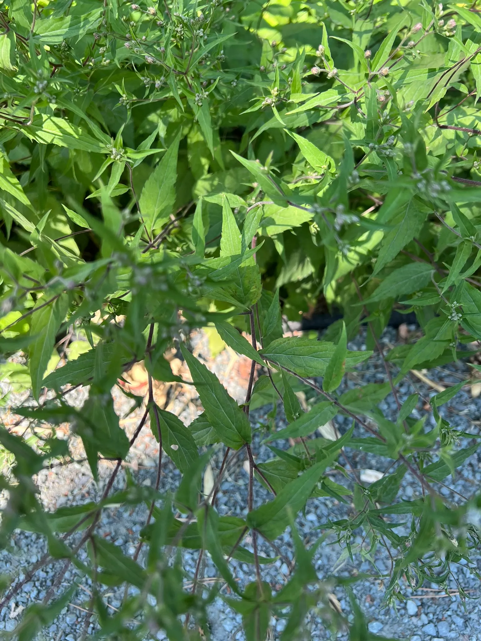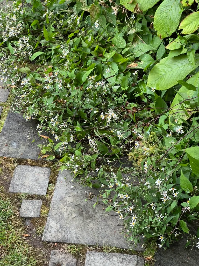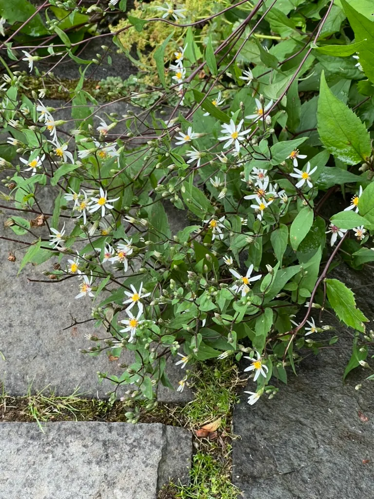 A rhizomatous, spreading perennial in the family Asteraceae, native to the deciduous woodlands of eastern North America. Plants form mounded, slightly arching colonies 12–24 inches (30–60 cm) tall and 18–36 inches (45–90 cm) wide of dark, wiry, zigzagging stems bearing heart-shaped, toothed leaves 1.5–3 inches (4–8 cm) long with a rough upper surface, dark green with purplish stems. From late summer through fall, the stem tips branch into loose, airy clusters of small daisy-like flower heads 0.5–0.75 inch (1.3–2 cm) across, each with 6–12 white ray florets surrounding a small yellow disc that ages to red-purple. The overall effect in September–October is of white flowers floating in drifts over dark foliage. One of the most shade-tolerant fall-blooming perennials available. Spreads by rhizomes to form colonies; can be vigorous in moist, humus-rich soil. All parts mildly toxic.
