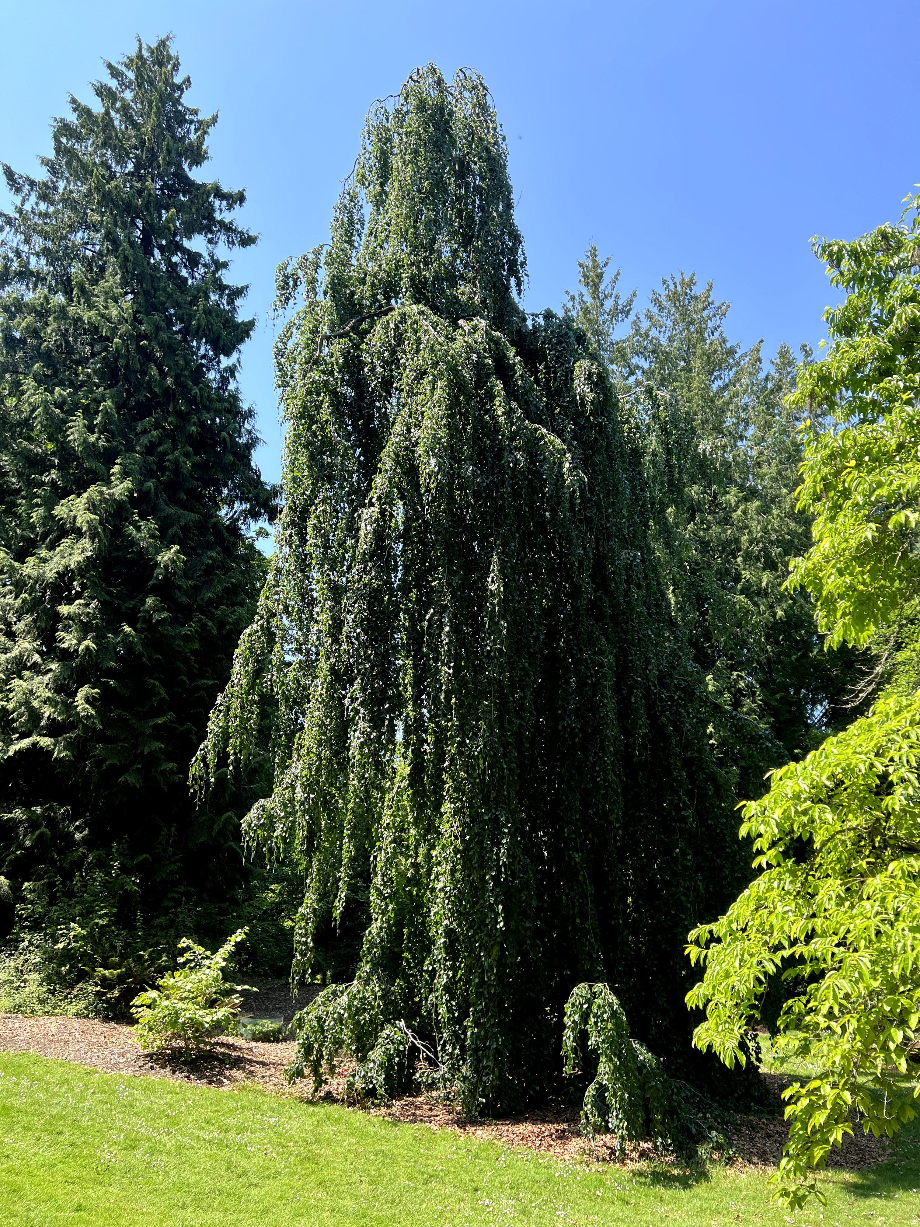 One of the most spectacular specimen trees available for large PNW gardens, parks, and estates — Great Plant Picks endorsed. The mature weeping beech creates one of the garden's most theatrical effects: the pendulous curtain of branches reaching to the ground forms an enclosed green room that visitors can walk into, a living architectural experience unlike any other commonly grown tree. Best sited as a standalone specimen with at least 50 feet (15 m) of clear space in all directions to allow full development. The PNW maritime climate produces outstanding weeping beeches — fine examples exist in Seattle's parks and throughout western Oregon. A long-term investment of the highest order: the tree improves dramatically over decades and is effectively permanent once established. Stake the leader diligently in the first 10–15 years — this single step determines whether the tree reaches its potential.How to Identify