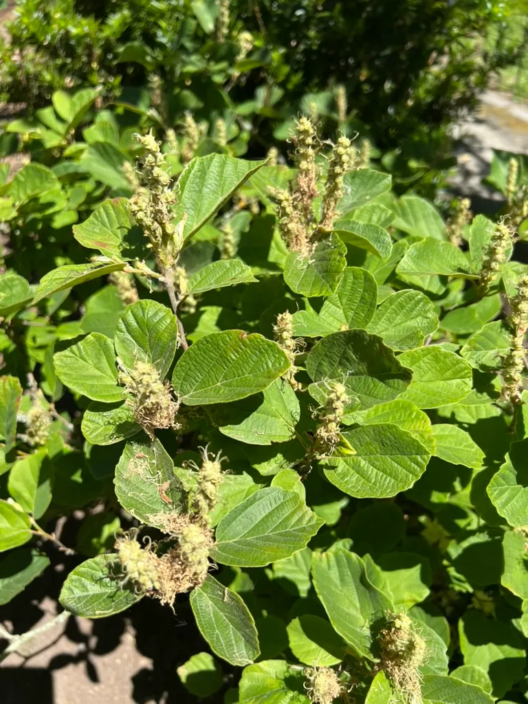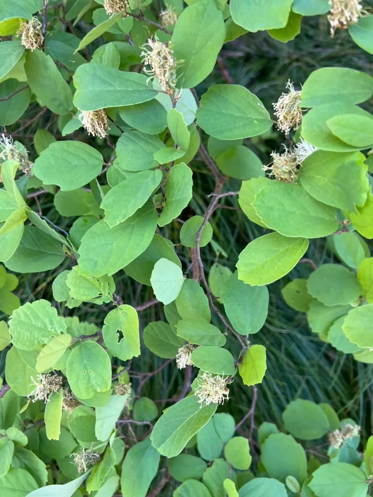 Fothergilla gardenii, commonly called dwarf fothergilla or witch-alder, is a compact, slow-growing deciduous shrub in the family Hamamelidaceae, native to the coastal plain of the southeastern United States from North Carolina to northern Florida and west to the Gulf Coast, growing in moist, acidic, sandy soils in pine savannas, pocosins, and wetland margins. It is one of two species in the genus and among the finest multi-season shrubs for Pacific Northwest gardens with acidic soil. In spring, before the leaves emerge, erect bottlebrush-like flower spikes 1–2 inches (2.5–5 cm) tall appear on bare branches — composed entirely of white stamens with no petals — and carry a strong, honey-sweet fragrance. The rounded, dark blue-green leaves with wavy, irregularly toothed margins emerge after flowering and provide a handsome, bold-textured canopy through summer. In autumn, the foliage produces some of the most varied and intense fall color of any small shrub: individual plants display yellow, orange, scarlet, and deep purple simultaneously, often all on the same branch. Plants typically grow 2–3 feet (60–90 cm) tall and wide, though selections such as 'Blue Mist' and 'Mount Airy' offer variations. A Great Plant Pick and an exceptional choice for the woodland garden, mixed border, and foundation planting in Pacific Northwest conditions.