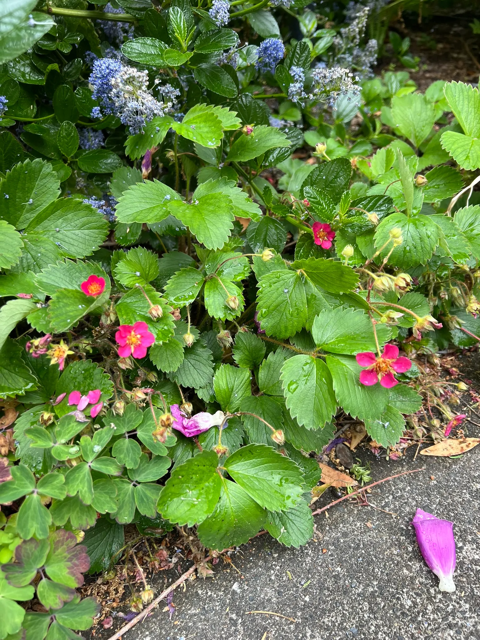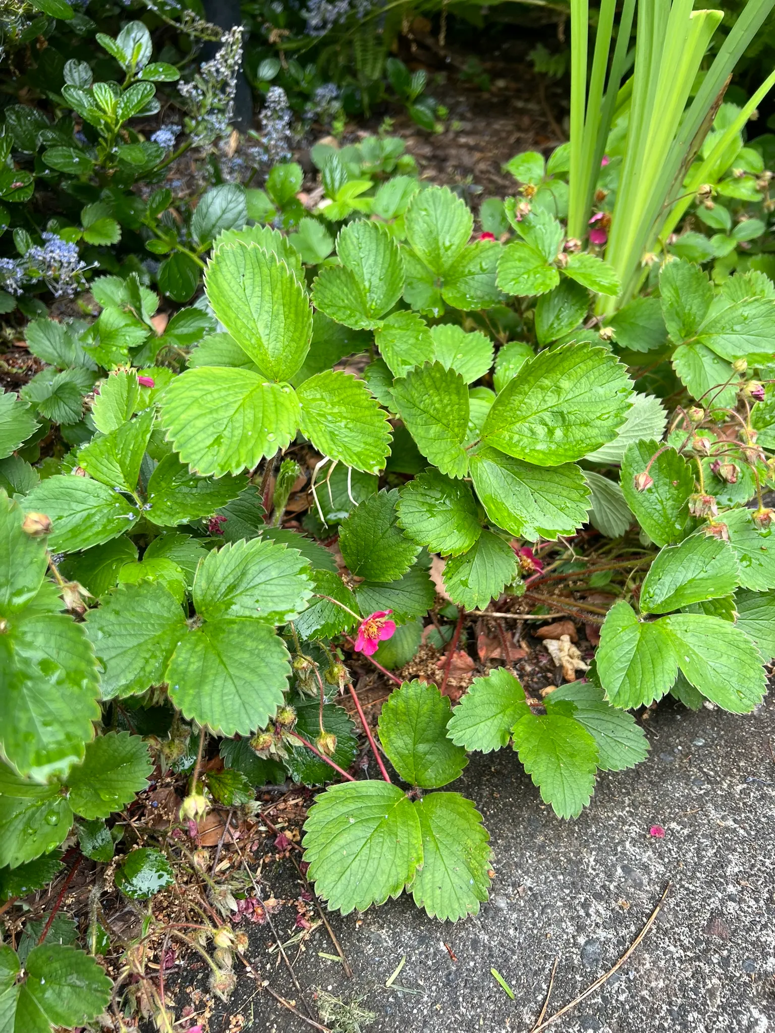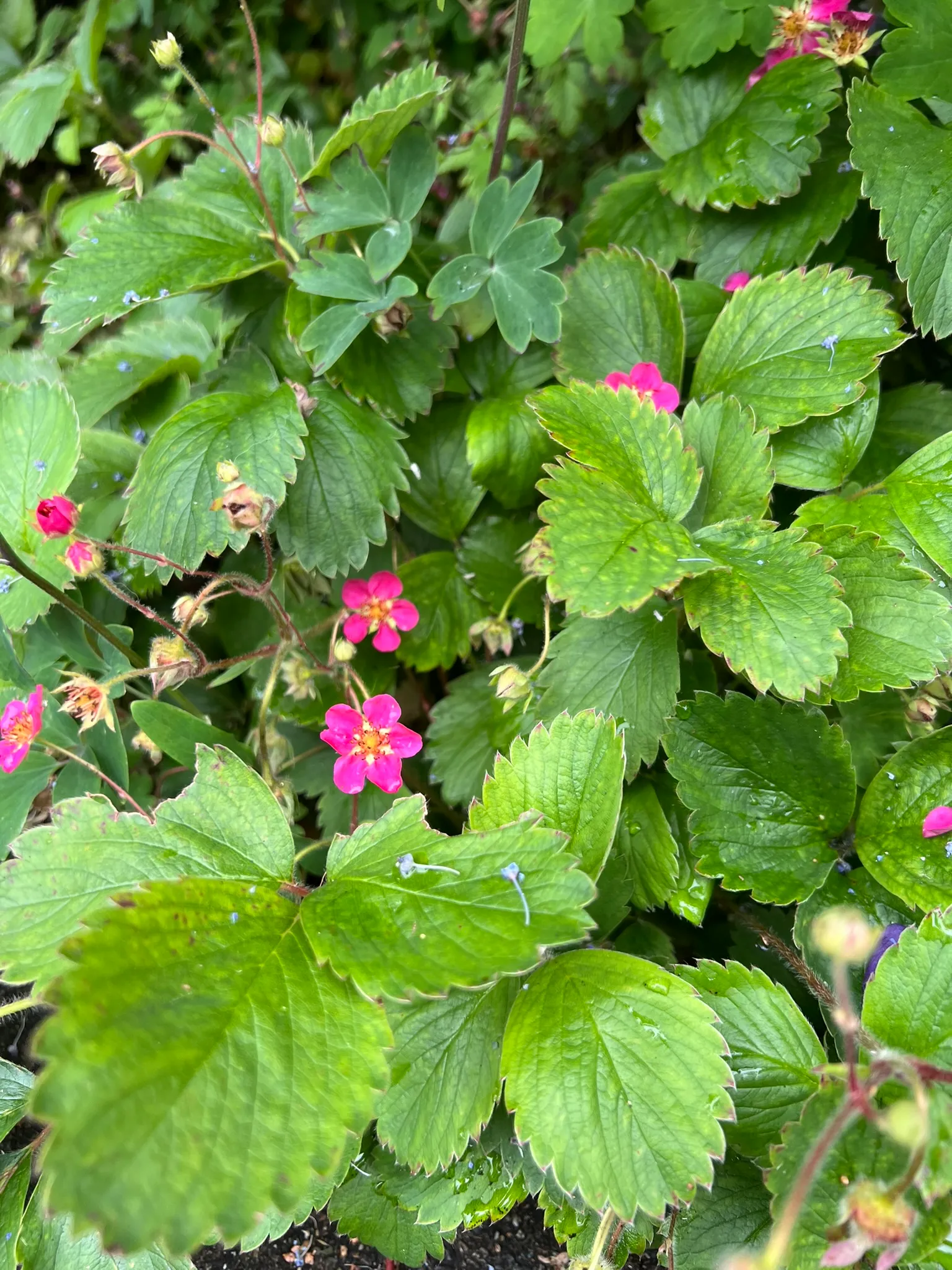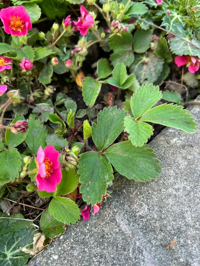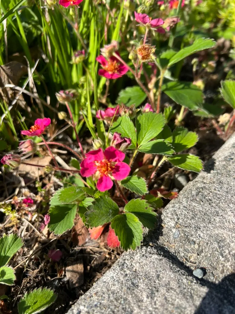 Fragaria 'Lipstick' is an ornamental hybrid strawberry in the family Rosaceae, bred as a groundcover and container plant prized for its long season of bright rose-pink flowers rather than fruit production. The cultivar is thought to be a hybrid involving Fragaria × ananassa (garden strawberry) and possibly Potentilla palustris (marsh cinquefoil), producing a low-growing, stoloniferous mat 4–6 inches (10–15 cm) tall spreading 18–24 inches (45–60 cm) or more by runners. Three-part (trifoliate), toothed, glossy green leaves are characteristic of the genus; new foliage emerges with a slight bronze tint. Vivid rose-pink to deep pink flowers, 0.75–1 inch (2–2.5 cm) across, are produced continuously from mid-spring through autumn in Pacific Northwest gardens — a much longer flowering season than fruiting strawberry cultivars. Small, ornamental red fruits follow the flowers and are attractive to birds. 'Lipstick' is grown primarily as an ornamental flowering groundcover; while the fruits are edible, they are small and of modest flavor compared to fruiting varieties.