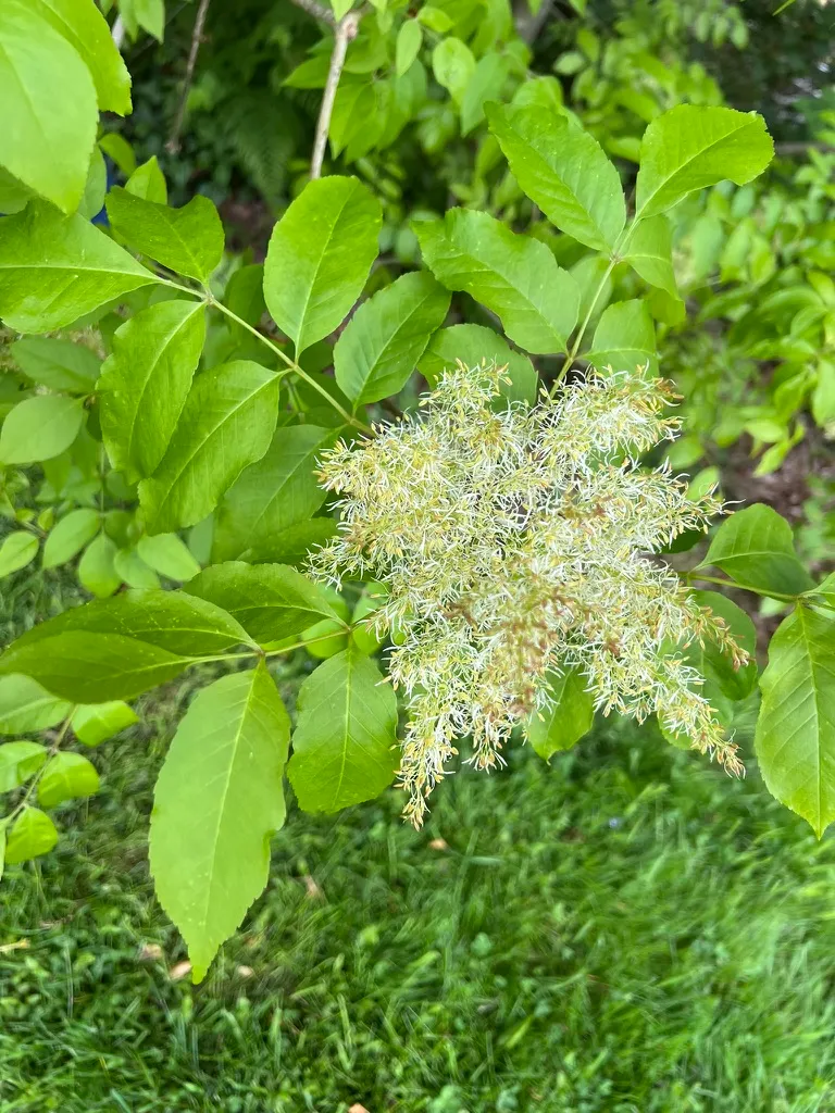 Fraxinus ornus, commonly called flowering ash or manna ash, is a medium-sized deciduous tree in the family Oleaceae native to southern Europe and southwestern Asia — the only ash species routinely cultivated primarily for its ornamental flowers. In May and early June, the tree produces spectacular, large, creamy-white, fragrant panicles 3–5 inches (7–12 cm) long — composed of strap-shaped petals in four narrow lobes — covering the canopy in a frothy, cloud-like mass as the new leaves emerge. The opposite, pinnately compound leaves carry 7–9 leaflets that emerge with a bronze-purple tinge, mature to dark green in summer, and turn yellow to reddish-purple in autumn. Trees reach 40–65 feet (12–20 m) at maturity but are typically seen at 25–40 feet (7.5–12 m) in cultivation. Gray, smooth bark remains attractive on young trees, becoming slightly furrowed with age. The common name manna ash refers to the sweet, dried sap historically harvested from bark incisions on trees grown in Sicily and Calabria, used medicinally as a gentle laxative. Unlike most other ash species, F. ornus has not been significantly affected by emerald ash borer in trials to date, and its flowering habit gives it particular ornamental distinction.