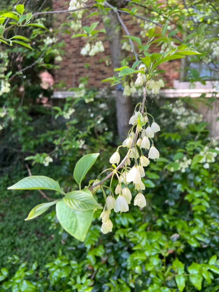 Halesia carolina (syn. H. tetraptera), commonly called Carolina silverbell or four-winged silverbell, is a small to medium-sized deciduous tree in the family Styracaceae native to the rich, moist woodland slopes and stream banks of the southeastern United States. It grows 20–40 feet (6–12 m) tall and nearly as wide in open conditions, with a rounded to broadly spreading crown and attractive gray-brown bark that becomes shallowly furrowed with interlacing ridges on mature specimens. In spring (April–May), the bare branches — or branches just as the leaves begin to emerge — are hung with pendulous clusters of two to five bell-shaped white flowers, each 0.5–0.75 inches (12–20 mm) long, creating a graceful, cascading display visible from a distance. The flowers are lightly fragrant and a nectar source for early native bees. The large, alternate, elliptic leaves 3–5 inches (7.5–12 cm) turn a clear yellow in autumn. Distinctively, female trees develop four-winged, dry, papery fruit 1–1.5 inches (2.5–4 cm) long that ripen in late summer and persist through winter, providing structural interest and food for birds. A Great Plant Pick for Pacific Northwest gardens in acidic soil.