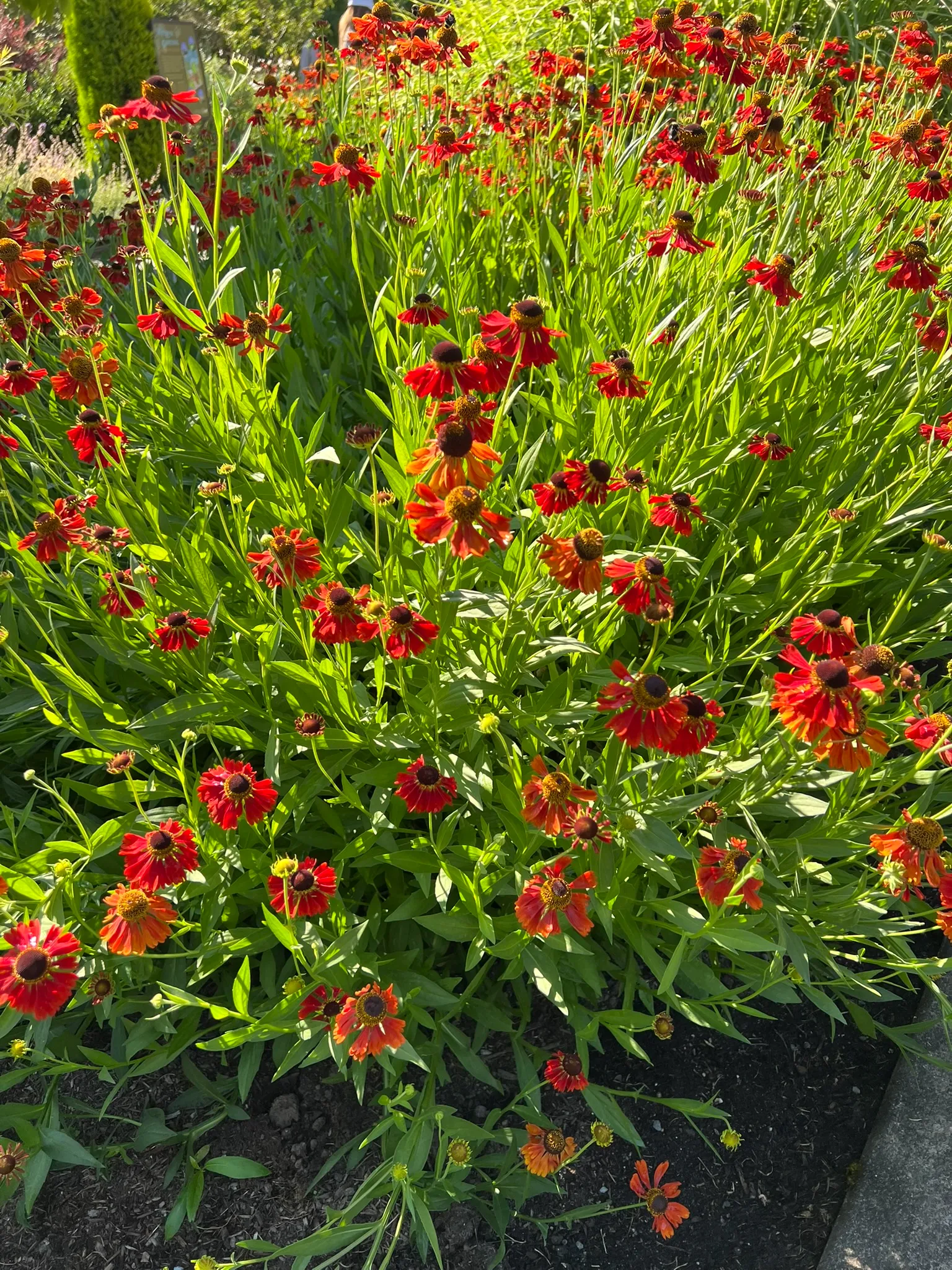 A genus of clump-forming native perennials in the family Asteraceae, native to meadows, prairies, and moist areas across North America, with the majority of garden-worthy species from the central and eastern United States. Plants form upright clumps of leafy, winged stems 18–60 inches (45–150 cm) tall — height varies widely by species and cultivar. Leaves are lance-shaped to ovate, medium green, and decurrent (running down the stem to form wings). From midsummer through fall, stems produce an abundance of daisy-like flower heads 1.5–2.5 inches (4–6 cm) across with distinctive wedge-shaped ray florets (notched or reflexed at the tips) surrounding a prominent, dome-shaped or button-like disc in yellow-green to brown. Flower colors range from pure yellow through orange, copper, bronze, and mahogany-red, including bicolors. Modern cultivars of H. autumnale, H. hoopesii, and their hybrids offer compact growth, extended bloom, and intensified colors. Despite the common name, sneezeweed pollen is not wind-dispersed and does not cause hay fever; the name derives from historical use of dried leaves as snuff. All parts are toxic to livestock; some toxicity to pets.