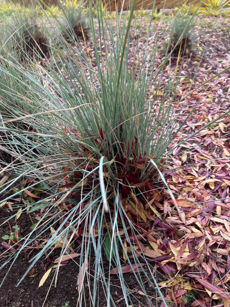 A cool-season, clump-forming perennial grass reaching 24–30 inches (60–76 cm) tall with a similar spread, excluding flower stalks. Leaves are narrow, 12–18 inches (30–46 cm) long and approximately 0.25 inches (6 mm) wide, blue-gray with a waxy bloom on both surfaces. Foliage is stiff and arching, forming a dense, fountain-shaped mound. Leaf tips taper to a sharp point; margins are finely scabrous. In late spring to early summer, wiry flowering culms rise 36–48 inches (90–122 cm) above the foliage, bearing loose, one-sided panicles of oat-like spikelets that emerge tan to straw-colored and dry to a pale buff. Spikelets are approximately 0.5 inches (12 mm) long. Growth rate is slow to moderate; plants reach mature size in 2–3 years from a gallon container. The foliage is evergreen in zones 7–9, semi-evergreen in zones 5–6, and may brown at tips during cold, wet winters. Clumps tend to die out in the center after 4–6 years in humid climates or heavy soils. Inner foliage turns brown over winter and requires annual removal. Does not spread by runners or rhizomes.
