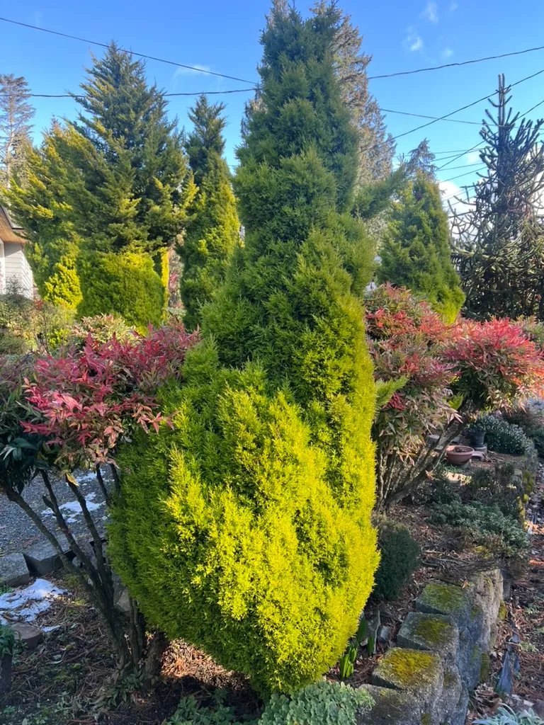 Planted as a vertical accent, specimen, or in narrow spaces where a bright golden column is desired, spaced 3-5 feet (0.9-1.5 m) apart. Effective in containers (minimum 15-gallon) for patios and entryways, which also allows relocation to shelter in cold winters. The lemon fragrance adds sensory interest near pathways. Shorter-lived than most landscape conifers; consider as a medium-term accent rather than a permanent planting. For a hardier golden conifer, consider Thuja occidentalis 'Rheingold' or Chamaecyparis obtusa 'Crippsii'.How to Identify