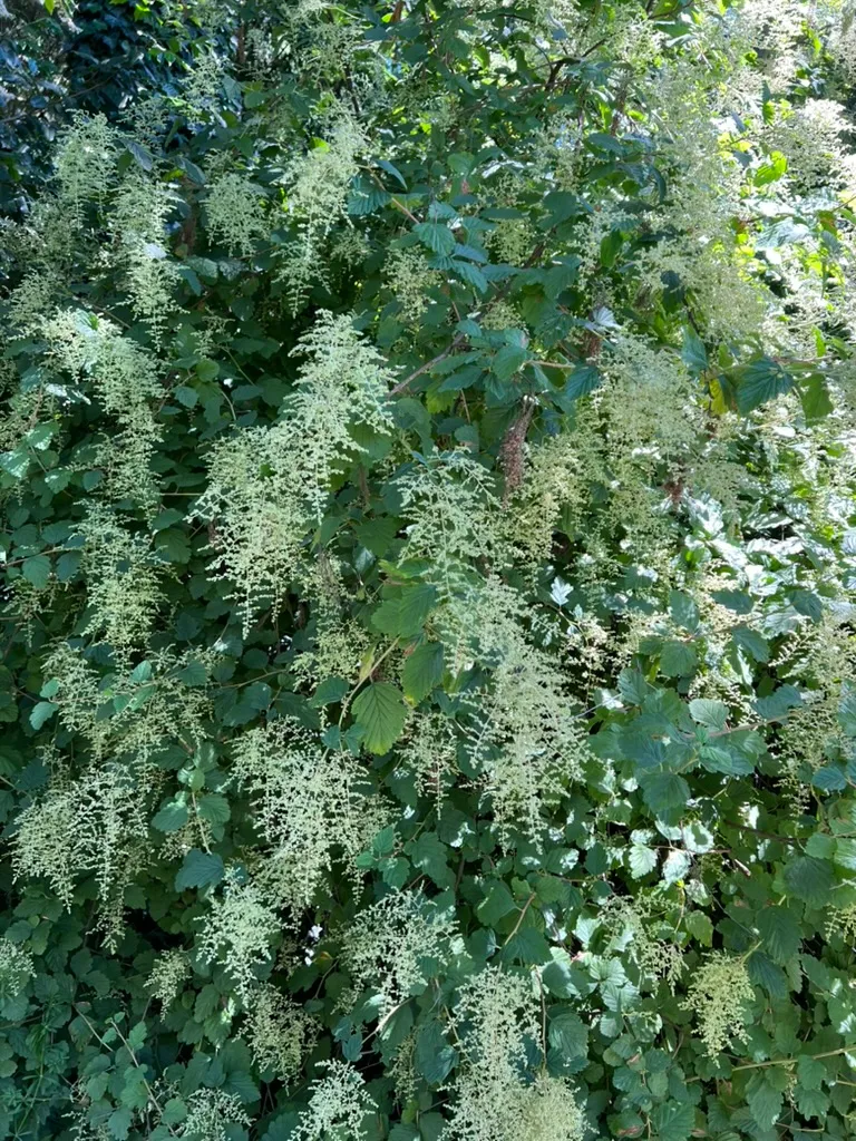creamy white; hundreds of tiny five-petaled flowers in cascading, finely branched plumes 4–12 inches — resembling ocean spray or sea foam; June–July; mildly fragrant; exceptional butterfly and bee attraction; dries rusty-tan persisting through winterFoliage Description