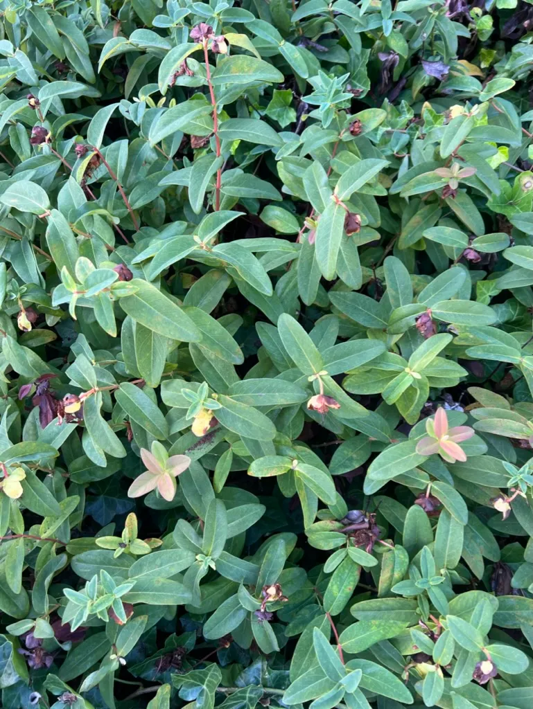 A low-growing, semi-evergreen to evergreen sub-shrub reaching 12–18 inches (30–46 cm) tall and spreading indefinitely by stoloniferous runners to form dense mats. Stems are square in cross-section, green to reddish-brown, upright to slightly arching. Leaves are opposite, simple, oblong to ovate, 2–4 inches (5–10 cm) long and 0.75–1.5 inches (2–4 cm) wide, blue-green above, paler beneath, with translucent glandular dots visible when held to light—a characteristic of the genus. Flowers are solitary or in few-flowered cymes at stem tips, 2–3 inches (5–8 cm) across, with 5 bright yellow petals and a central mass of approximately 200 stamens that radiate outward 0.75–1 inch (2–2.5 cm) long. Bloom period extends from June through September in zones 6–8. Growth rate is moderate to fast; a single plant fills a 3-foot (0.9 m) area within 2 years via underground runners. Foliage is evergreen in zones 8–9, semi-evergreen in zone 7, and dies back to the ground in zones 5–6, regrowing from the roots. Leaves may develop purplish-red discoloration in cold weather. Spreads aggressively in favorable conditions and may displace adjacent plantings if not edged or contained.