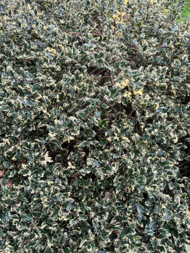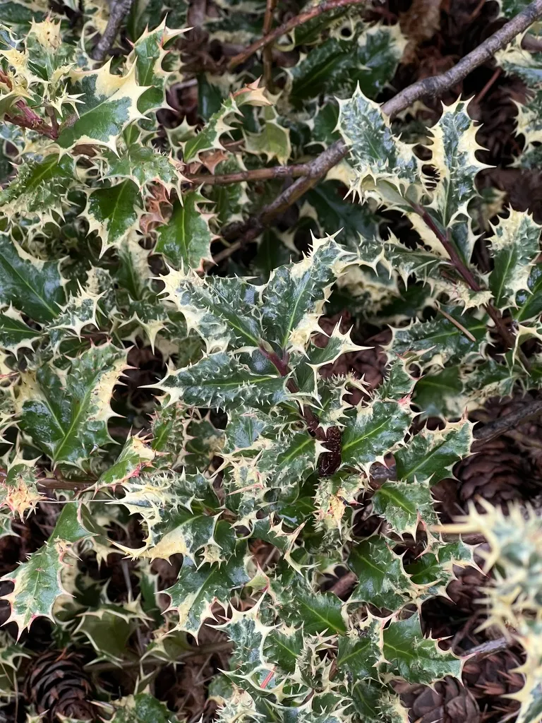 A cultivar of Ilex aquifolium forming a dense, upright evergreen shrub or small tree reaching 10-20 feet (3-6 m) tall and 8-12 feet (2.4-3.6 m) wide at maturity. Growth rate is very slow, typically 4-8 inches (10-20 cm) per year, noticeably slower than the species type. This cultivar is distinguished by leaves that bear spines not only along the undulating margins but also erupting from the upper leaf surface, giving a prickly, hedgehog-like texture. Leaves are 1.5-3 inches (4-8 cm) long with irregular cream-white to silver-white margins surrounding a gray-green to dark green center, often with gray-green mottling. The variegation is most pronounced in full sun; plants grown in heavy shade produce leaves with less contrast and more green coloring. This is a male clone and does not produce berries. Young stems are green to purple, becoming gray with age. The combination of surface spines and variegation makes this one of the most texturally distinct holly cultivars. Hardy to approximately 0°F (-18°C). Like the species, it is susceptible to holly leaf miner, though damage is less conspicuous on variegated foliage. Branches that revert to all-green foliage should be removed promptly, as reverted shoots are more vigorous and will eventually dominate if left.