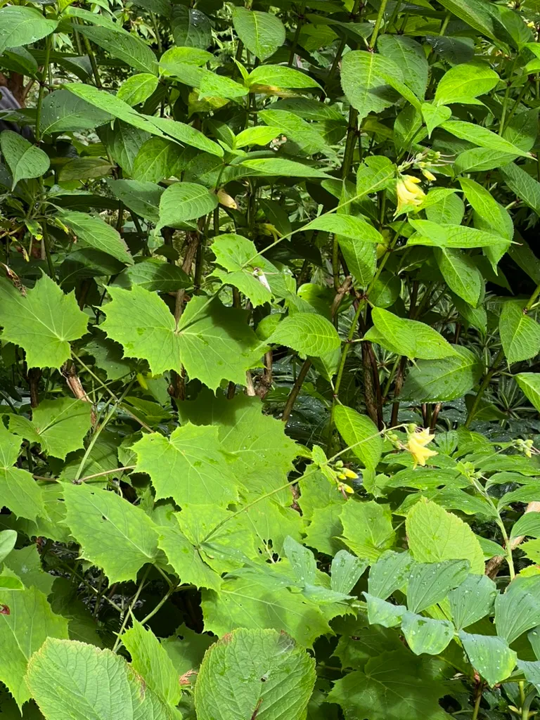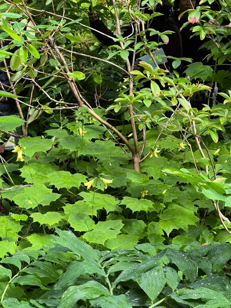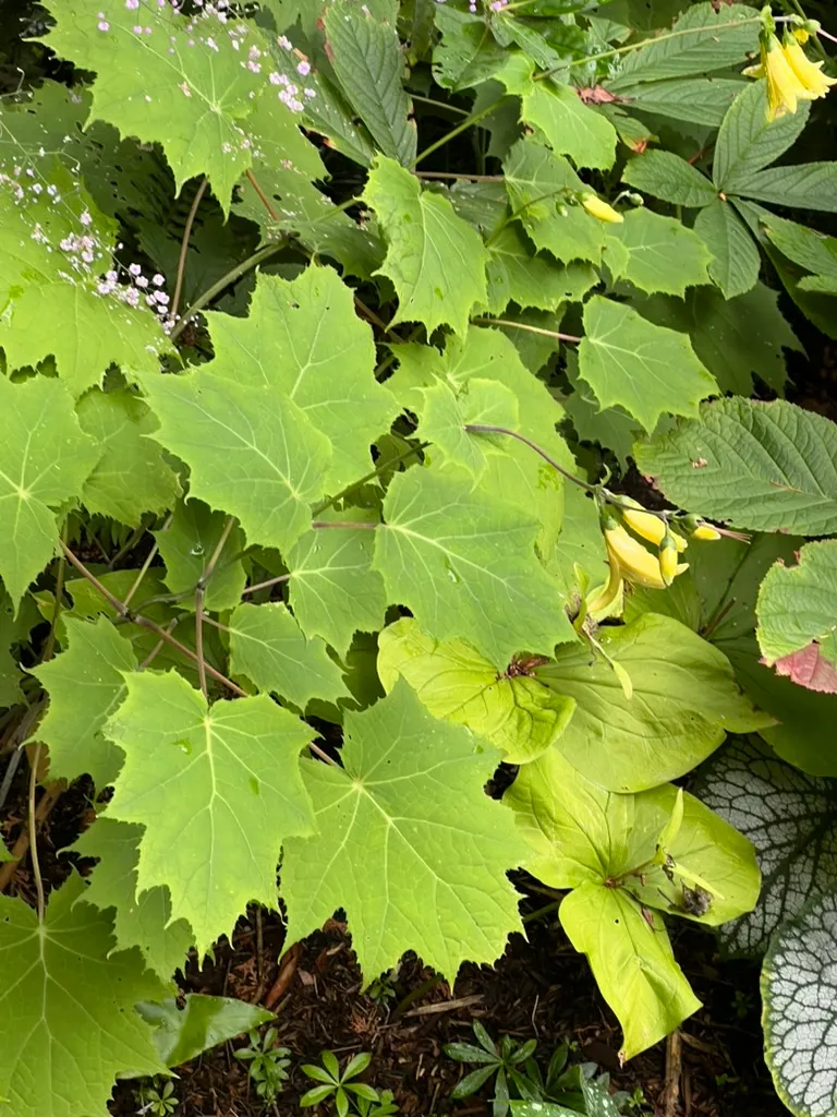 A clump-forming, late-season perennial in the family Hydrangeaceae, native to the mountain woodlands of Japan and Korea. Plants form upright, arching clumps 3–4 feet (90–120 cm) tall and 3–4 feet (90–120 cm) wide of large, maple-like, palmately lobed leaves 4–8 inches (10–20 cm) across on dark purplish-black stems. The bold foliage creates an exceptional tropical effect in shaded settings. From late summer to early fall, slender arching stems bear loose clusters of nodding, narrowly bell-shaped to tubular flowers 1–1.5 inches (2.5–4 cm) long in soft, waxy, clear yellow — a rare flower color in shade plants. The petals are thick and waxy in texture, giving flowers a sculptural quality. Flowers open slowly from the base of each cluster upward over 3–4 weeks. Kirengeshoma is one of very few shade perennials that blooms reliably in late summer and early fall with yellow flowers. Hardy in zones 5–8; not heat-tolerant in zones 8–9 without afternoon shade and consistent moisture.