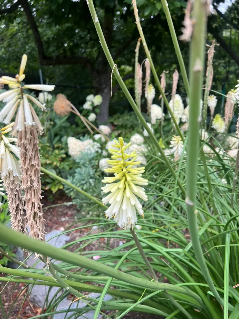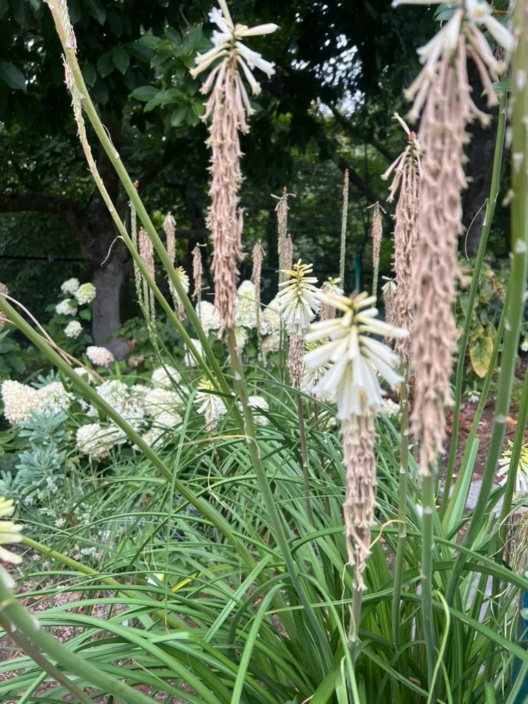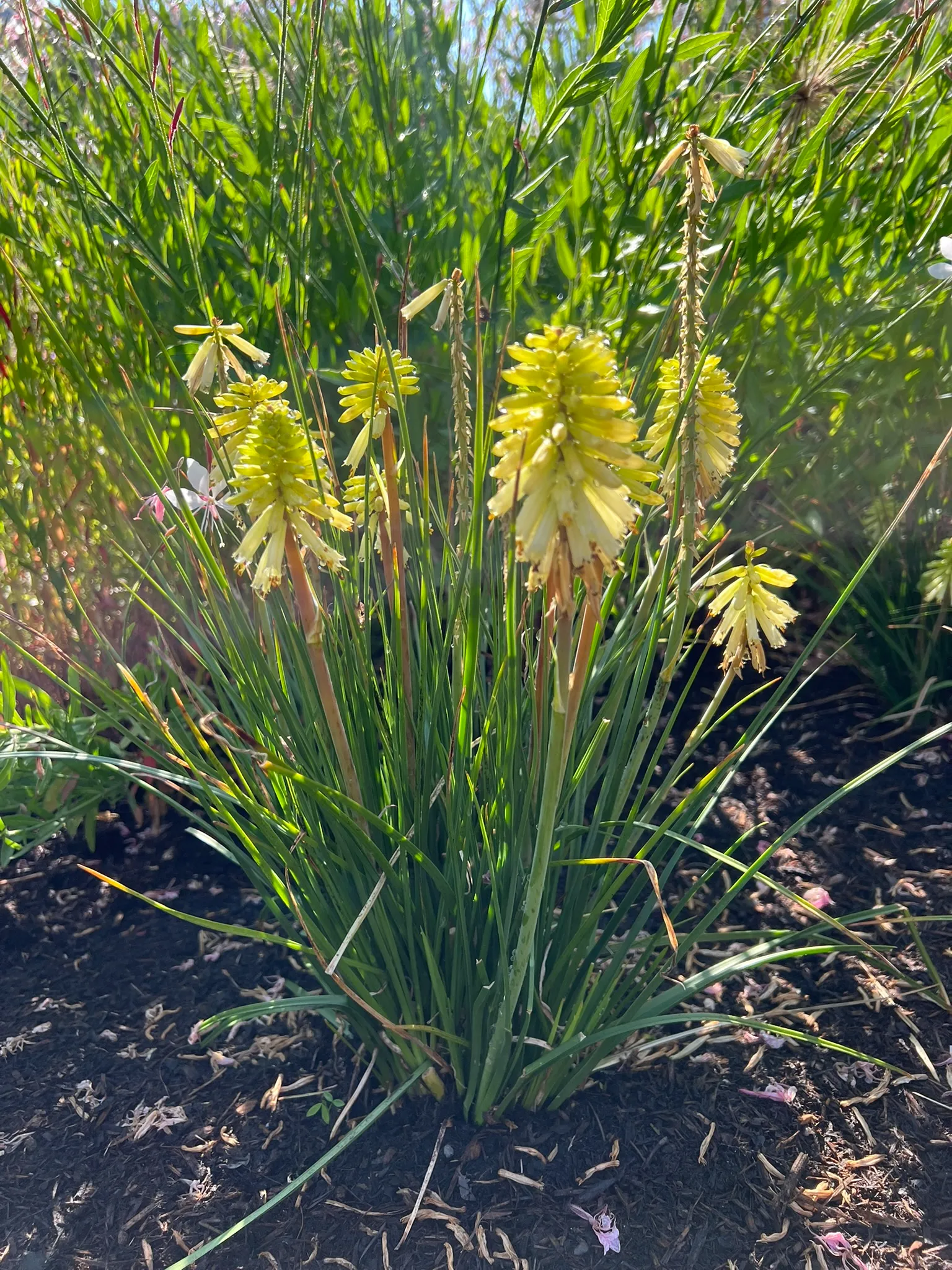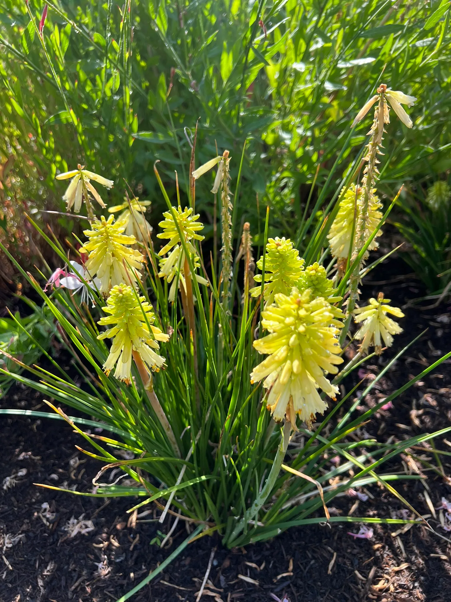 A clump-forming perennial reaching 24–60 inches (60–150 cm) tall in bloom and 18–36 inches (45–90 cm) wide, depending on the hybrid. Leaves narrow, strap-like to grass-like, 18–36 inches (45–90 cm) long and 0.5–1 inch (1.2–2.5 cm) wide, arching, mid- to dark green, forming dense basal clumps. Flower spikes erect on stout stems above the foliage, bearing dense cylindrical racemes of pendent tubular florets 1–1.5 inches (2.5–4 cm) long. The classic bicolor effect — orange-red to scarlet buds opening downward to yellow or cream — gives the characteristic torch appearance, though modern hybrids include single-color selections in white, cream, yellow, coral, orange, and red. Bloom season varies by hybrid: early-season types bloom May through June, mid-season July through August, and late-season September through October. Excellent hummingbird plant. Hardy in USDA zones 5–9 depending on the hybrid; drainage in winter is critical to cold hardiness.