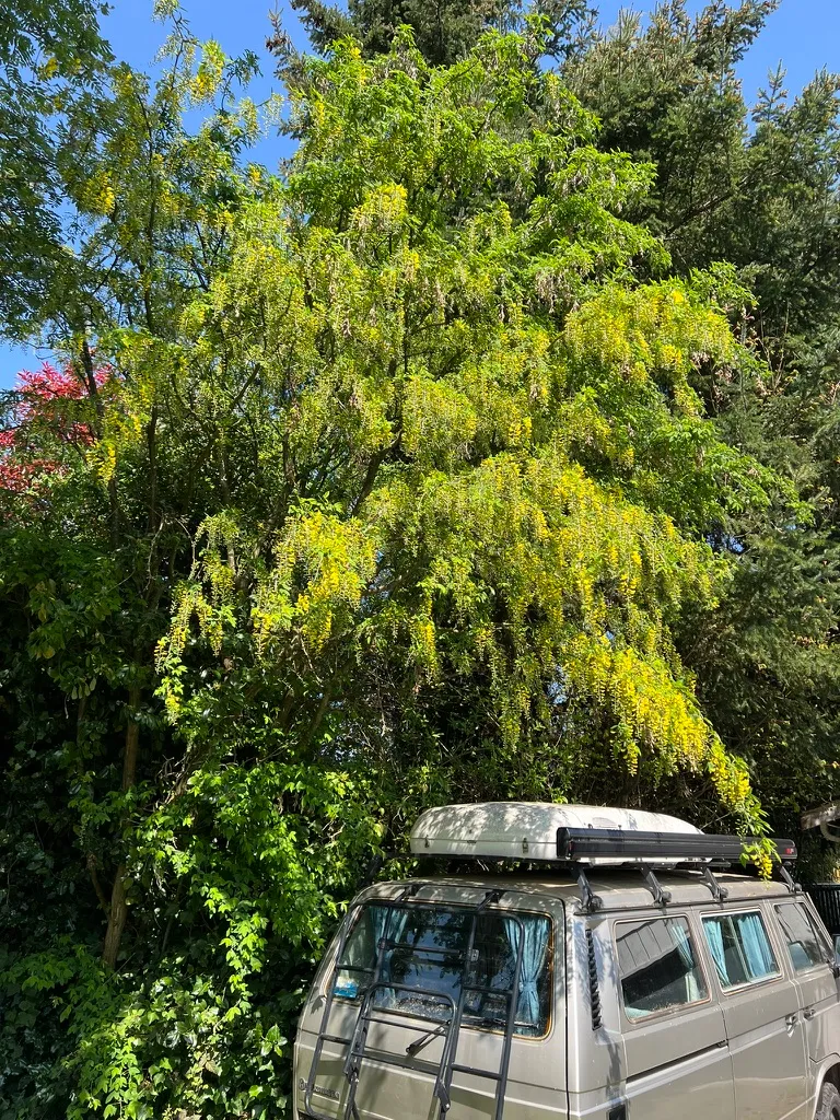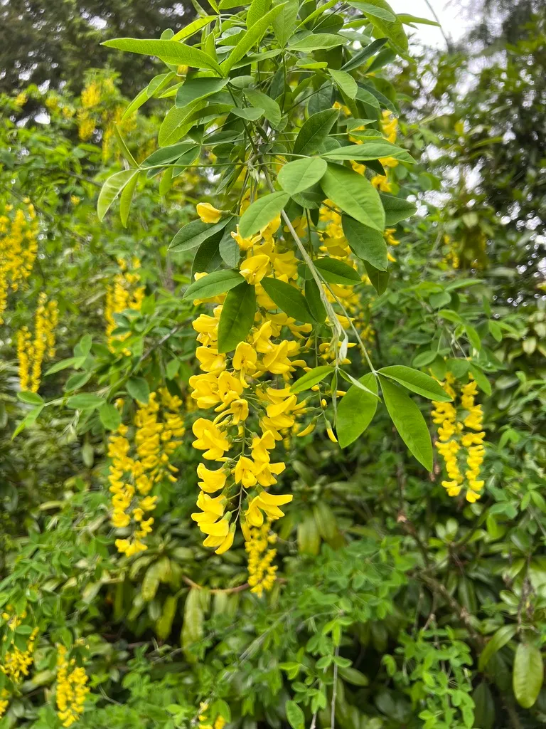 Laburnum anagyroides is one of the most spectacular small flowering trees for Pacific Northwest gardens, delivering a brief but stunning cascading golden display in May unmatched by any other small tree of comparable hardiness. Outstanding as a specimen in mixed borders and shrubberies, or trained over a pergola or arch to create a laburnum tunnel effect. All parts are highly toxic — site carefully away from areas used by young children; the hybrid Laburnum x watereri 'Vossii' with its reduced seed set is generally recommended over the species for family gardens. A Great Plant Pick for Pacific Northwest gardens. Excellent combined with Allium, Wisteria, and late spring bulbs.How to Identify