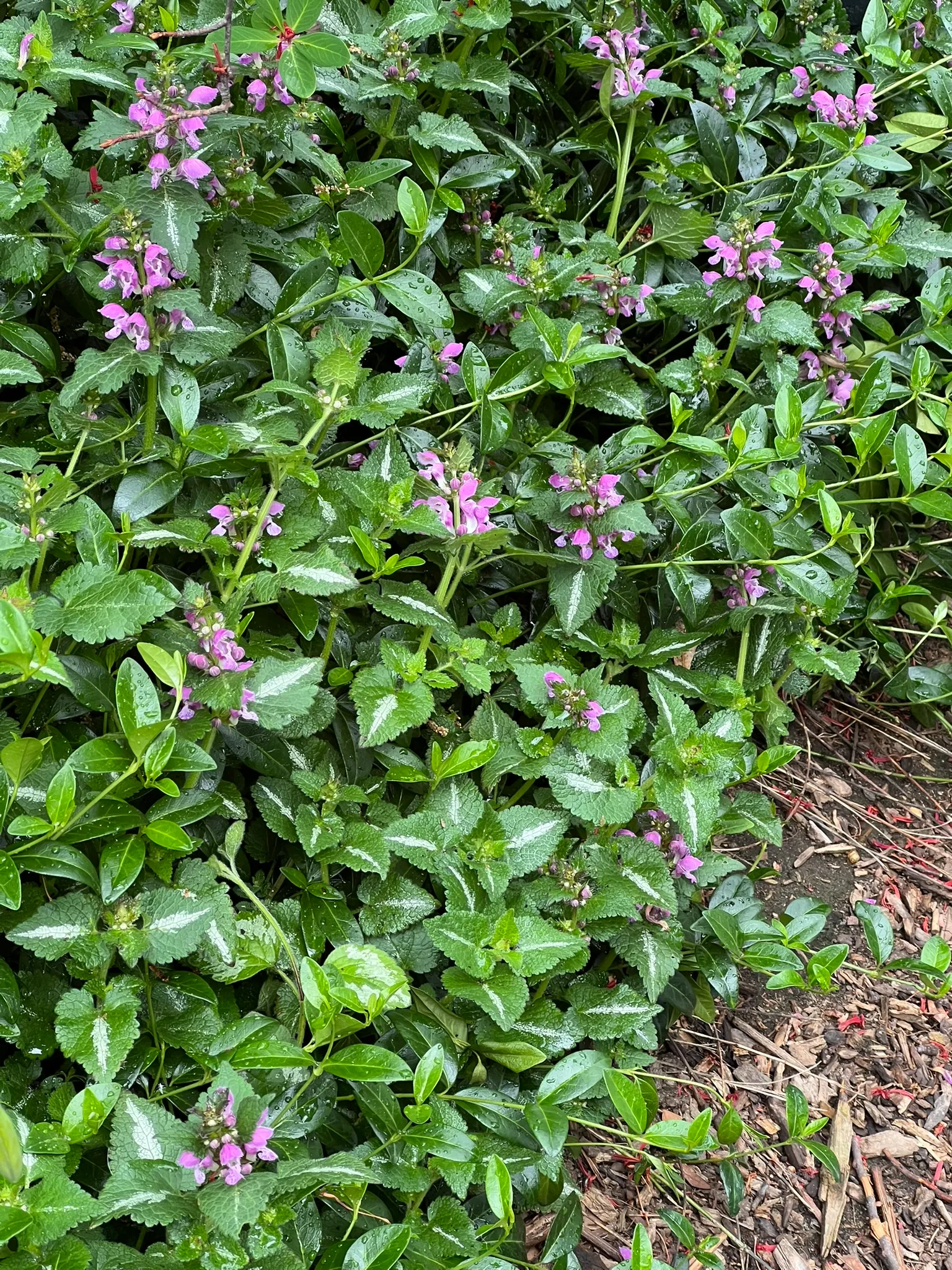 Plant spotted deadnettle in partial to full shade in moist, moderately fertile, well-drained soil. The species is tolerant of a wide range of soil conditions but performs best with consistent moisture; it may go summer-dormant or look ragged in hot, dry positions. In Pacific Northwest gardens it is one of the most reliable shade groundcovers and requires minimal care once established. Shear the entire planting back by half in late June or July after the first bloom flush to refresh the foliage, promote a second flowering, and prevent the plant from looking untidy. Divide or thin spreading mats every two to three years in spring if they become too aggressive.Pruning