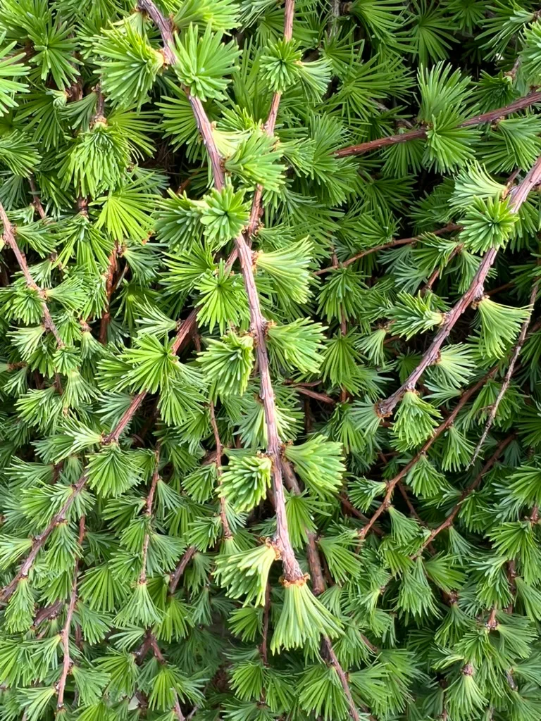 Larix species are deciduous conifers — unusual among needle-leaved trees in dropping all foliage annually. Depending on species, they reach 40-100 feet (12-30 m) tall with conical to broadly pyramidal crowns 15-40 feet (4.5-12 m) wide. Needles are soft, flexible, and 0.75-2 inches (2-5 cm) long, arranged in dense clusters of 10-50 on short spur shoots and singly on elongating long shoots. Spring foliage emerges bright lime-green, matures to medium to blue-green in summer, then turns golden-yellow before dropping in autumn. Small upright seed cones 0.5-1.5 inches (1.3-4 cm) long, initially red to purple at emergence, mature to brown and persist on branches for several years. Bark on mature trees is thick, furrowed, and reddish-brown to gray. Growth rate varies by species but is generally moderate to fast, adding 12-24 inches (30-60 cm) annually. Root systems are moderately deep. Larches are among the most cold-tolerant of all trees, with some species surviving temperatures below -60°F (-51°C). Several species are cultivated, including Larix decidua (European larch), Larix kaempferi (Japanese larch), and Larix occidentalis (western larch), each with differing mature sizes and regional adaptations. Susceptible to larch casebearer and larch sawfly in some regions.