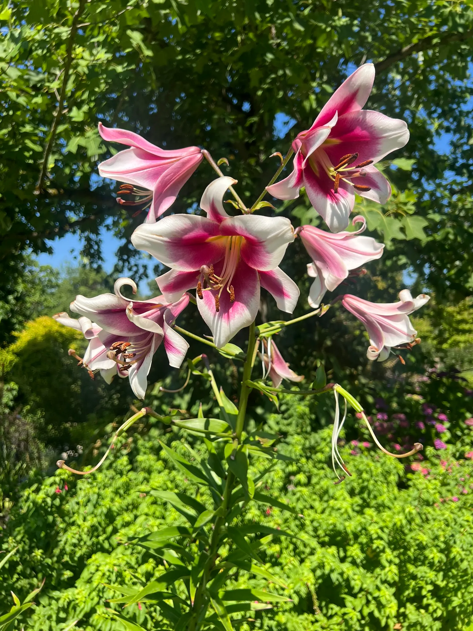 Orienpet lily hybrids (also called OT hybrids or trumpet-oriental crosses, Division VII) are a relatively recent development in lily breeding, combining the tall, sturdy stems and hardiness of Trumpet lilies with the large, intensely fragrant flowers of Oriental lilies. Plants grow from large, scaly bulbs producing robust, erect stems 4–7 feet (120–210 cm) tall with abundant, lance-shaped leaves. In mid to late summer, stems bear 6–20 or more outward-facing to slightly nodding flowers 6–10 inches (15–25 cm) across with broad, overlapping tepals in white, cream, yellow, orange, peach, pink, red, and bicolors — often with darker centers or picotee edges. Fragrance is strong to very strong, intermediate between the heavy Oriental scent and the lighter Trumpet fragrance. Orienpet hybrids are significantly more vigorous and heat-tolerant than pure Oriental lilies and are hardy in zones 4–9. Well-known cultivars include 'Black Beauty', 'Scheherazade', 'Boogie Woogie', and the 'Silk Road' series. Caution: highly toxic to cats.