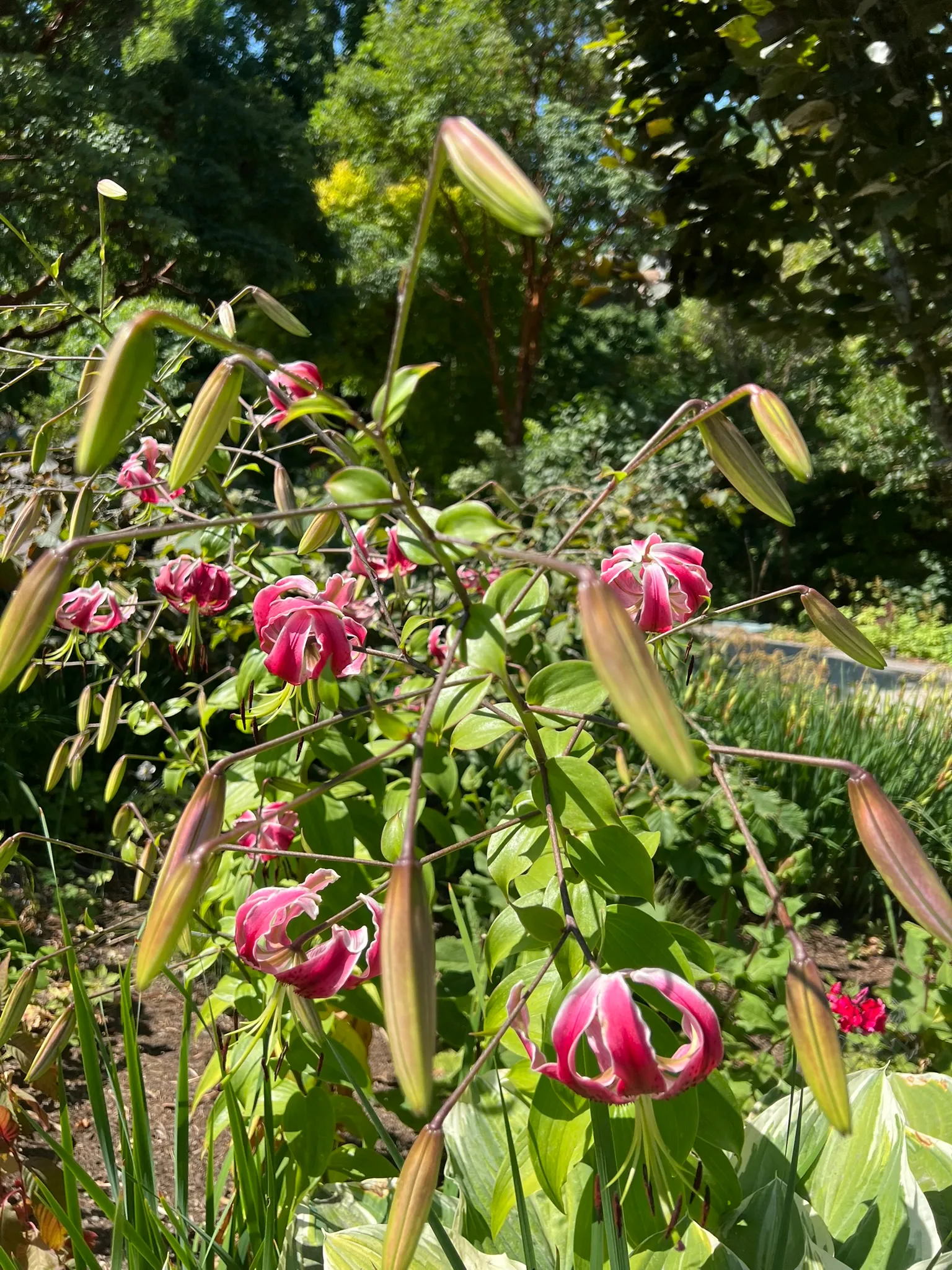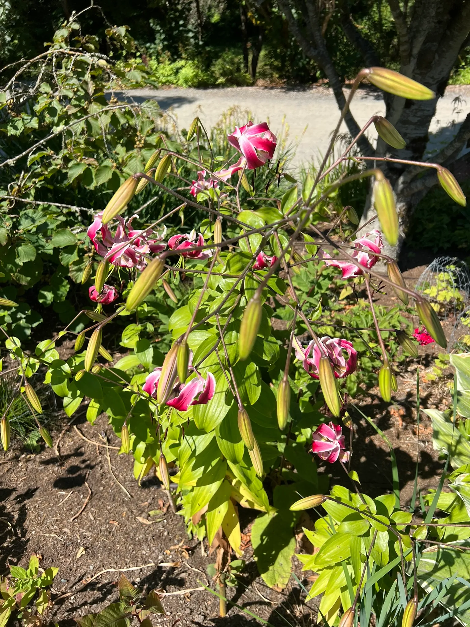 Plant bulbs in fall or spring 6 inches (15 cm) deep and 12–18 inches (30–45 cm) apart in full sun to partial afternoon shade in well-drained, fertile, acidic soil with a pH of 5.5–6.5. Oriental lilies require more acidic conditions than other lily groups — alkaline soils cause yellowing and decline. Mulch heavily to keep the root zone cool and moist. Water consistently during growth; reduce after foliage yellows. Apply an acid-forming fertilizer as shoots emerge. Stake tall cultivars. All parts are highly toxic to cats — lethal in small quantities.Pruning