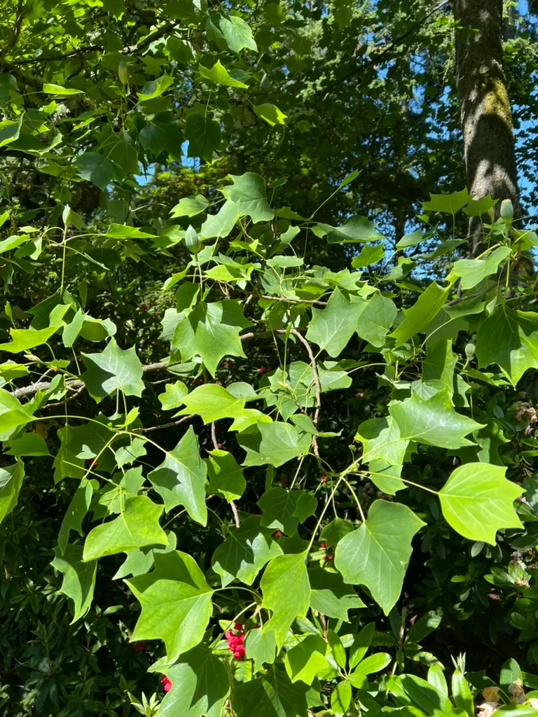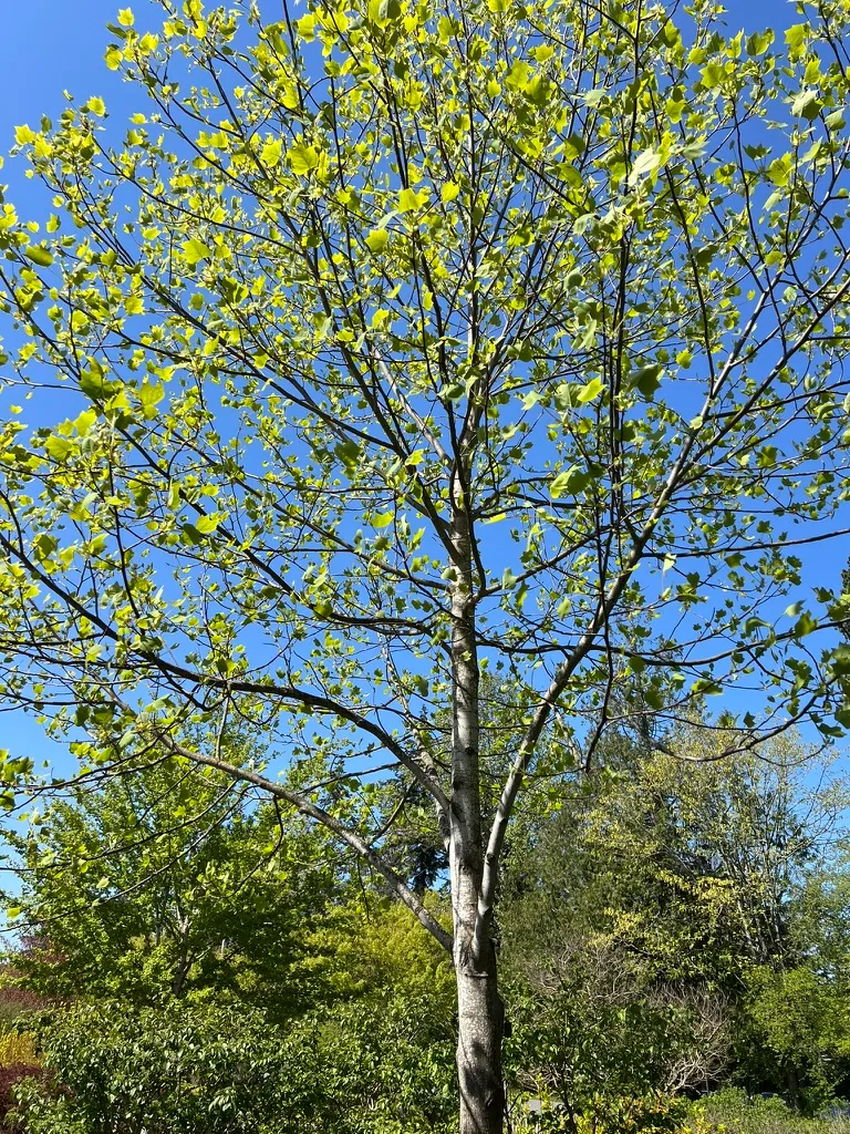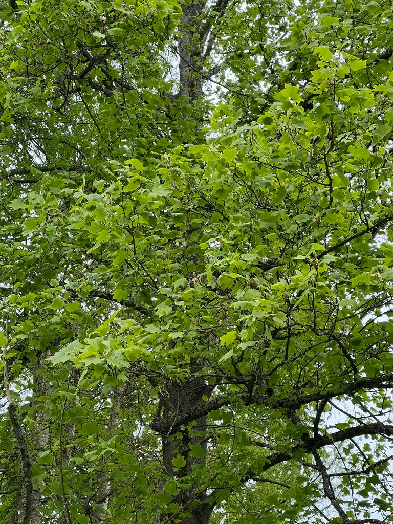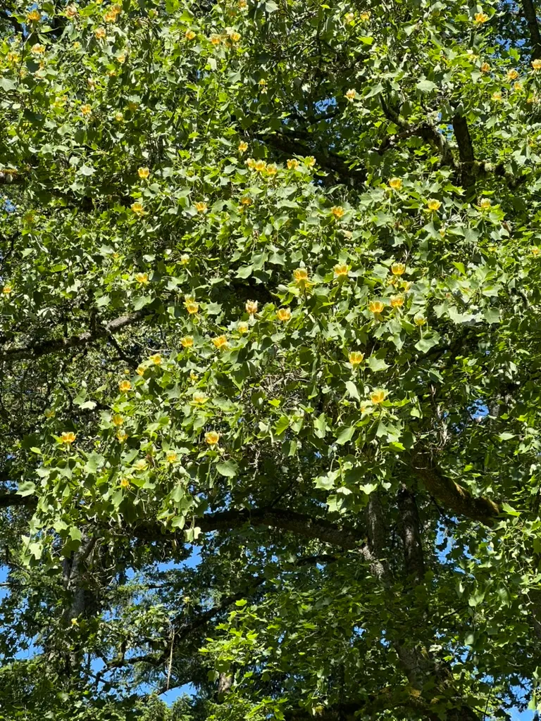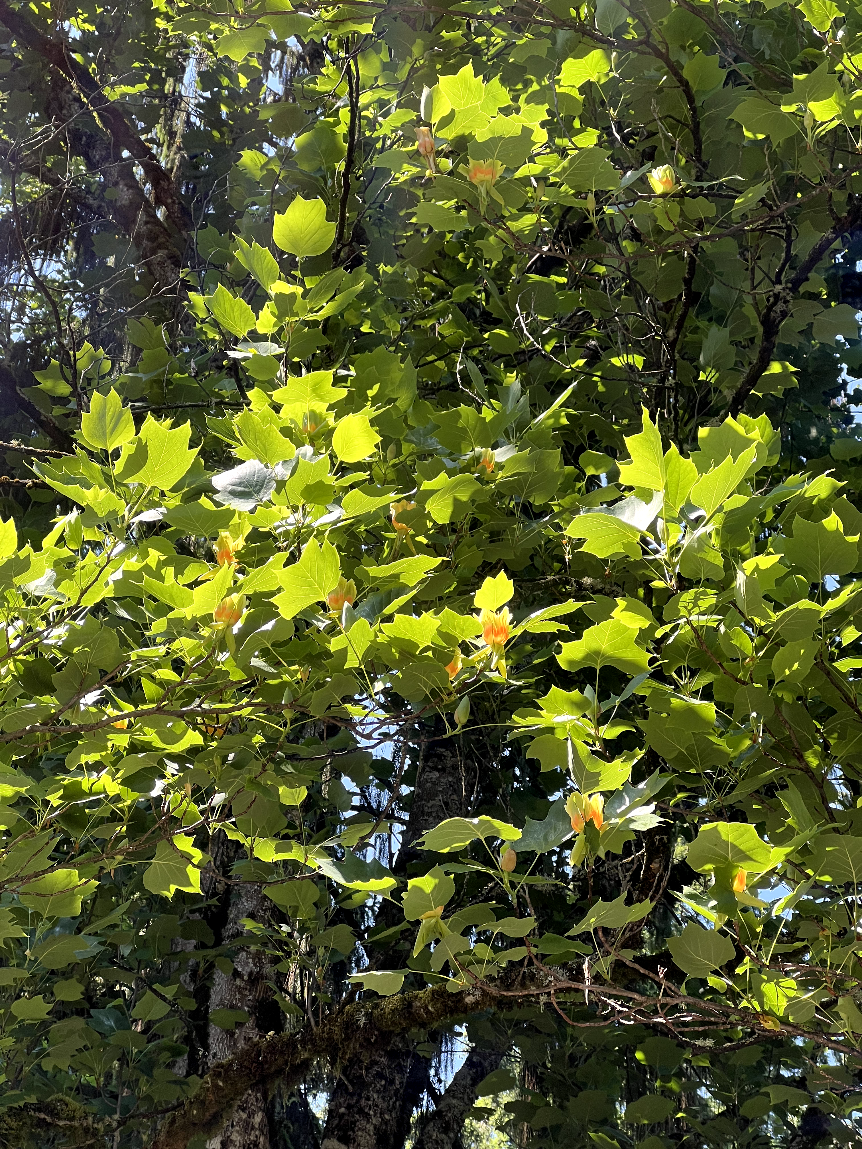 A large to very large deciduous tree reaching 60–90 feet (18–27 m) tall and 30–50 feet (9–15 m) wide, native to eastern North America and valued for its distinctive foliage, architectural form, and late-spring flowers. Leaves uniquely 4-lobed with a distinctively flattened or notched tip, 3–6 inches (7.5–15 cm) wide. Mature trees produce tulip-shaped flowers 2–3 inches (5–7.5 cm) across in May–June — pale yellow-green with an orange band — borne high in the canopy. Fall color a clear uniform butter-yellow. A rapid grower requiring ample space. Highly attractive to bees and hummingbirds when in flower. Hardy in USDA zones 4–9.