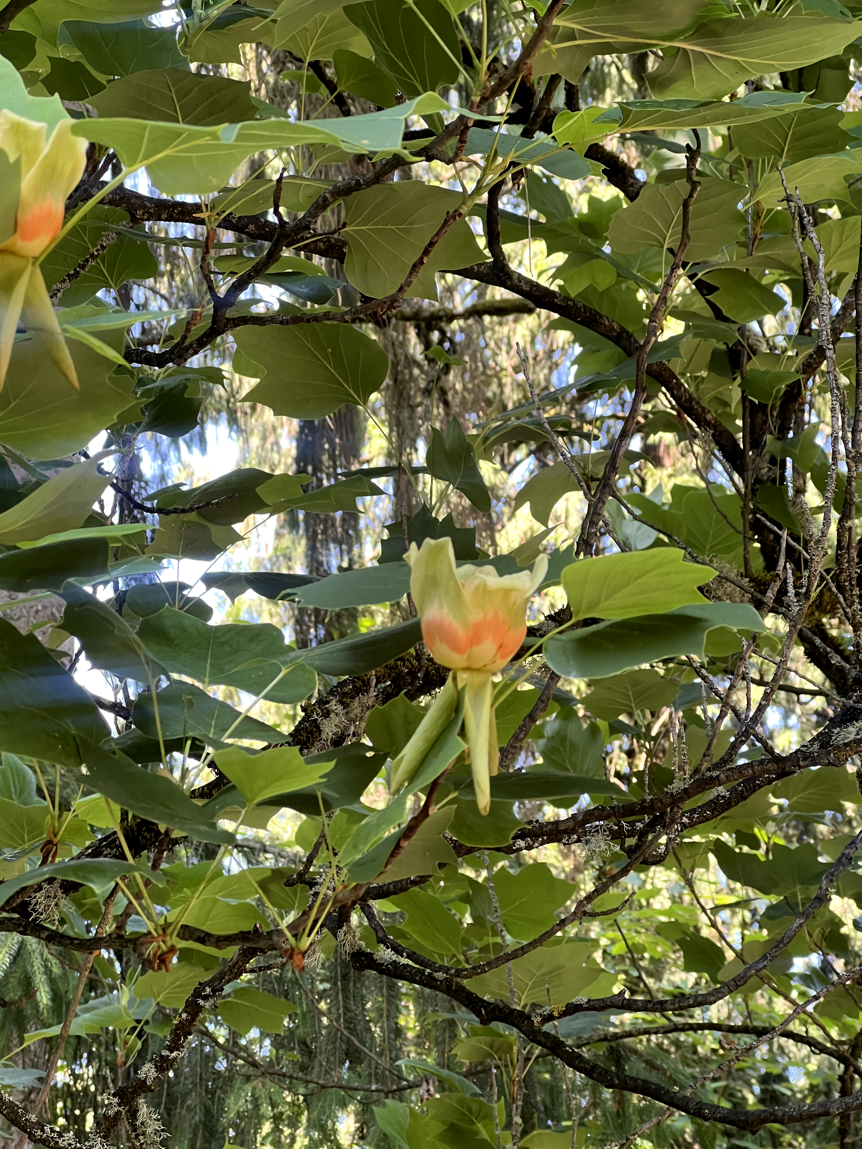Tulip-shaped, 2–3 inches (5–7.5 cm) across; pale yellow-green with orange-yellow band at the base of each petal; borne high in canopy on mature treesFoliage Description