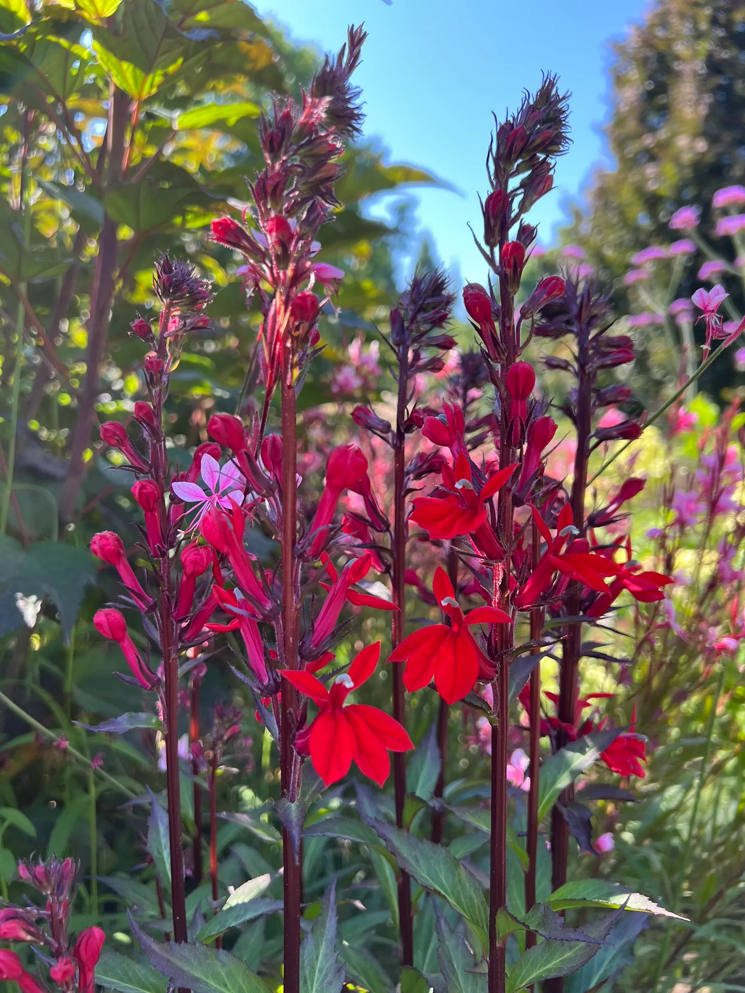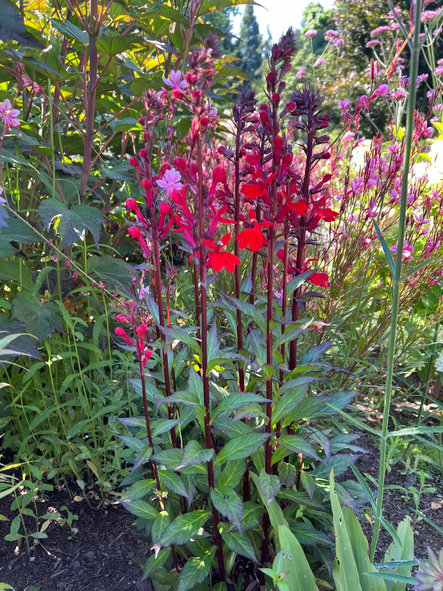 An upright, short-lived native perennial in the family Campanulaceae, native to moist meadows, stream banks, seeps, and wet woodland edges across eastern and central North America. Plants form clumps of basal rosettes that overwinter, sending up erect stems 24–48 inches (60–120 cm) tall in summer, clothed in alternate, lance-shaped leaves 2–5 inches (5–13 cm) long, medium to dark green and often tinged reddish-bronze, especially in red-leaved cultivars. From midsummer through early fall, terminal racemes 8–18 inches (20–45 cm) long bear densely packed, intensely scarlet-red, two-lipped tubular flowers 1.5 inches (4 cm) long with a distinctive three-lobed lower lip and two erect upper petals. The vivid red color is one of the most saturated in the temperate perennial palette. Cardinal flower is a primary nectar source for ruby-throated hummingbirds during their late-summer southward migration. Plants are short-lived (2–4 years) but self-seed in suitable moist conditions and produce offsets that maintain the colony. All parts of the plant are toxic if ingested — an alkaloid, lobeline, causes symptoms similar to nicotine poisoning.