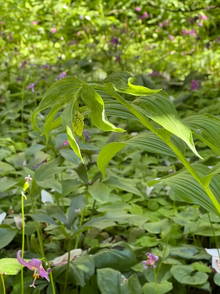 A rhizomatous, colony-forming, deciduous herbaceous perennial in the family Asparagaceae, native to moist to dry woodlands, forest edges, and shaded slopes from Alaska south through British Columbia, Washington, and Oregon to California and across most of North America. The specific epithet racemosum means 'having racemes,' though the flowers are technically borne in a branched panicle (not a true raceme). The PNW population is referable to subspecies amplexicaule, in which the leaf bases clasp the stem directly without a petiole — a useful field distinction from the eastern subspecies. Plants grow 1.5–3 feet (45–90 cm) tall with arching, unbranched stems bearing 7–15 alternate, lance-shaped to elliptic, bright green leaves 3–6 inches (8–15 cm) long with prominent parallel veins and a clasping base. From May through June, the stem tip produces a large, branched, feathery, pyramidal panicle 2–5 inches (5–13 cm) long of dozens to hundreds of small, creamy-white, sweetly fragrant, six-parted flowers. Berries ripen from green with dark red stripes to bright red by August–September and are consumed by grouse, thrushes, and small mammals. Berries are mildly toxic to humans in quantity (purgative). Fragrant flowers are a reliable identification character.