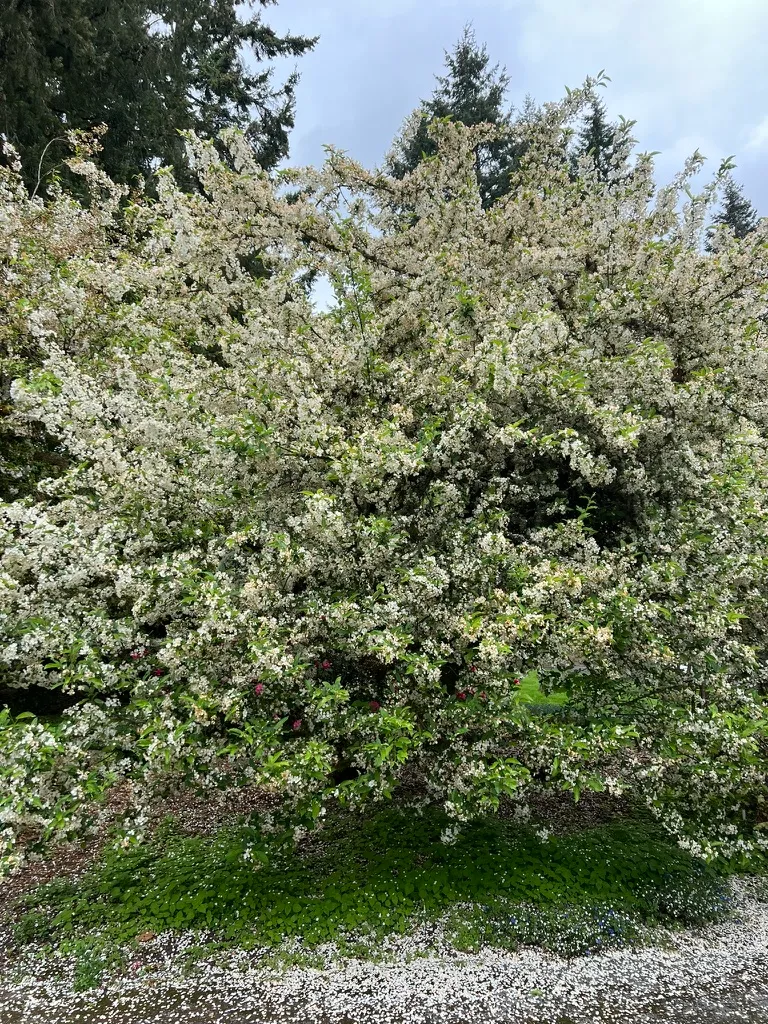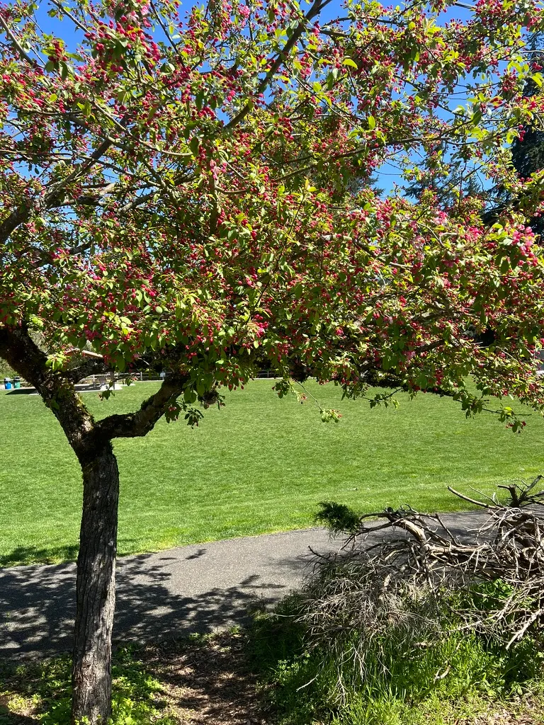 A genus of approximately 35 species of deciduous trees grown in Pacific Northwest gardens for spectacular spring flowering, ornamental small fruits, and multi-season interest. Ornamental crabapples range from 8–25 feet (2.4–7.5 m) tall with habits from weeping to columnar to broadly rounded. Spring flowers in white, pink, rose, or deep red-purple, 1–2 inches (2.5–5 cm) across, in April–May; many are fragrant. Small fruits 0.5–1 inch (12–25 mm) diameter in red, orange, gold, or yellow, ripening in fall and often persisting through winter to provide bird food. Apple scab (Venturia inaequalis) is the primary disease concern in the wet Pacific Northwest — disease-resistant cultivar selection is critical. Seeds mildly toxic to pets. Hardy in USDA zones 4–8.