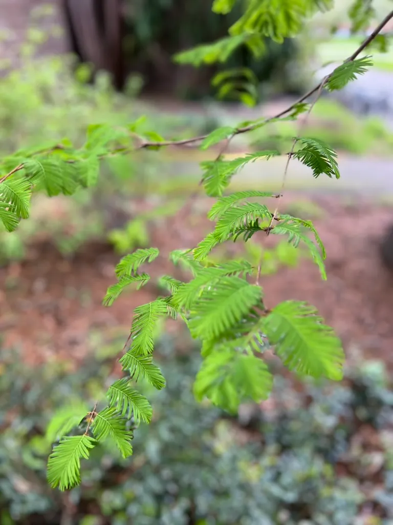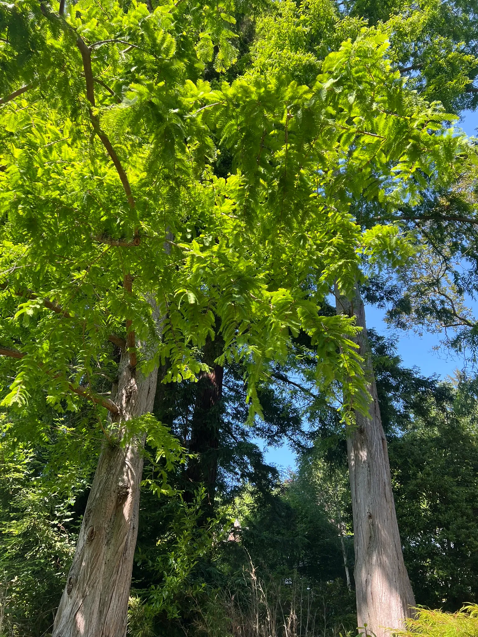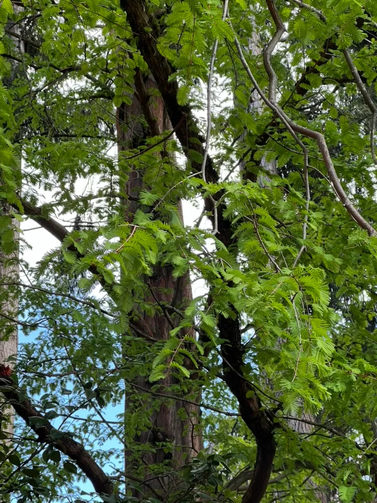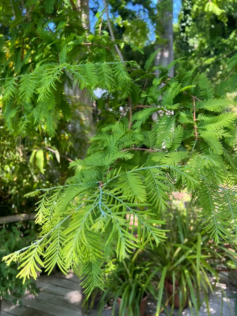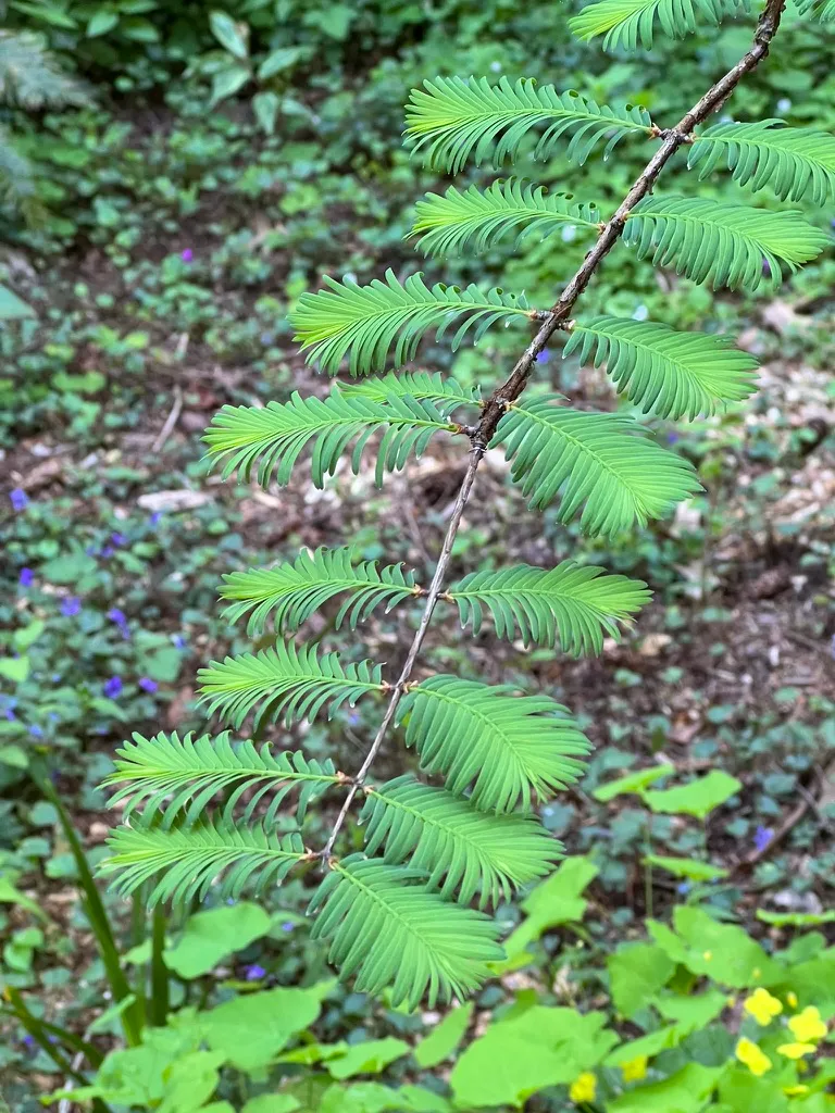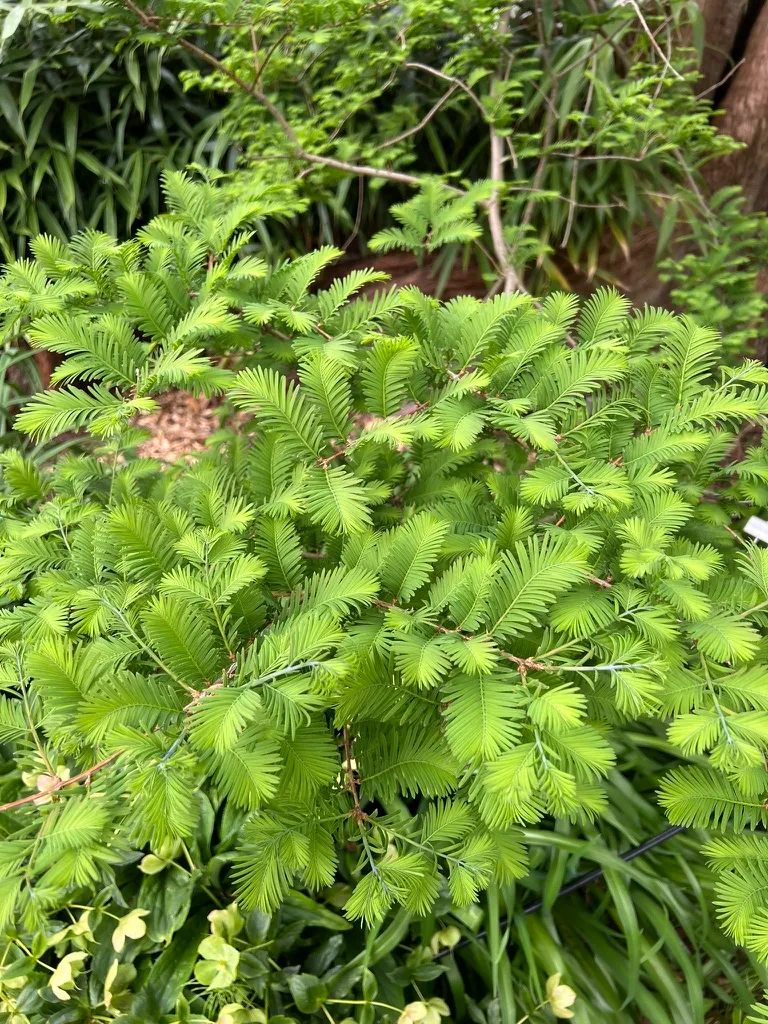 A large deciduous conifer reaching 70-100 feet (21-30 m) tall and 25-35 feet (7.5-10.5 m) wide at maturity, with a strongly pyramidal to conical form. Growth rate is fast, among the most rapid of temperate-zone conifers, adding 18-36 inches (45-90 cm) per year in favorable conditions. Known only from the fossil record until living specimens were discovered in Hubei Province, China, in 1944, making it one of the most notable botanical discoveries of the 20th century. Leaves are linear, flat, 0.5-0.75 inches (1.3-2 cm) long, arranged oppositely in two ranks along deciduous branchlets (an unusual feature among conifers — most have alternately arranged needles). Foliage emerges light green in spring, deepens to medium green in summer, and turns russet-orange to coppery-bronze before dropping in late fall, along with the entire branchlet (the branchlets, not just the needles, are deciduous). Bark is reddish-brown, fibrous, and vertically fissured on mature trunks, becoming deeply furrowed with a spongy texture. The trunk develops a pronounced buttressed, fluted base with age, which is one of the tree's most distinctive features. Male and female cones are produced on the same tree; pollen cones are pendulous in axillary clusters; seed cones are globose, approximately 0.75 inches (2 cm) in diameter, green maturing to brown. Root system develops prominent surface roots near the trunk. Hardy to approximately -20°F (-29°C). Tolerates wet and even periodically waterlogged soils, reflecting its native habitat along stream banks.