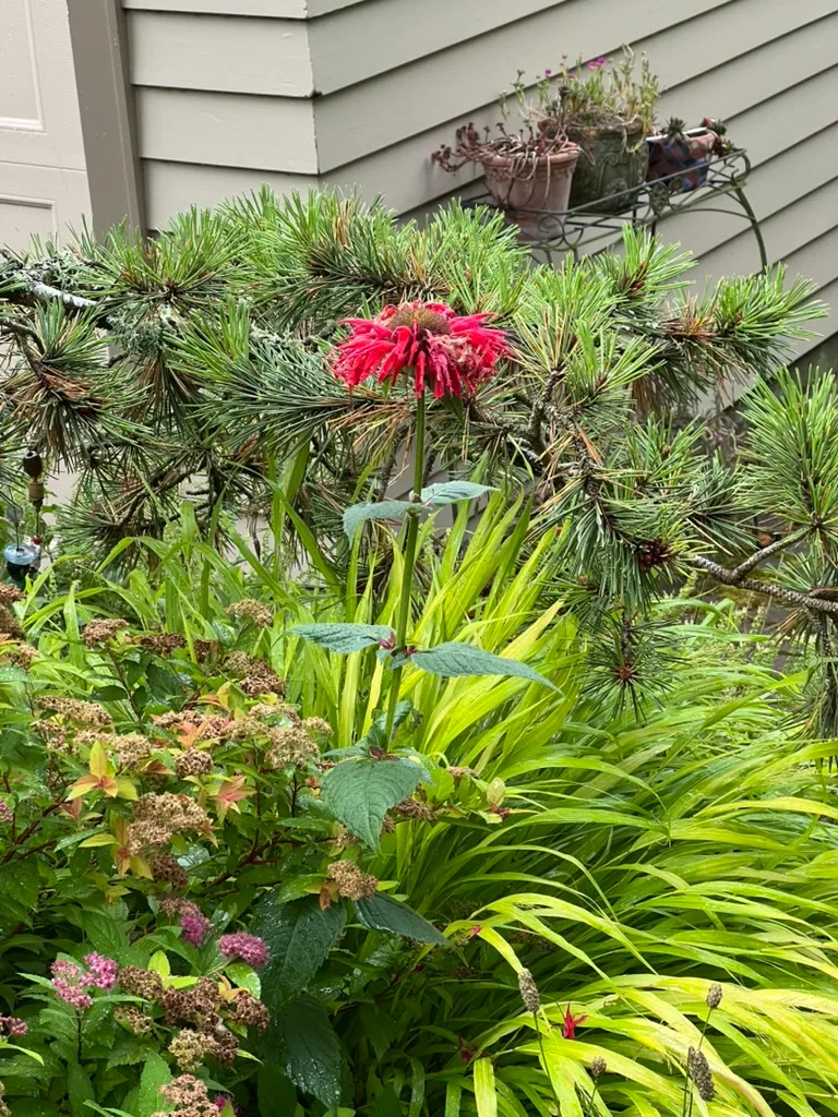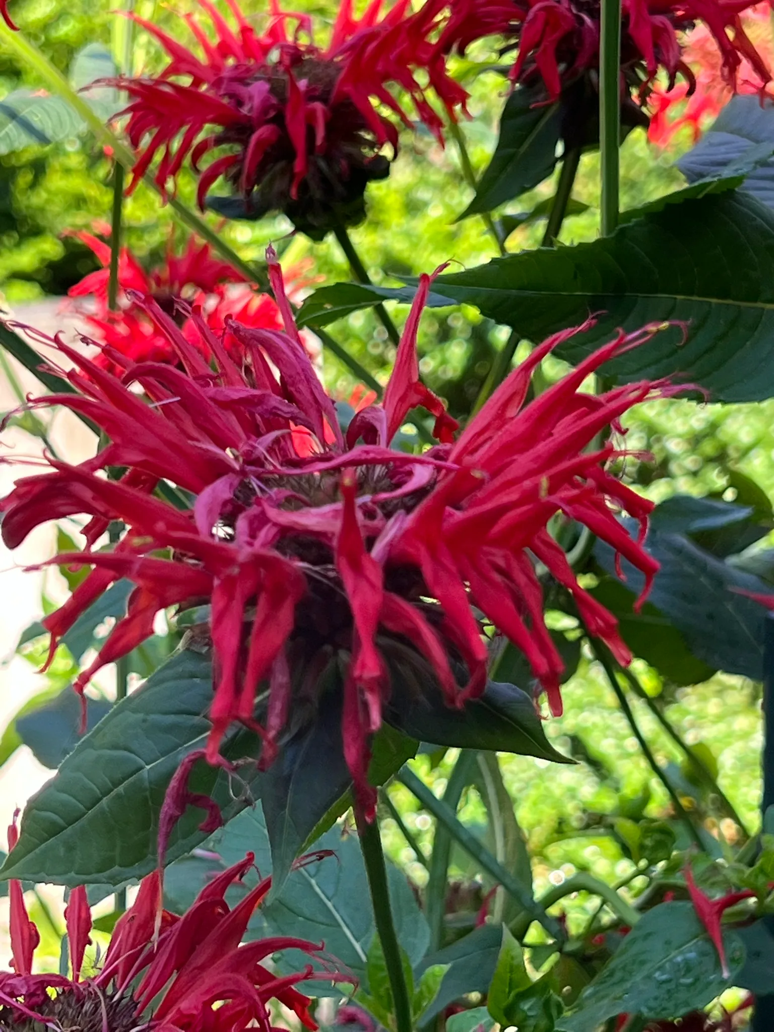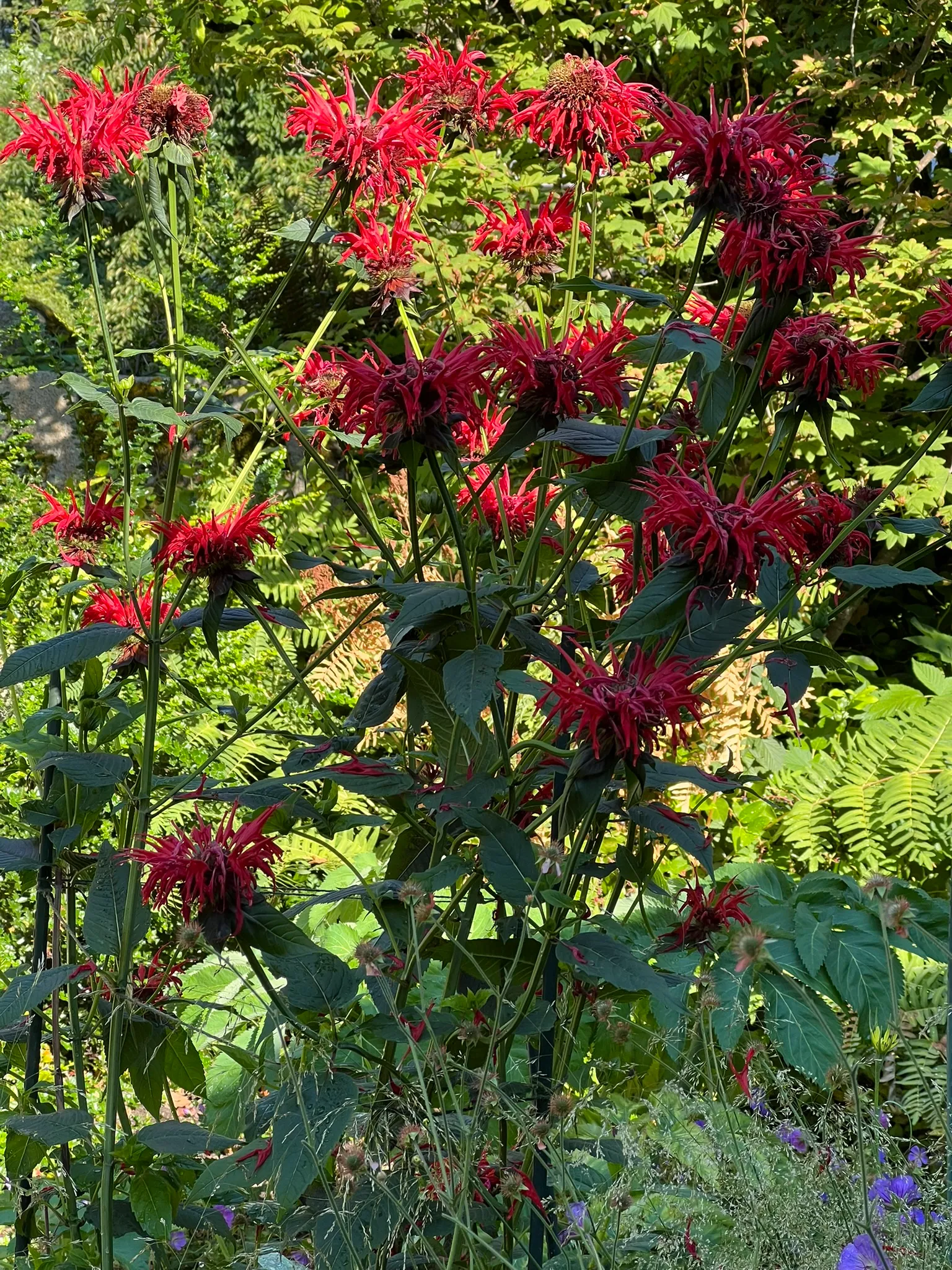 An upright, spreading native perennial in the family Lamiaceae, native to moist, rich woodlands, stream banks, and clearings of eastern North America. Plants spread by shallow rhizomes to form colonies of square stems 24–48 inches (60–120 cm) tall bearing opposite pairs of lance-shaped to ovate, sharply toothed, aromatic leaves 2–4 inches (5–10 cm) long. When crushed, the leaves release a strong, pleasant oregano-bergamot fragrance. In midsummer, each stem is topped with a dense, rounded flower head 1.5–3 inches (4–8 cm) across composed of numerous long, tubular, two-lipped florets in vivid scarlet-red in the species; cultivars extend the color range to pink, lavender, purple, and white. Red-flowered plants are the most attractive to ruby-throated hummingbirds. The primary horticultural challenge with M. didyma is powdery mildew, a fungal disease that disfigures foliage from midsummer onward; modern mildew-resistant cultivars ('Jacob Cline', 'Raspberry Wine', 'Fireball', and the 'Bee-You' series) are strongly preferred over older types. All parts edible; traditional use as a tea (Oswego tea) by the Oswego people.