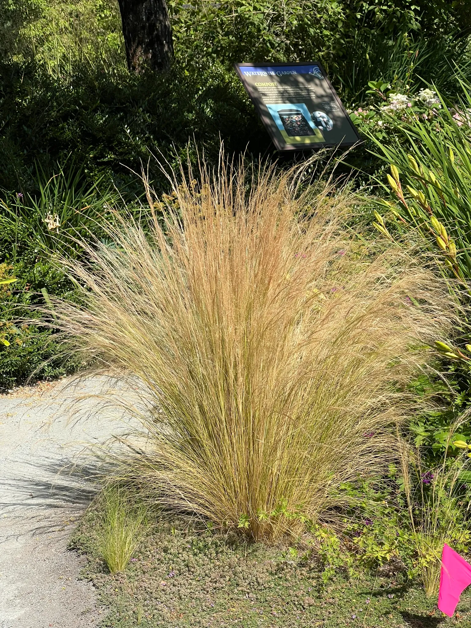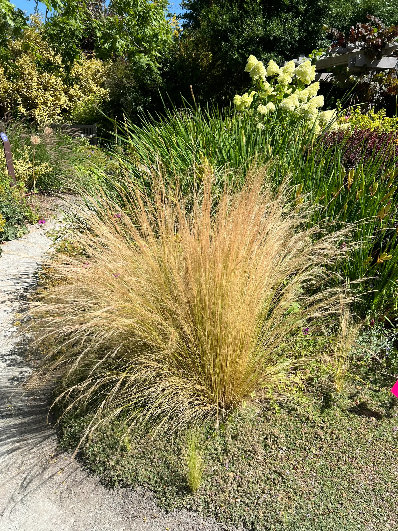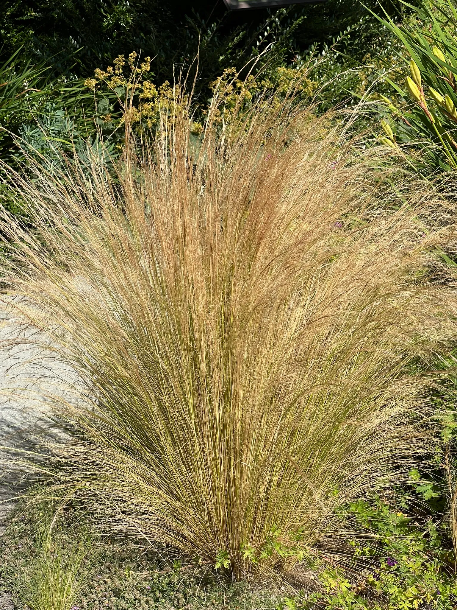 A fine-textured, clump-forming ornamental grass in the family Poaceae (formerly Stipa tenuissima), native to high-elevation grasslands and rocky slopes of Mexico, New Mexico, and Texas. Plants form dense, rounded tufts 12–24 inches (30–60 cm) tall of extremely narrow, thread-like leaves — some of the finest-textured of any ornamental grass — in bright green, turning gold-tan by late summer. From late spring through summer, delicate, feathery flowering panicles rise above the foliage, initially green and maturing to silver-white then golden-tan, creating a shimmering, cloud-like effect that moves with the slightest air movement. The persistent seed heads and foliage remain attractive through fall and winter in mild climates. Nassella tenuissima self-seeds prolifically — hundreds of seedlings per plant — and is classified as a noxious weed in California (Class B) and invasive in New Mexico, Texas, parts of Australia, and South Africa. Do not plant near natural areas or native grasslands. In Washington and Oregon, check current local guidance before planting.