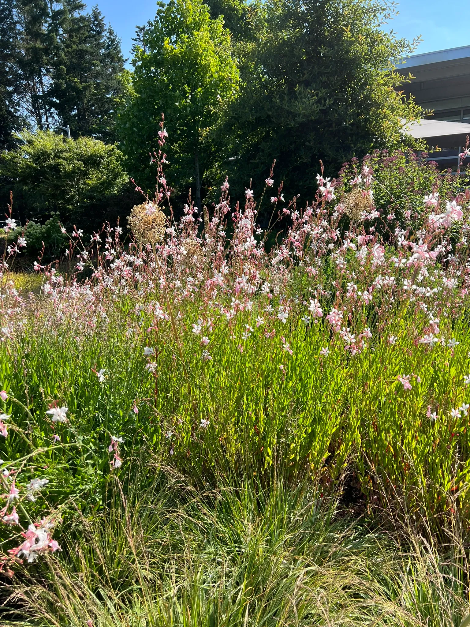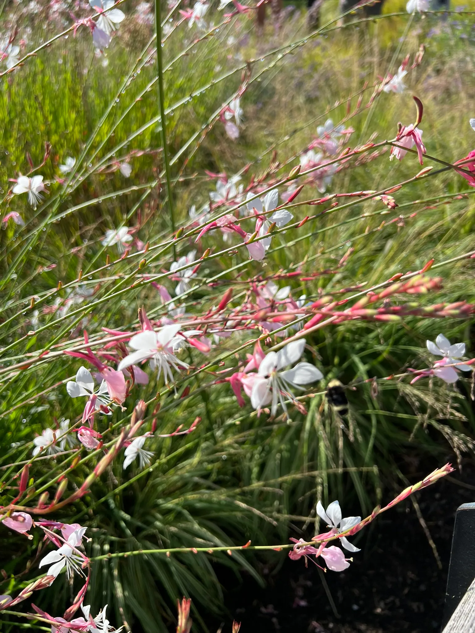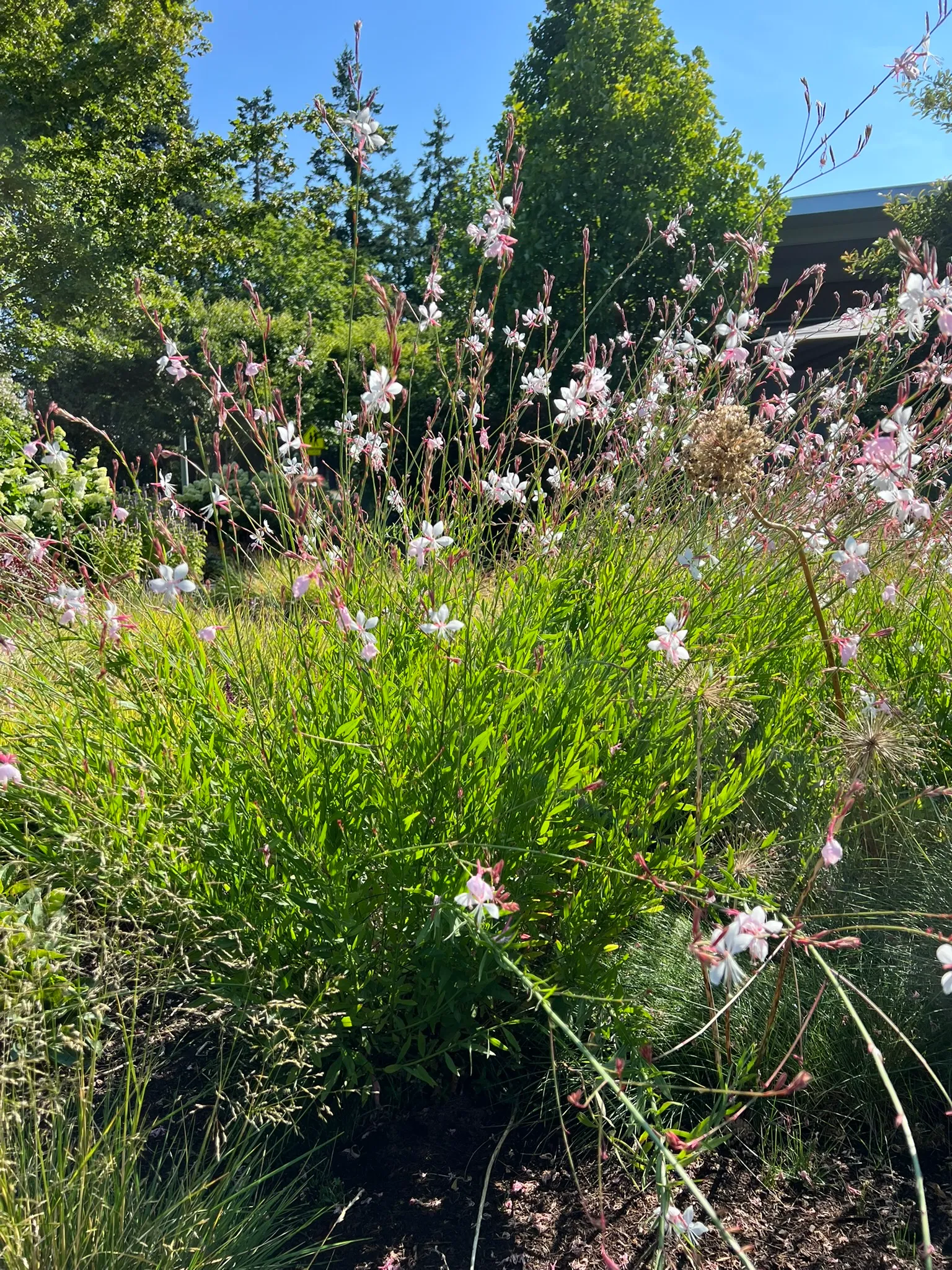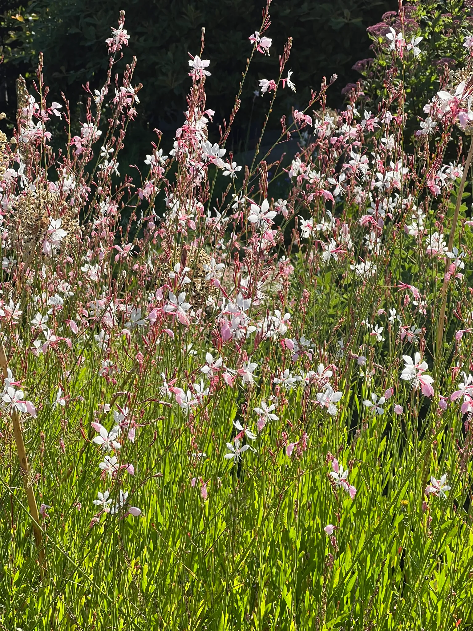 An upright, airy-stemmed perennial in the family Onagraceae, native to open prairies, roadsides, and disturbed ground in Texas and Louisiana. Plants grow from a deep taproot producing wiry, branching stems 36–60 inches (90–150 cm) tall clothed in narrow, lance-shaped leaves 1–3 inches (2.5–8 cm) long, often with red-tinged margins. From late spring through fall, the slender stems bear loose, open racemes of small, four-petaled flowers 0.75–1 inch (2–2.5 cm) across in white aging to pale pink, each with reflexed petals and prominent, long-exserted stamens that create a delicate, butterfly-like appearance as they flutter in the wind. Individual flowers last one day; continuous bud production over 5–6 months provides near-uninterrupted bloom. The deep taproot makes established plants highly drought-tolerant and renders division or transplanting difficult. Formerly classified as Gaura lindheimeri — still widely sold under that name. Hardy in zones 5–9; may be grown as an annual in cooler zones. Non-toxic.