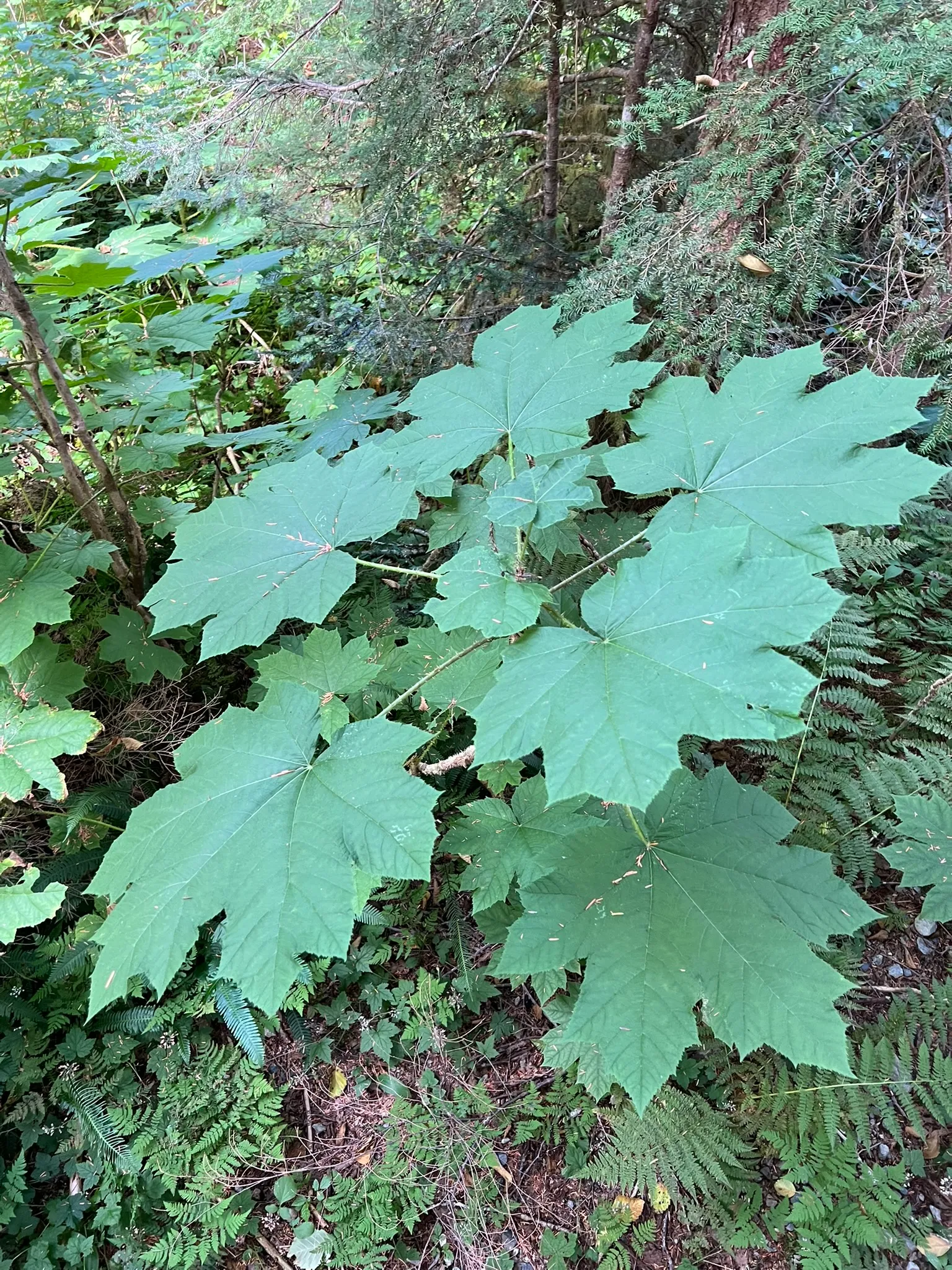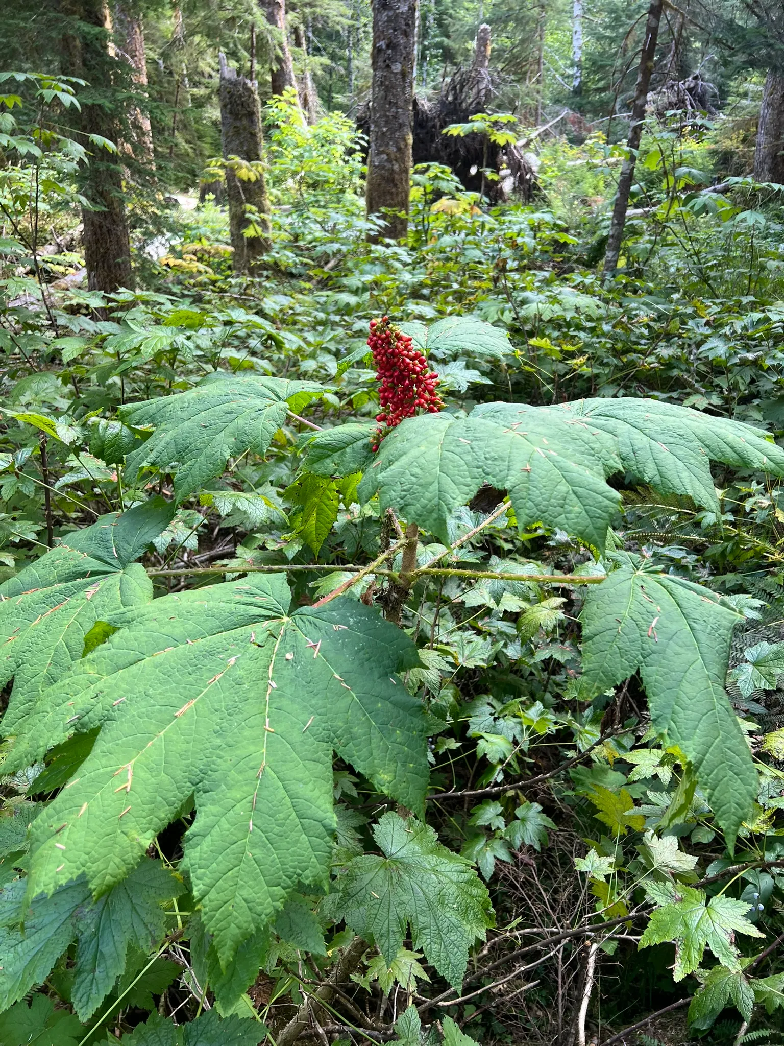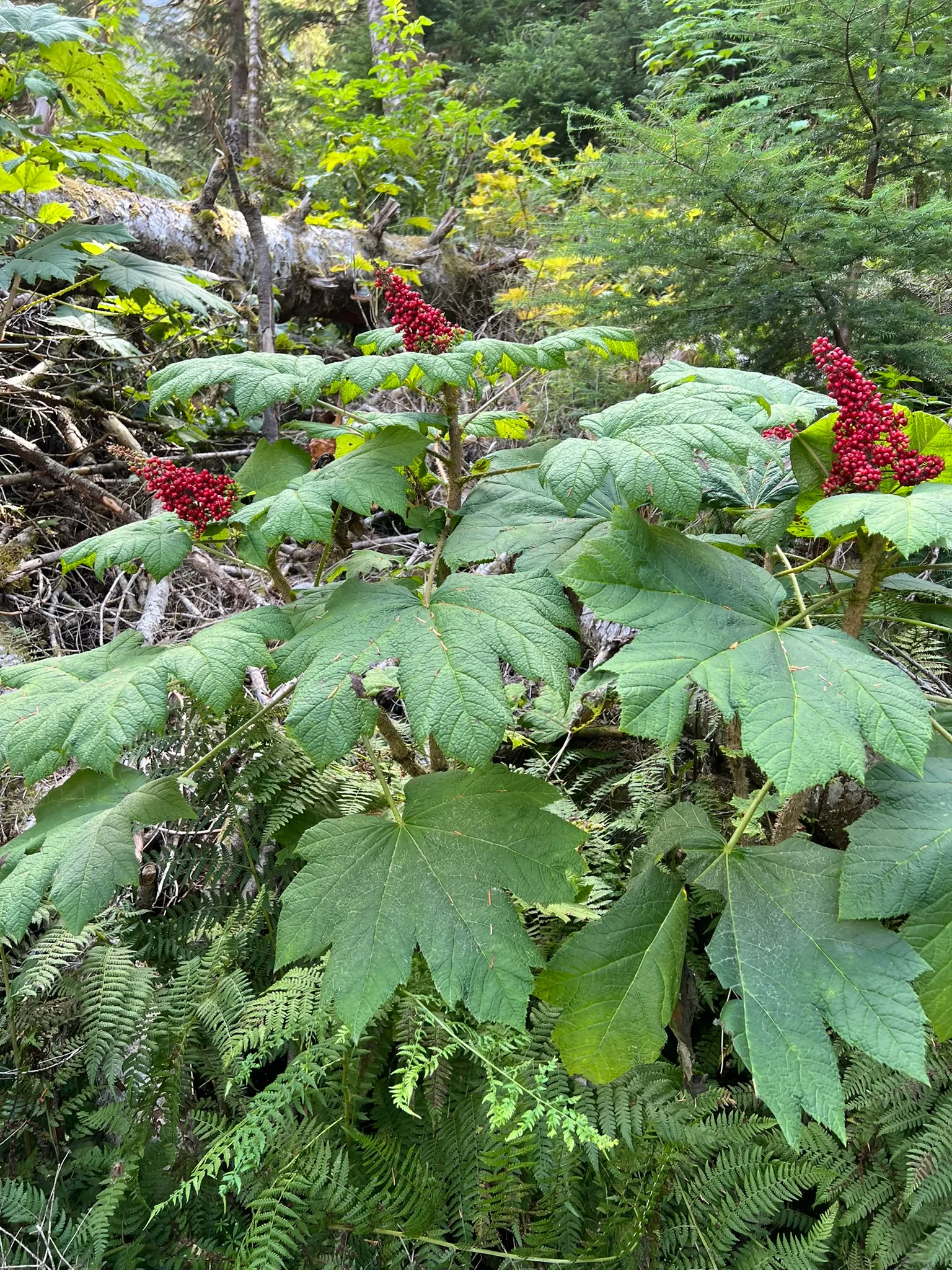 A large, dramatically armed, multi-stemmed deciduous shrub in the family Araliaceae (ginseng family), native to moist old-growth conifer forests, ravines, stream banks, and forest edges from Alaska south through British Columbia, Washington, and Oregon to California, and east to the Rocky Mountains. The specific epithet horridus means 'bristling' or 'rough,' accurately describing the dense covering of sharp, pale yellow spines on the stems, leaf petioles, and the undersides of the leaf veins — the spines are the most immediately diagnostic feature and make handling without protection painful and potentially dangerous, as they break off readily and cause slow-healing puncture wounds. Plants grow 3–10 feet (0.9–3 m) tall, typically with a few unbranched or sparsely branched erect stems topped by a crown of enormous, palmately lobed, maple-like leaves 8–16 inches (20–40 cm) across with 5–9 pointed, toothed lobes — among the largest leaves of any native PNW shrub. From June through July, the stem tip produces a large, compound, rounded to somewhat pyramidal cluster of small, greenish-white to cream flowers. The fruits ripen to bright red, flattened, berry-like drupes in tight clusters by August–September and are consumed by bears and some bird species. Oplopanax horridus is of profound cultural and medicinal significance to many Indigenous peoples of the Pacific Northwest and Interior Plateau. Non-toxic by ingestion; the spines are the primary physical hazard.