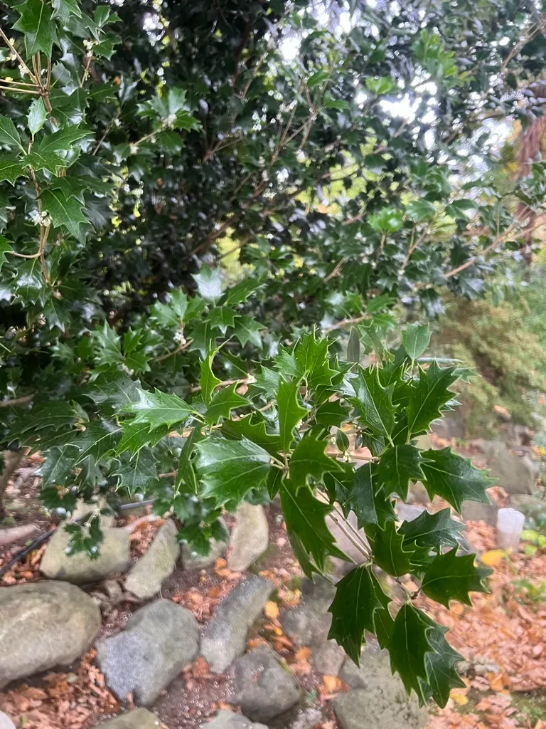 A dense, upright to rounded broadleaf evergreen shrub or small tree reaching 8-15 feet (2.4-4.5 m) tall and 6-12 feet (1.8-3.6 m) wide, though it can eventually reach 20 feet (6 m) or more with great age. Growth rate is slow to moderate, adding 4-8 inches (10-20 cm) per year. Leaves are opposite, simple, ovate to elliptical, 1.5-2.5 inches (4-6 cm) long, thick and leathery, glossy dark green. Leaf margins are variable (heterophyllous): juvenile and lower leaves are strongly spiny with 3-5 prominent spine-tipped teeth resembling holly (Ilex), while mature and upper leaves often become entire (smooth-edged) or with only 1-2 spines. This heterophylly — the presence of different leaf shapes on the same plant — gives the species its name. Flowers appear in October to November in small axillary clusters, each flower small, tubular, four-lobed, white, approximately 0.2 inches (5 mm) across, with an intensely sweet, apricot-like fragrance. The autumn bloom period is distinctive among evergreen shrubs and provides late-season fragrance. Fruit is an ovoid drupe approximately 0.5 inches (13 mm) long, blue-black, ripening the following summer, produced sparsely. Distinguished from true holly (Ilex) by the opposite (vs. alternate) leaf arrangement and the fragrant autumn flowers. Hardy to approximately -5 to 5°F (-20 to -15°C).