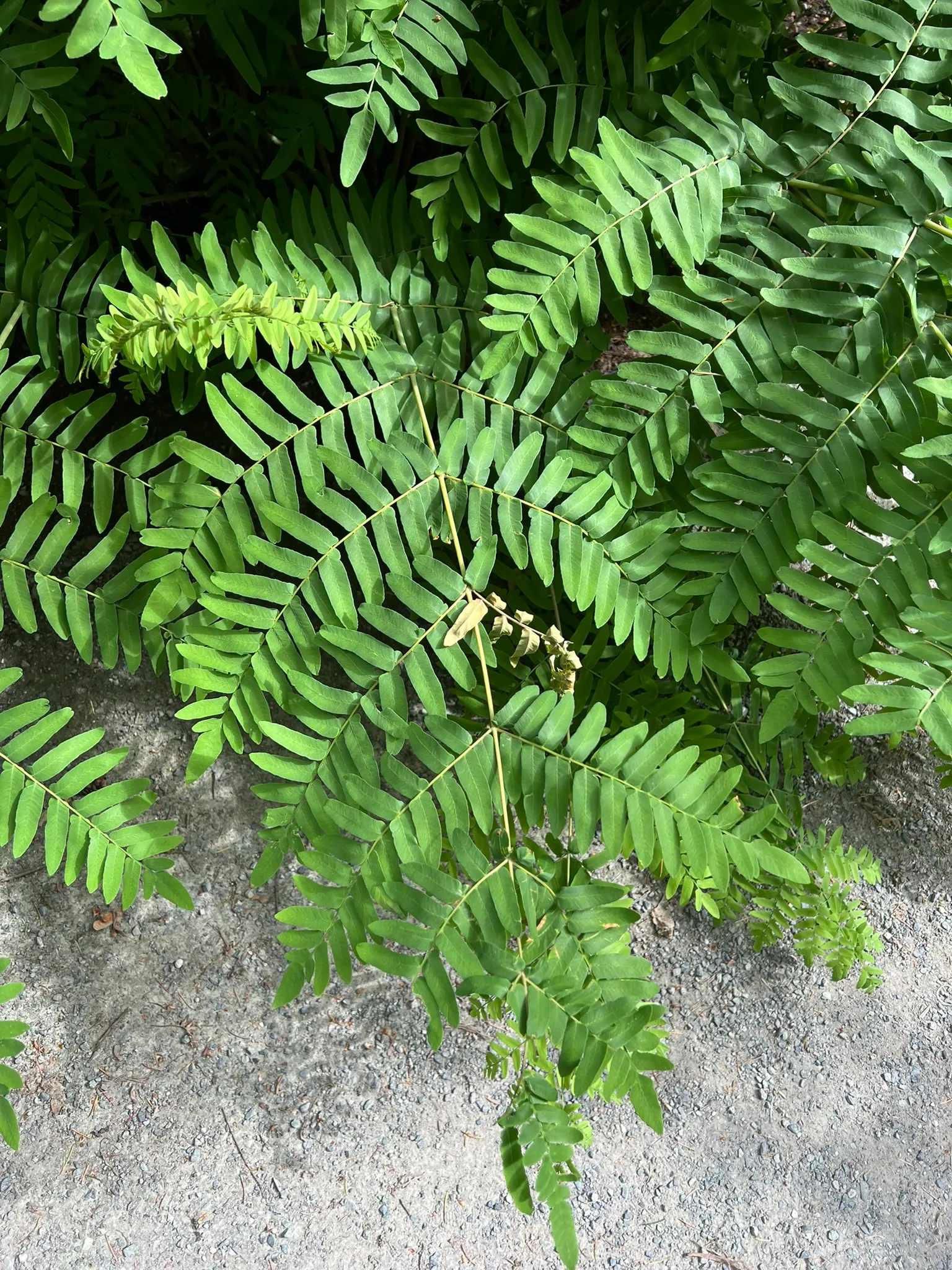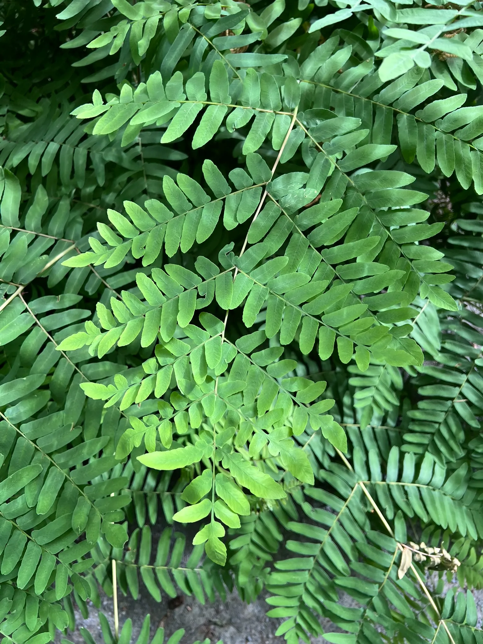 A large, deciduous fern forming a vase-shaped clump 2-6 feet (60-180 cm) tall and 2-4 feet (60-120 cm) wide, with some specimens in optimal conditions reaching 6 feet (180 cm) or more in height. Fronds are bipinnate, 2-5 feet (60-150 cm) long, with oblong, smooth-margined pinnules 0.5-1.5 inches (1.5-4 cm) long and 0.3-0.7 inches (8-18 mm) wide. Fronds emerge pale green with pinkish-bronze coloring in spring, maturing to bright green through summer. In autumn, foliage turns yellow-gold to russet before dying back. Fertile fronds terminate in clusters of tightly packed, spore-bearing pinnules that turn from green to rusty brown as spores ripen, giving a flower-like appearance from a distance and accounting for the common name Flowering Fern. These fertile segments appear at frond tips or on separate upright fronds, typically in late spring to summer. The plant grows from a large, fibrous rhizome base that accumulates over decades. Growth rate is moderate to slow; established clumps expand outward 2-4 inches (5-10 cm) per year.