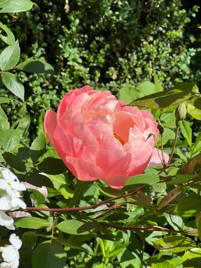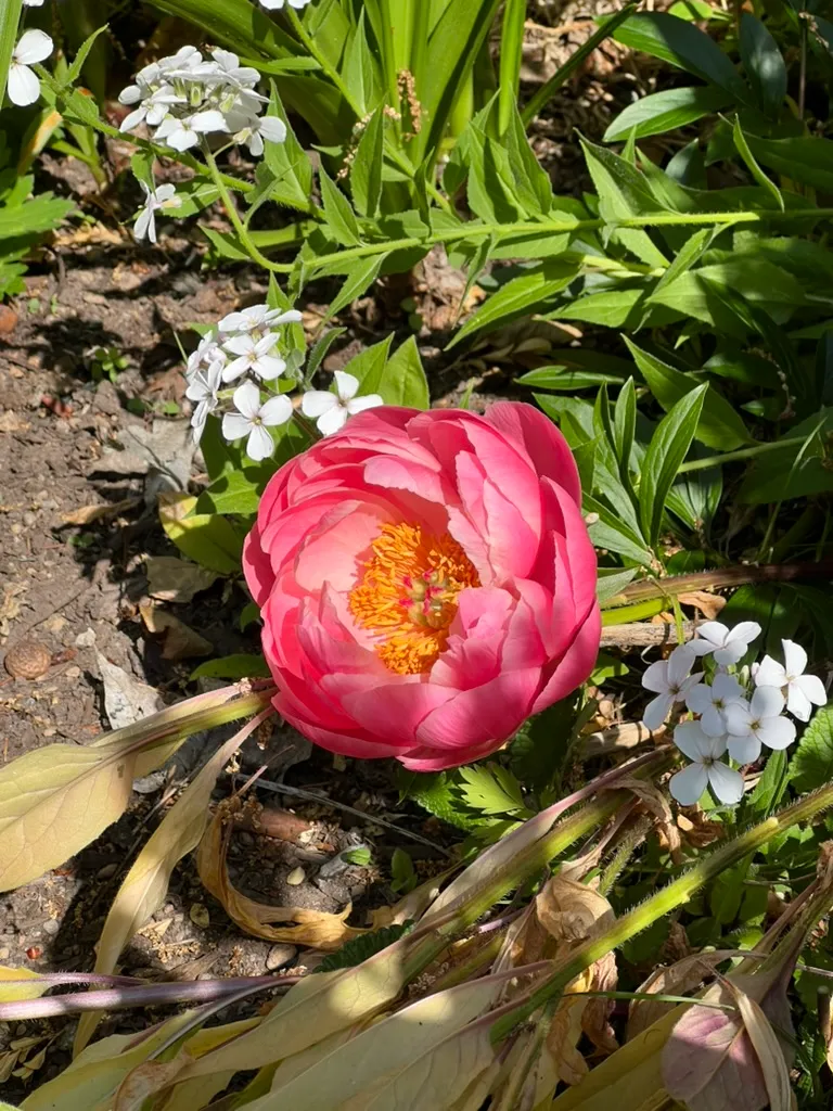 Plant garden peonies in full sun to partial shade in well-drained, fertile, slightly acidic to neutral soil. The most critical factor is planting depth: the eyes (buds on the crown) must be positioned no more than 1–2 inches (2.5–5 cm) below the soil surface — planting too deep is the primary reason garden peonies fail to flower. Amend soil with compost before planting; peonies are heavy feeders and respond to annual top-dressing with balanced fertilizer in early spring. Stake heavy-flowering cultivars before the stems elongate, as the large double flowers will collapse in rain or wind without support. Water consistently during the growing season. Peonies are long-lived and resent disturbance — plant in a permanent position and leave undivided. All parts are mildly toxic.Pruning