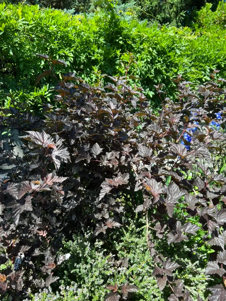 A large, mounding deciduous shrub reaching 6–9 feet (1.8–2.7 m) tall and 6–8 feet (1.8–2.4 m) wide, a cultivar of P. opulifolius (eastern ninebark) selected for deep burgundy-purple foliage — one of the most intensely dark-foliaged large shrubs commonly grown in the Pacific Northwest. Leaves three-lobed, 1.5–3 inches (4–7.5 cm) long, deep burgundy-purple through the growing season in full sun. In June, dense corymbs of small pinkish-white flowers appear against the dark foliage. Reddish papery seed capsules persist through fall and winter. Bark exfoliates on mature stems, revealing cinnamon-brown inner layers. A cultivar of a native eastern North American species. Extremely adaptable and low-maintenance. Hardy in USDA zones 3–7.