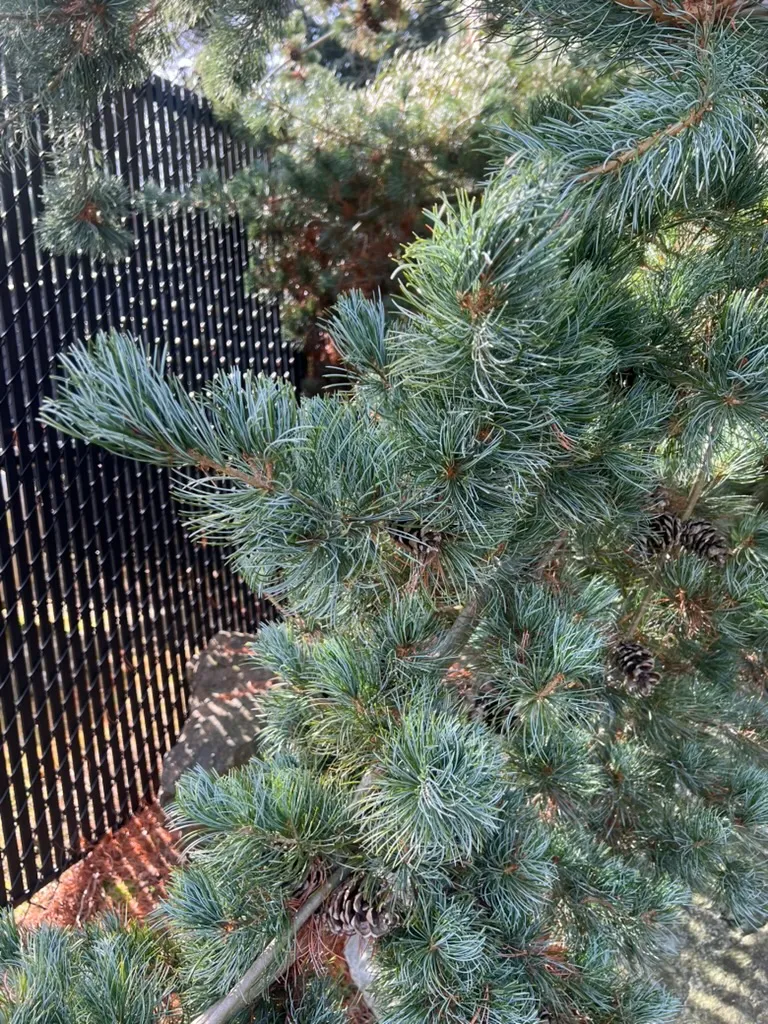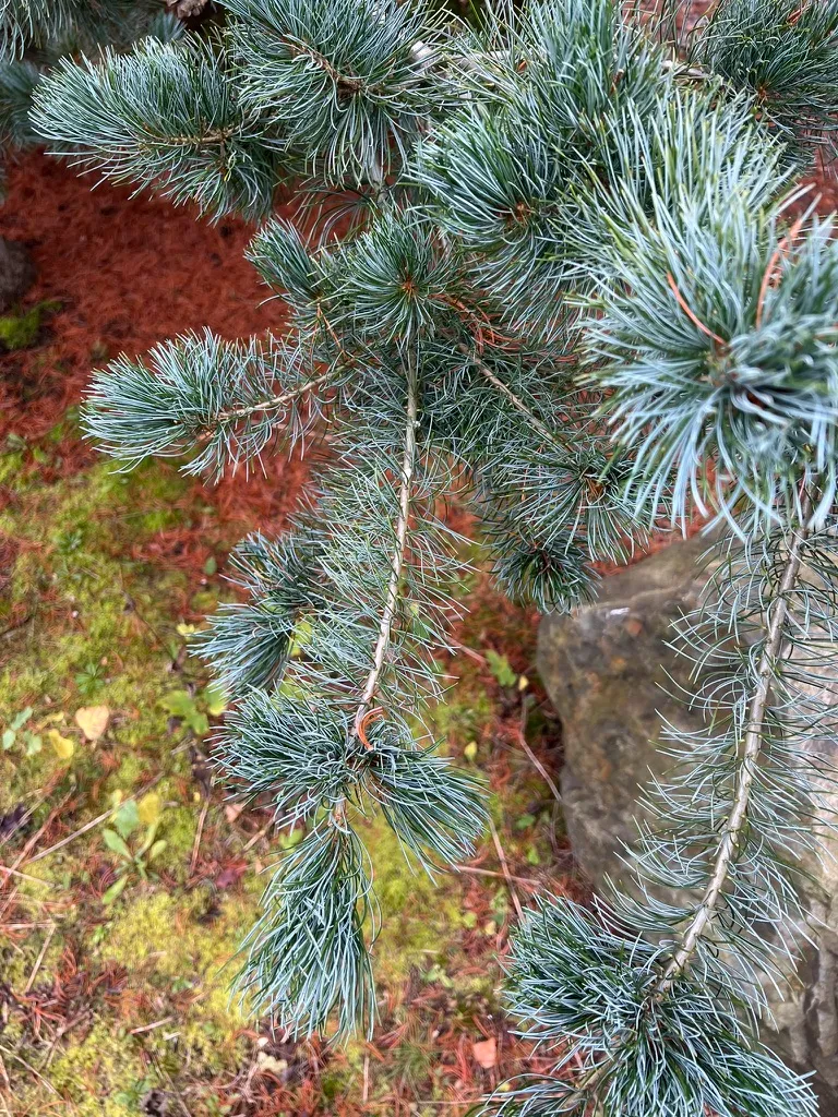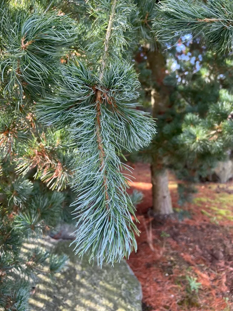 Pinus parviflora is a medium-sized evergreen pine native to Japan and Korea, grown in cultivation for its layered branching structure and distinctive blue-green foliage. Trees reach 25–50 feet (7.6–15 m) tall and 20–35 feet (6–10.7 m) wide at maturity; growth rate is 6–12 inches (15–30 cm) per year. The crown is broadly pyramidal when young, becoming broad, irregular, and often flat-topped with age, with horizontal to slightly ascending layered branches. Needles are in bundles of five, 1.5–2.5 inches (4–6 cm) long, stiff, blue-green with white stomatal lines on the inner surfaces, twisted and held in compact tufts at branch tips. Cones are ovoid, 1.5–3 inches (4–7.5 cm) long, reddish-brown to purple-brown, held erect on branches, persisting for several years after opening. White pine blister rust affects five-needled pines and is prevalent in the Pacific Northwest; proximity to Ribes spp. should be avoided.