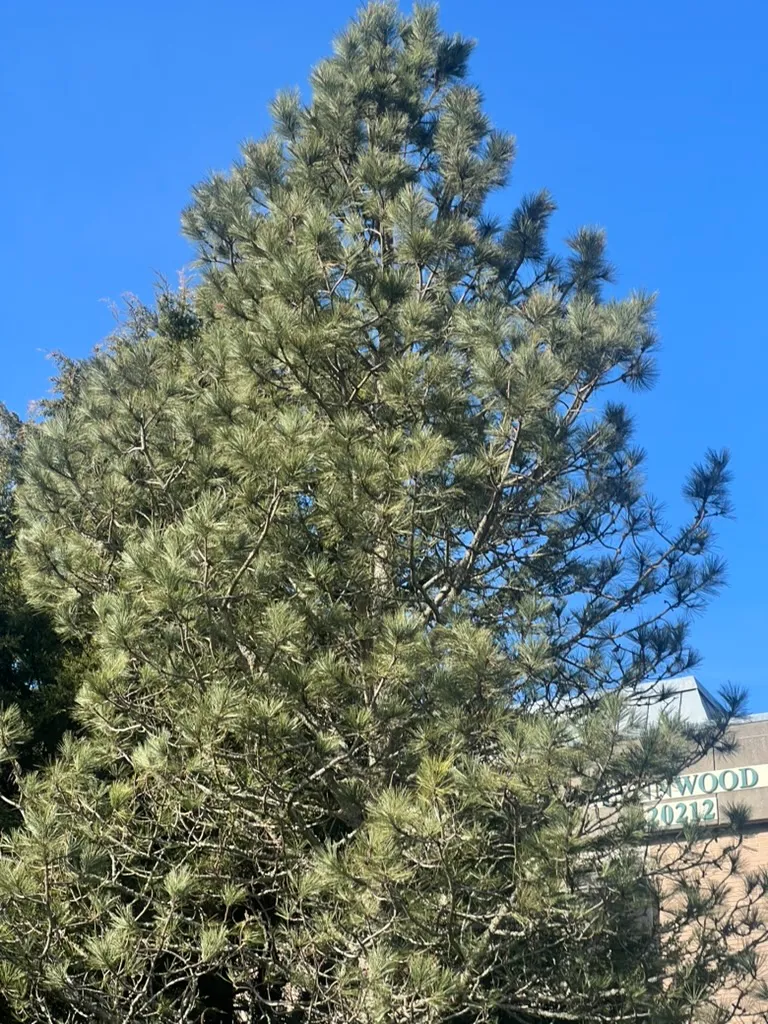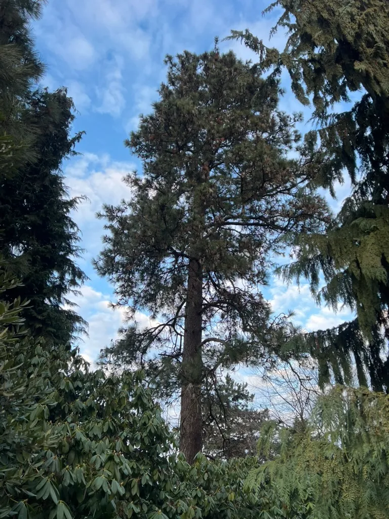 Pinus ponderosa is a large evergreen pine native to western North America, one of the most widely distributed pines on the continent. Trees reach 60–100 feet (18–30 m) tall and 25–35 feet (7.6–10.7 m) wide in cultivation; growth rate is 12–24 inches (30–60 cm) per year on good sites. The crown is broadly conical to pyramidal when young, becoming open and irregular with age, with long, slightly drooping branches. Needles are in bundles of three (occasionally two or five depending on variety), 5–10 inches (12.5–25 cm) long, stiff, yellow-green to dark green, clustered densely at branch tips. Bark on mature trees is orange-cinnamon to yellow-brown, exfoliating in large, flat, jigsaw-puzzle-like plates separated by dark fissures; young tree bark is dark gray-brown. Cones are ovoid, 3–6 inches (7.5–15 cm) long, prickly, light brown, falling intact. Bark emits a vanilla to butterscotch scent when warmed. The species is susceptible to bark beetle attack; stressed trees are most vulnerable. In Pacific Northwest gardens, the species typically performs best in drier east-side conditions rather than wet west-side sites.