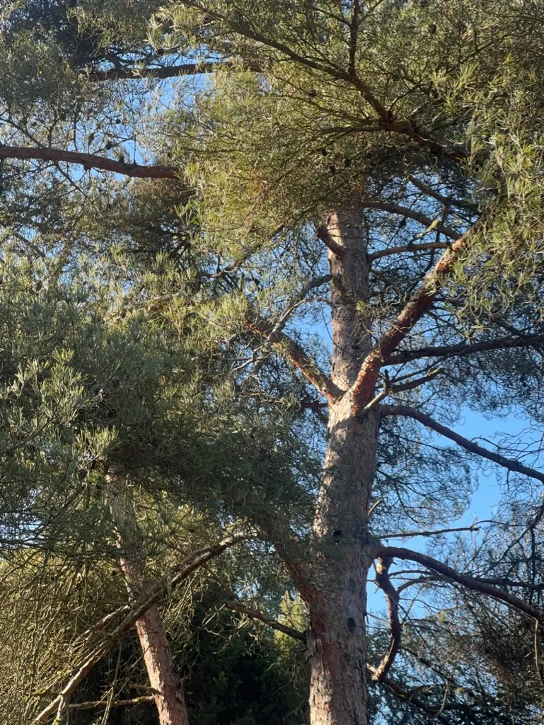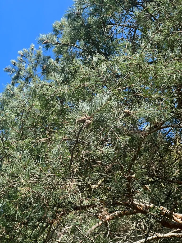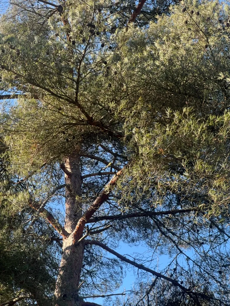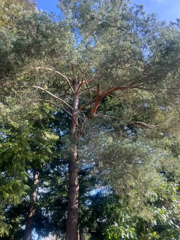 Pinus sylvestris is a large evergreen pine native to Eurasia, with the widest natural range of any pine species. Trees reach 40–60 feet (12–18 m) tall and 20–35 feet (6–10.7 m) wide in cultivation; growth rate is 12–24 inches (30–60 cm) per year. The crown is broadly conical when young, becoming open, irregular, and often umbrella-shaped with age. Needles are in bundles of two, 1.5–3 inches (4–7.5 cm) long, stiff, twisted, blue-green to gray-green. The most distinctive feature is the bark on the upper trunk and branches, which exfoliates to reveal a bright orange-red to cinnamon-salmon surface, contrasting strongly with the dark gray-brown furrowed bark at the base. Cones are ovoid, 1.5–3 inches (4–7.5 cm) long, gray-brown, dull, falling after opening. Diplodia tip blight is the most significant disease concern; it has caused widespread decline in P. sylvestris plantings in some regions, particularly in the Midwest and Northeast. In Pacific Northwest conditions, disease pressure is generally lower.
