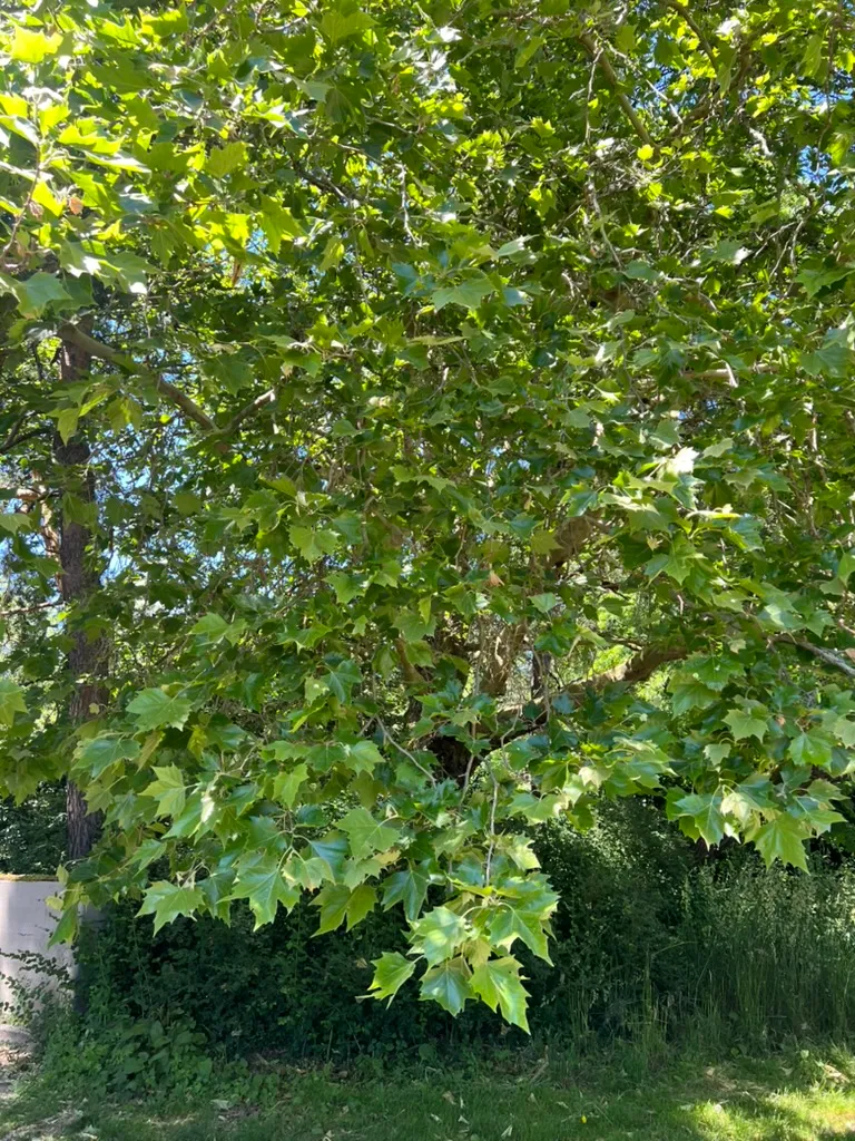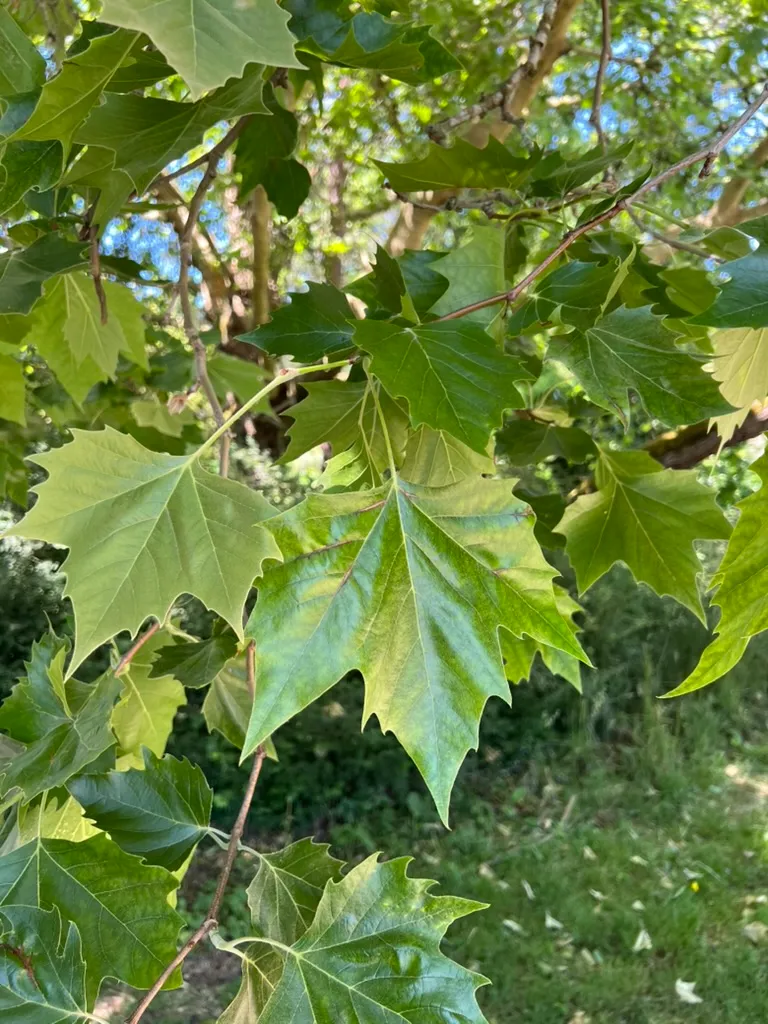 Platanus x acerifolia is a large deciduous tree reaching 60-80 feet (18-24 m) tall with a spread of 50-70 feet (15-21 m), developing a broad, rounded to pyramidal crown with massive spreading limbs. This hybrid between Platanus occidentalis (American sycamore) and Platanus orientalis (Oriental plane), first documented in the 17th century, is one of the most widely planted urban trees worldwide. Bark exfoliates in irregular patches, revealing a mosaic of cream, olive-green, and tan inner bark — the most recognizable identification feature. Leaves are alternate, simple, palmately lobed with 3-5 lobes, 6-10 inches (15-25 cm) wide, medium to dark green and leathery-textured. Foliage turns yellowish-brown in fall; color is not a significant ornamental feature. Inconspicuous monoecious flowers appear in April as pendulous, spherical heads. Fruit consists of bristly, spherical seed balls, approximately 1 inch (2.5 cm) in diameter, borne singly or in pairs on pendulous stalks, persisting through winter and dispersing seeds with irritating hairs in spring. Growth rate is moderate to fast at 18-24 inches (46-61 cm) per year. Trees are long-lived, commonly reaching 200-400 years in urban settings. Anthracnose (Apiognomonia veneta) causes twig dieback and leaf distortion in cool, wet springs but is primarily cosmetic. Powdery mildew and lace bugs are occasional concerns. Leaf and seed ball litter is substantial. Surface roots can heave sidewalks and pavement.