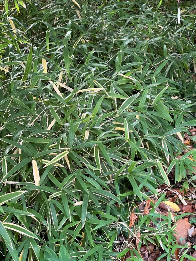 A diminutive running bamboo forming a dense, low groundcover mat 6-24 inches (15-60 cm) tall and spreading indefinitely by leptomorph (running) rhizomes. One of the smallest bamboos in cultivation. Growth rate is moderate; rhizomes extend 6-12 inches (15-30 cm) per year. Culms are slender, erect to slightly arching, less than 0.25 inches (6 mm) in diameter, green, with short internodes. Leaves are lance-shaped, 1.5-3 inches (4-8 cm) long and 0.25-0.5 inches (6-13 mm) wide, bright to medium green, arranged alternately along the culms in a slightly feathery pattern. Foliage is evergreen, though older leaves may become tattered or bleached by late winter, particularly in exposed sites. The dense, carpet-like growth habit suppresses weeds once established. Spreads aggressively by running rhizomes and requires containment in garden settings to prevent unwanted invasion. Formerly classified as Arundinaria pygmaea and Sasa pygmaea. Flowering is extremely rare, occurring at intervals of decades. Hardy to approximately -10 to 0°F (-23 to -18°C).