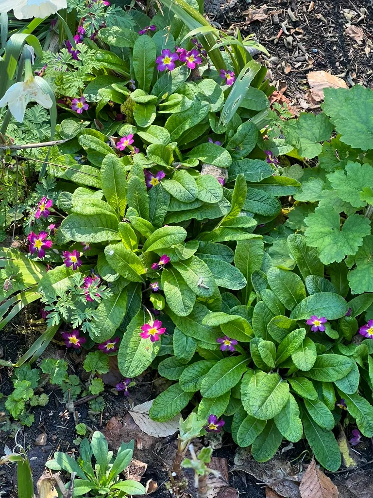 Plant in partial shade to full sun in moist, humus-rich, well-drained, slightly acidic to neutral soil. In Pacific Northwest gardens polyanthus performs best in partial shade, particularly in warmer inland locations where full afternoon sun in late spring can scorch the foliage. Keep consistently moist — plants decline rapidly if allowed to dry out during flowering. Incorporate compost at planting. Modern large-flowered strains tend to be short-lived and are best replaced after two to three seasons when vigor declines; old-fashioned heirloom strains are more reliably perennial. Divide established clumps every two to three years immediately after flowering. Slug damage to emerging crowns is a significant concern in Pacific Northwest gardens.Pruning