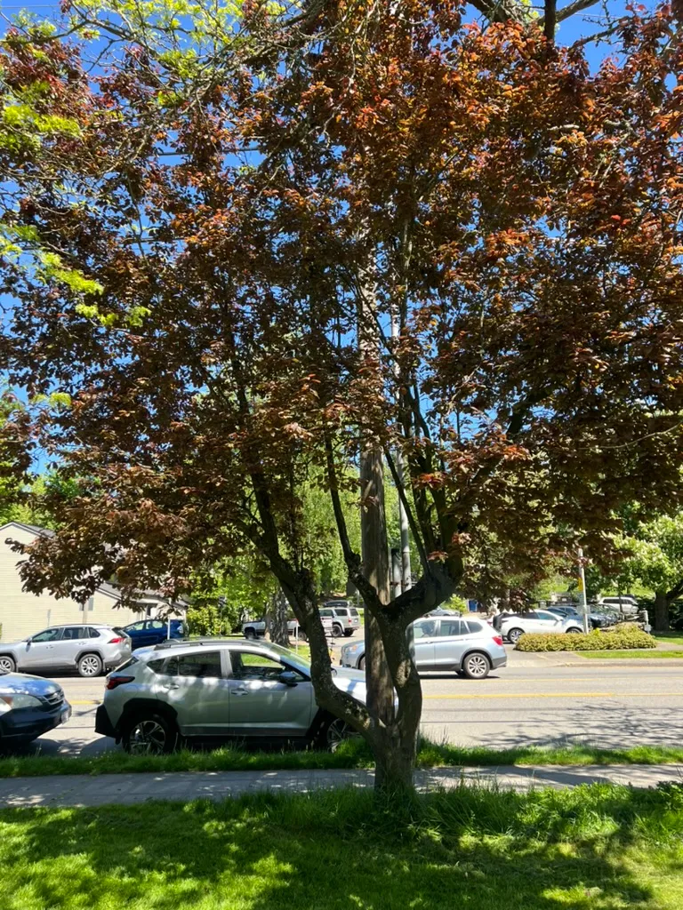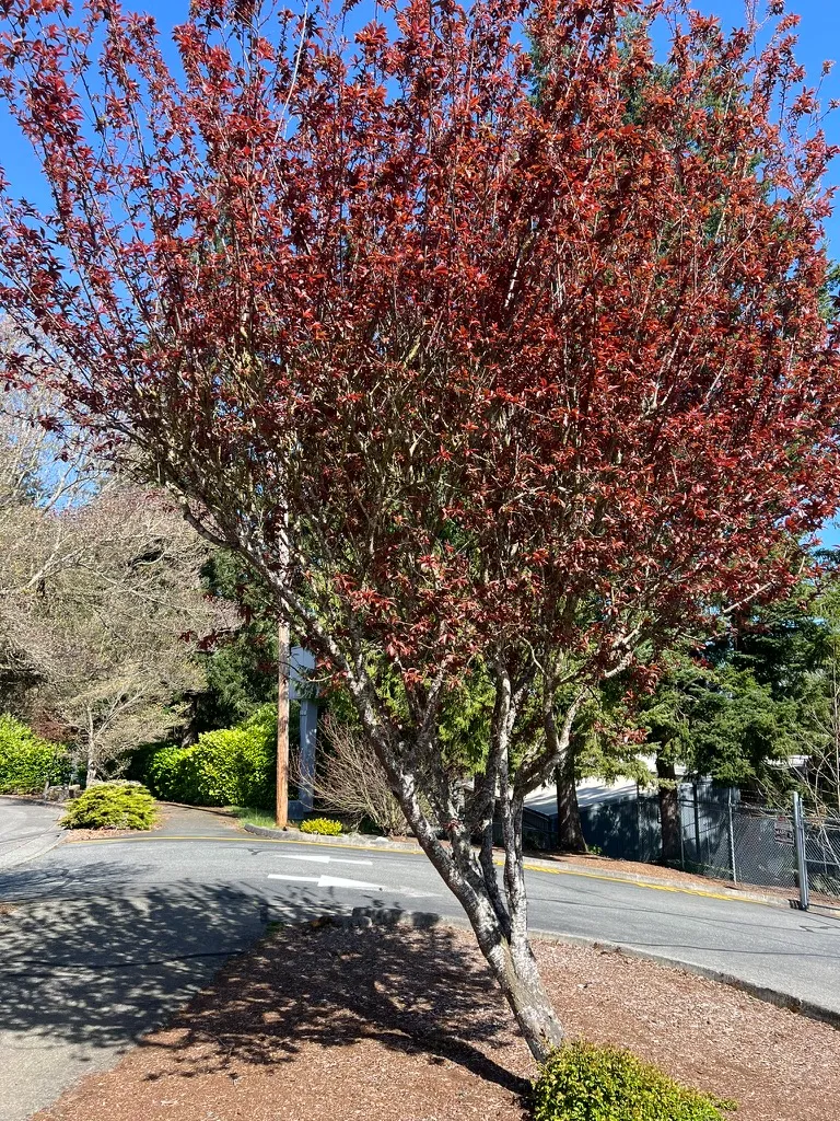 Prunus cerasifera is a small deciduous tree reaching 15-25 feet (4.6-7.6 m) tall with a spread of 15-25 feet (4.6-7.6 m), developing a rounded to broadly spreading crown. The species type has green foliage and white flowers, but purple-leaved cultivars such as 'Atropurpurea', 'Thundercloud', and 'Krauter Vesuvius' are far more commonly planted. Bark is smooth, dark reddish-brown to gray, developing shallow fissures with age. Leaves are alternate, simple, ovate to obovate, 1.5-3 inches (4-8 cm) long, with finely serrate margins. On the species type, foliage is green; on purple-leaved cultivars, foliage emerges deep reddish-purple and maintains purple tones through summer, fading somewhat in hot weather. Single flowers, 0.75-1 inch (2-2.5 cm) across, are white on the species type and pink on purple-leaved cultivars, appearing profusely in February to March before or concurrent with leaf emergence. Flowers are lightly fragrant. Small cherry-like drupes, 0.75-1.25 inches (2-3 cm) in diameter, ripen red to purple in July to August on the species and some cultivars; fruit is edible but tart. Purple-leaved cultivars vary in fruit production — some are prolific, creating considerable litter on pavement. Growth rate is moderate to fast at 12-24 inches (30-61 cm) per year. Trees are relatively short-lived at 20-30 years. Susceptible to bacterial canker (Pseudomonas syringae), brown rot, aphids, tent caterpillars, and borers. Bacterial canker is the primary cause of premature decline in the Pacific Northwest.