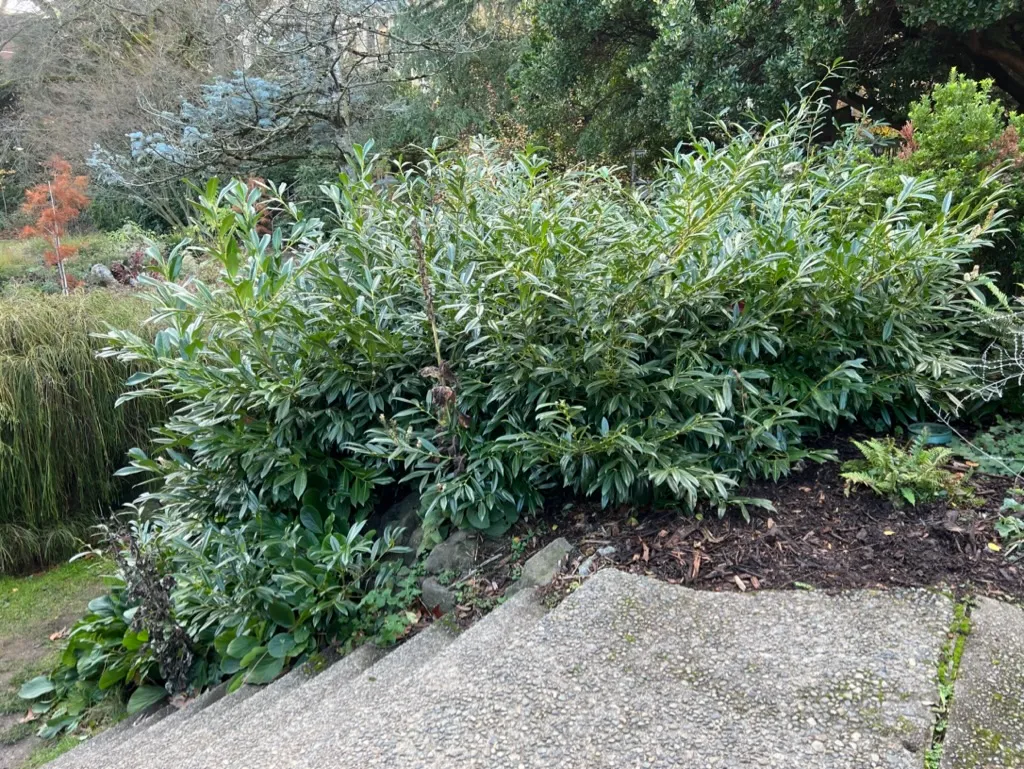 A low-growing, wide-spreading broadleaf evergreen shrub reaching 3-5 feet (0.9-1.5 m) tall and 8-12 feet (2.4-3.6 m) wide, with gracefully arching, layered horizontal branches. Growth rate is moderate, adding 6-12 inches (15-30 cm) per year. This cultivar is selected for its distinctly horizontal, spreading growth habit — wider than tall — and its narrower leaves, which give it a finer texture than the species type. Leaves are alternate, narrowly elliptical to lance-shaped, 3-5 inches (8-13 cm) long and approximately 1 inch (2.5 cm) wide, glossy dark green, leathery, with finely serrated margins. The narrower leaf shape creates a more refined, willow-like appearance compared to the broad-leaved species type. Branches arch horizontally, creating a layered effect. Flowers appear in April to May in erect racemes 2-3 inches (5-8 cm) long, white, fragrant. Fruit is a small black drupe produced moderately. Like the species, all parts contain cyanogenic glycosides and are toxic. Less likely to produce the overwhelming vertical size of the species, but still produces fruit that can be bird-dispersed. Hardy to approximately -10 to 0°F (-23 to -18°C) — one of the more cold-hardy cultivars.