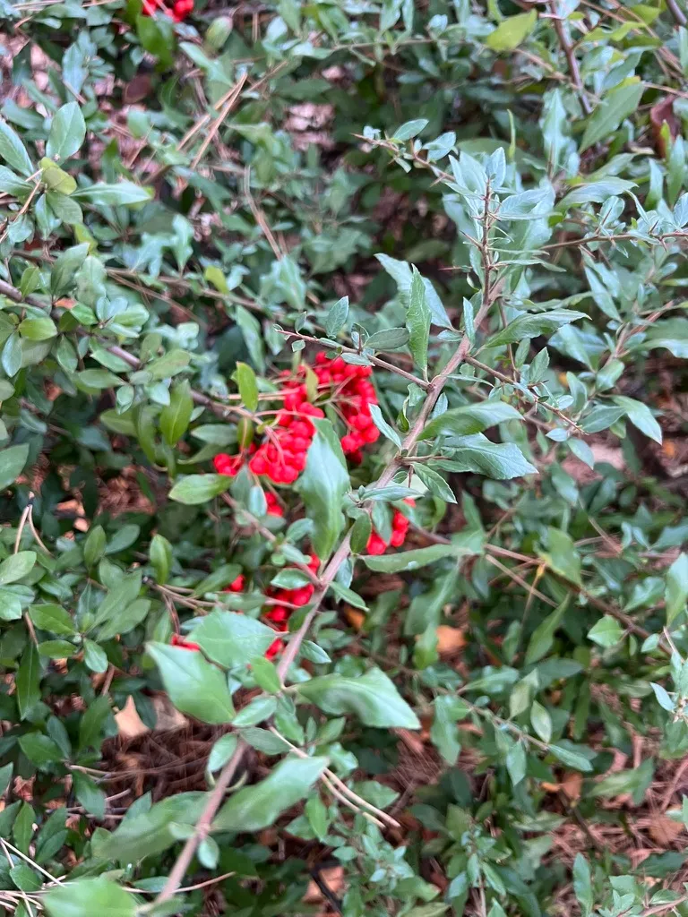 A group of vigorous, thorny broadleaf evergreen to semi-evergreen shrubs typically reaching 6-12 feet (1.8-3.6 m) tall and 6-10 feet (1.8-3 m) wide, depending on species and cultivar. Growth rate is moderate to fast, adding 8-18 inches (20-45 cm) per year. The genus includes approximately 7 species and numerous cultivars, with P. coccinea, P. fortuneana, and P. koidzumii being the most commonly grown. Leaves are alternate, elliptical to obovate, 1-2.5 inches (2.5-6 cm) long and 0.3-0.75 inches (8-19 mm) wide, glossy dark green, with finely crenate (scalloped) margins. Stems bear sharp, rigid thorns 0.5-1 inch (1.3-2.5 cm) long, typically at leaf axils or branch tips. Flowers appear in May to June in dense corymbs 1-3 inches (2.5-8 cm) across, white, each approximately 0.3 inches (8 mm) across, with a mildly unpleasant musty scent. Fruit is the primary ornamental feature: dense clusters of small pomes approximately 0.25 inches (6 mm) in diameter, ripening in September to October to brilliant orange, orange-red, red, or yellow depending on cultivar, and persisting through winter until consumed by birds. The berry display is among the most spectacular of any temperate shrub. Susceptible to fire blight (Erwinia amylovora) and scab (Venturia inaequalis), both of which can severely damage fruit and foliage; disease-resistant cultivars are strongly recommended. Hardy to approximately -5 to 10°F (-20 to -12°C) depending on species.