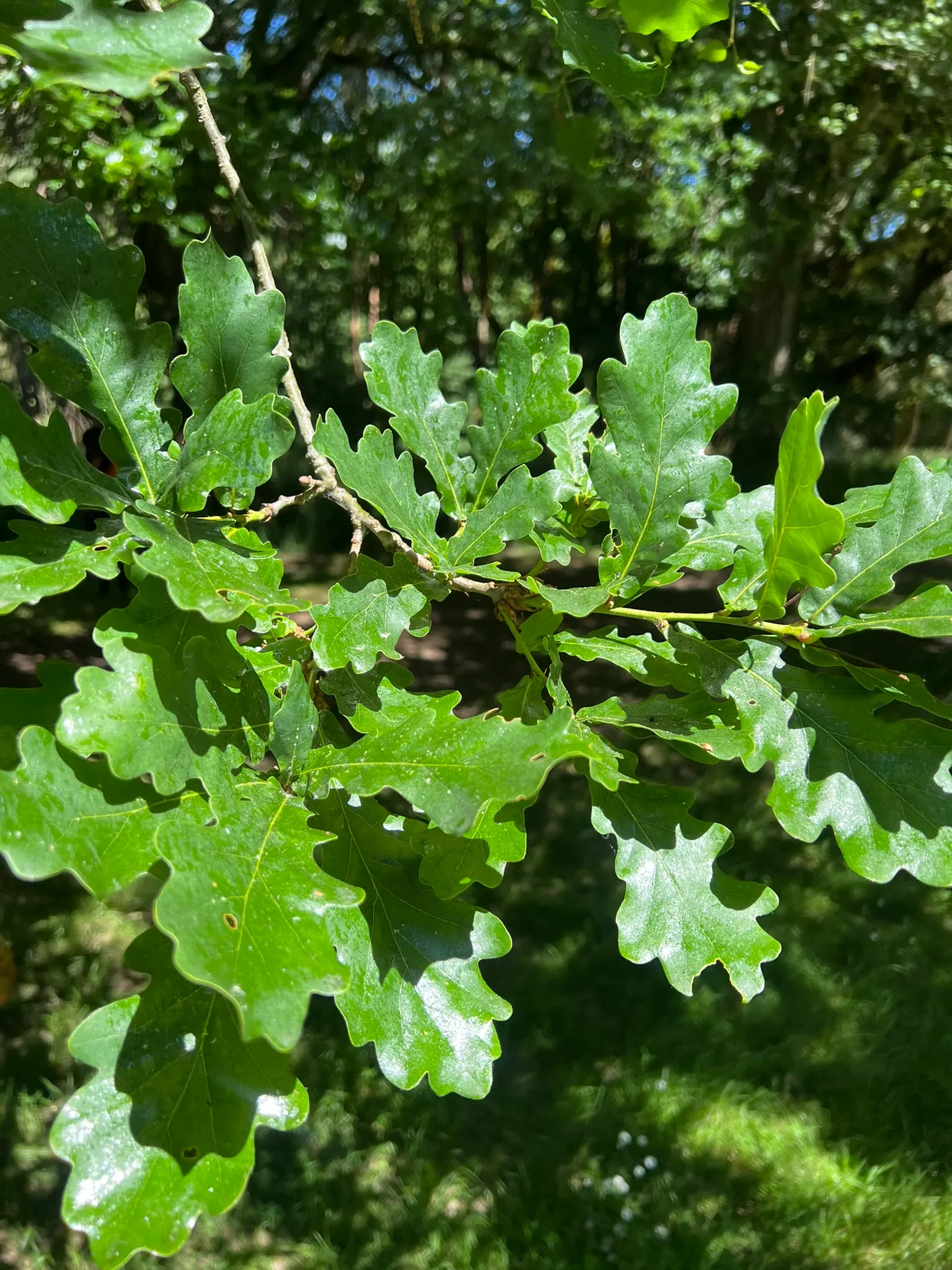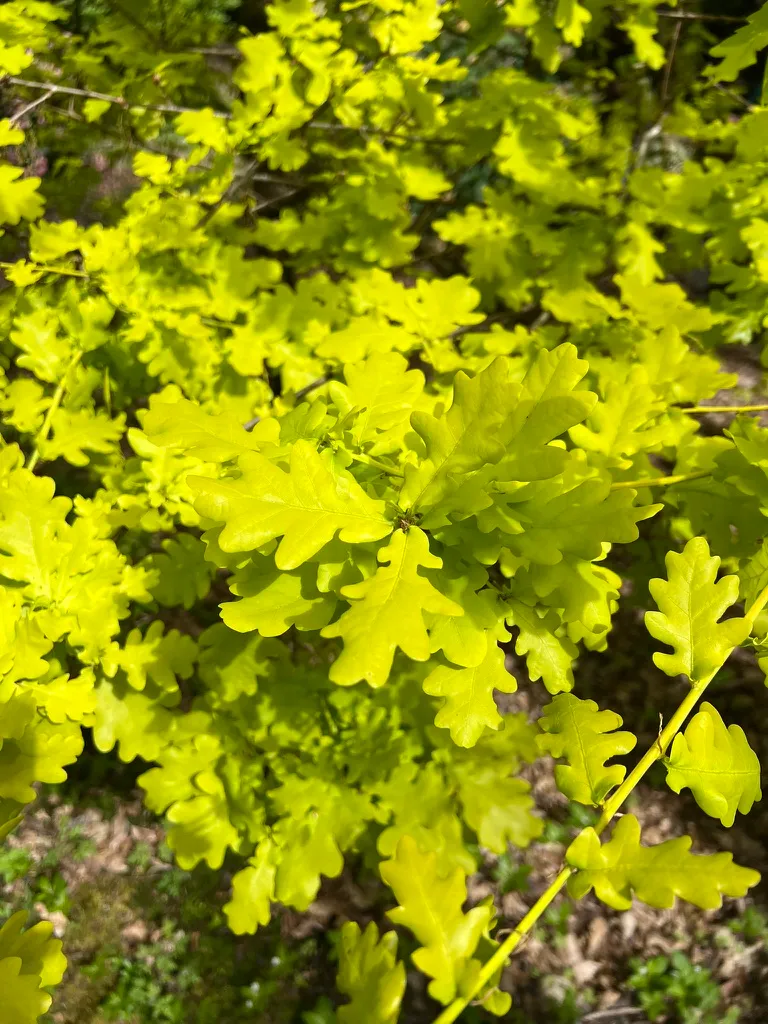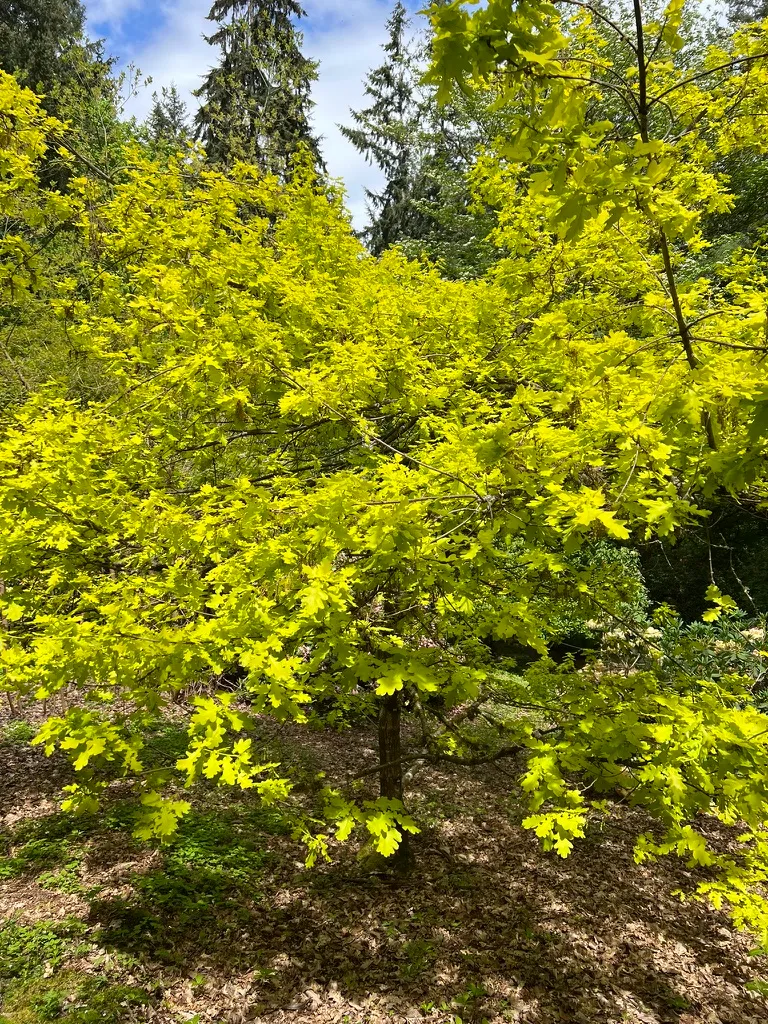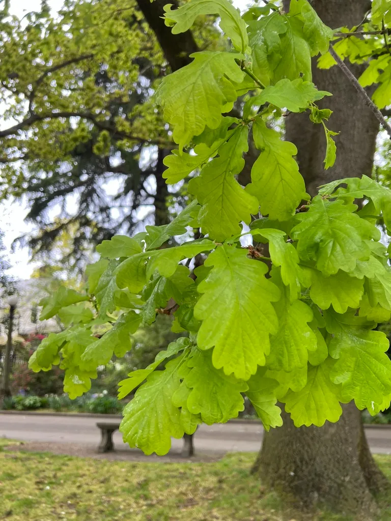 Quercus robur is a large, long-lived deciduous tree reaching 40-70 feet (12-21 m) tall in cultivation, with a spread of 40-70 feet (12-21 m), forming a broad, rounded crown with heavy, spreading lateral branches. In open settings, the trunk is short and stout, dividing into massive limbs; in forest conditions, the trunk is taller and straighter. Bark is dark gray-brown, deeply fissured into vertical ridges. Leaves are obovate, 3-5 inches (8-13 cm) long, with 3-7 pairs of rounded lobes and distinctive small ear-shaped lobes (auricles) at the leaf base clasping a very short petiole less than 0.4 inches (1 cm) long. Foliage emerges yellow-green in spring, matures to dark green, and turns yellow-brown to russet in fall; leaves often persist on branches well into winter (marcescent). Male catkins appear in April to May with emerging leaves. Acorns are ovoid, 0.6-1 inch (1.5-2.5 cm) long, borne in pairs on penduncles 1-3 inches (2.5-8 cm) long — a key identification feature distinguishing this species from Quercus petraea. Growth rate is slow to moderate, adding 12-18 inches (30-45 cm) per year. Trees can live 500-1,000 years under favorable conditions. Susceptible to oak powdery mildew, which causes white patches on foliage but is typically cosmetic. Oak processionary moth is a concern in some European populations but is not currently established in the Pacific Northwest.