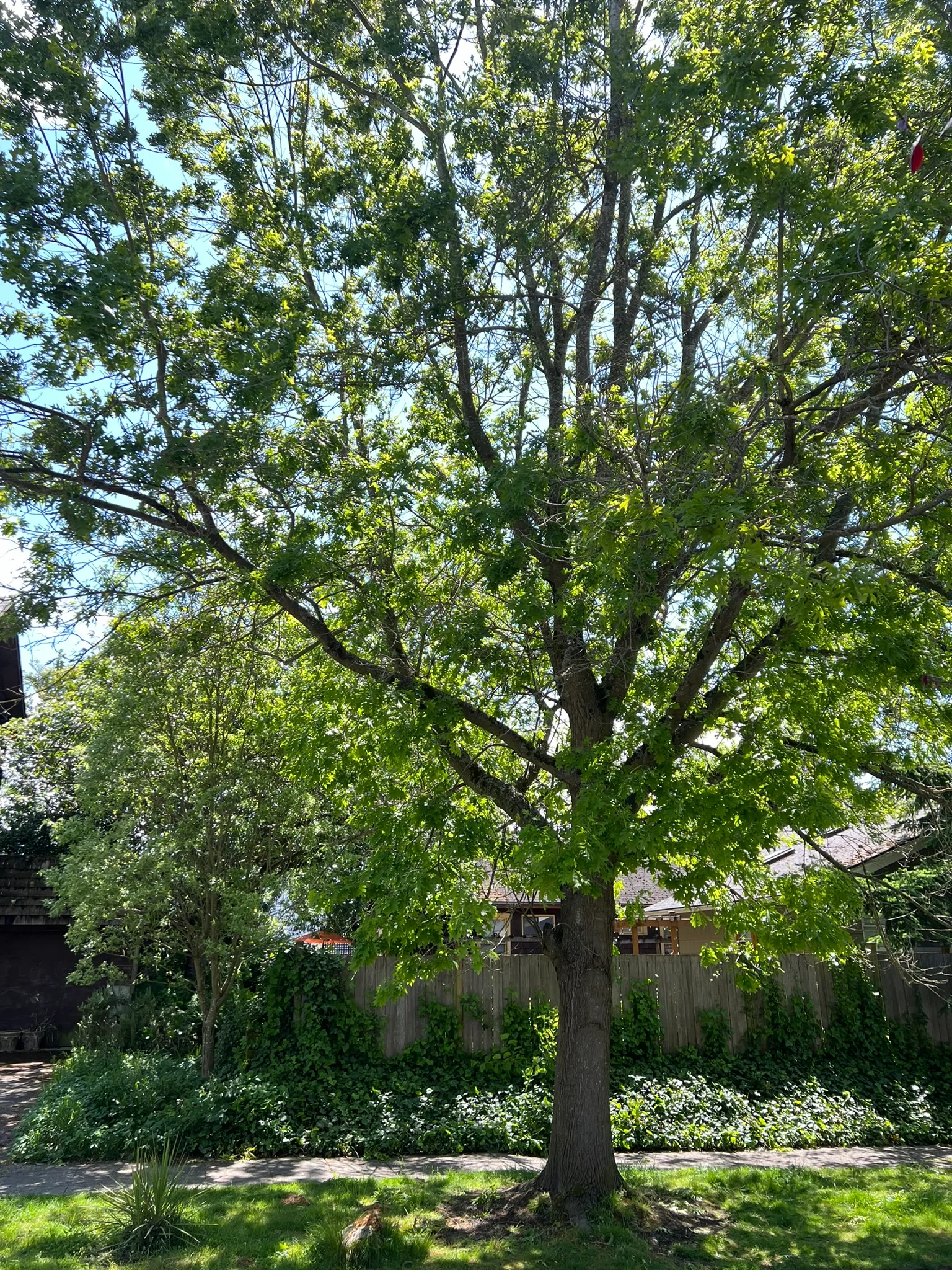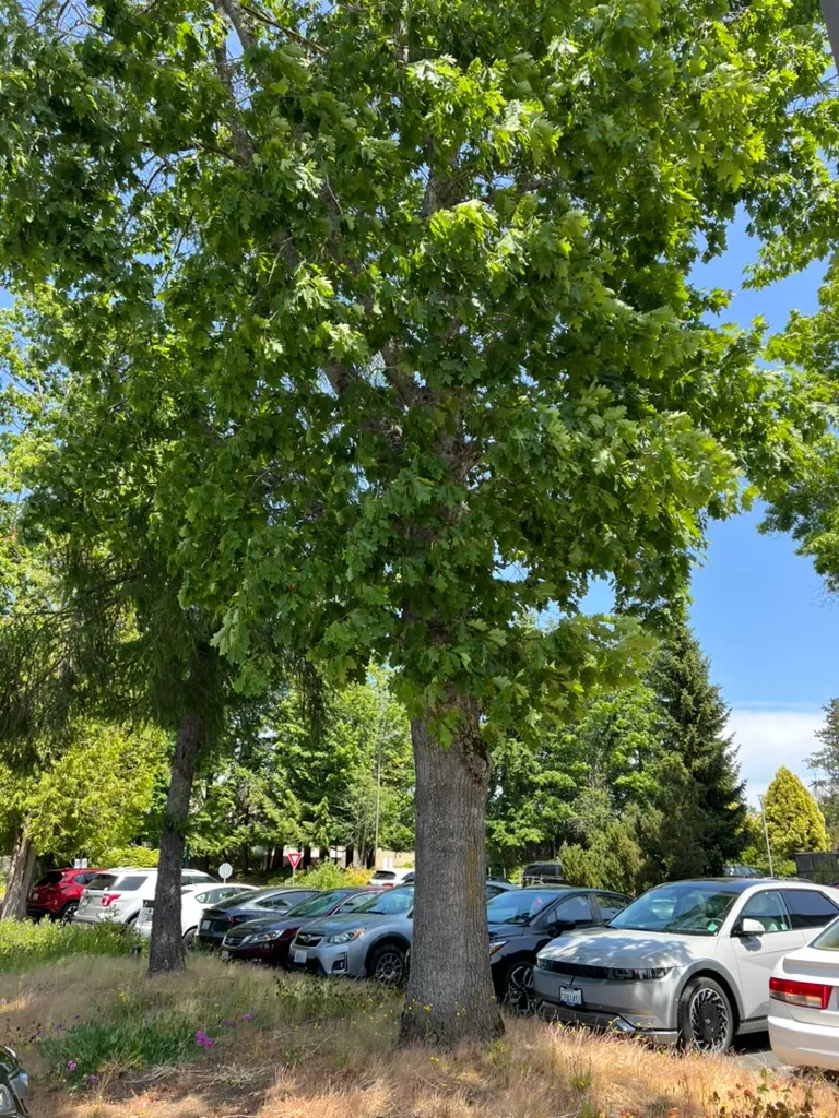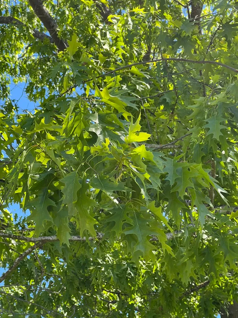Water deeply every 1-2 weeks during the first 2-3 growing seasons. Established trees tolerate drought but benefit from deep irrigation during extended dry periods exceeding 4-6 weeks. Prefers acidic to neutral soils; chlorosis (interveinal yellowing) develops on alkaline soils with pH above 7.0. Avoid soil compaction within the drip line; root damage from grading or construction leads to progressive decline over 3-10 years. Bacterial leaf scorch (Xylella fastidiosa) causes marginal browning of older leaves in late summer; no cure exists, but affected trees may persist for 5-10 years. Oak wilt (Bretziella fagacearum) is lethal in the red oak group; avoid pruning wounds during the growing season in areas where the disease is present.Pruning