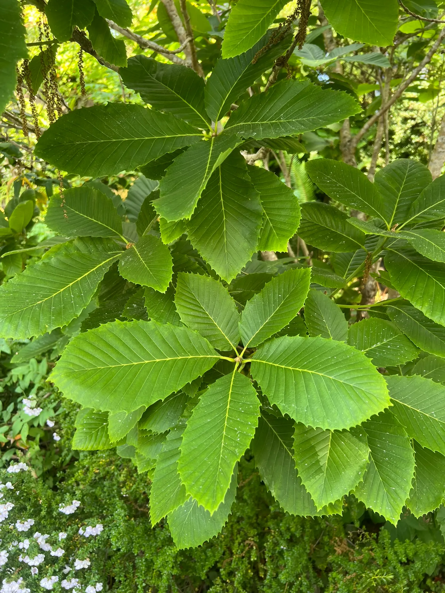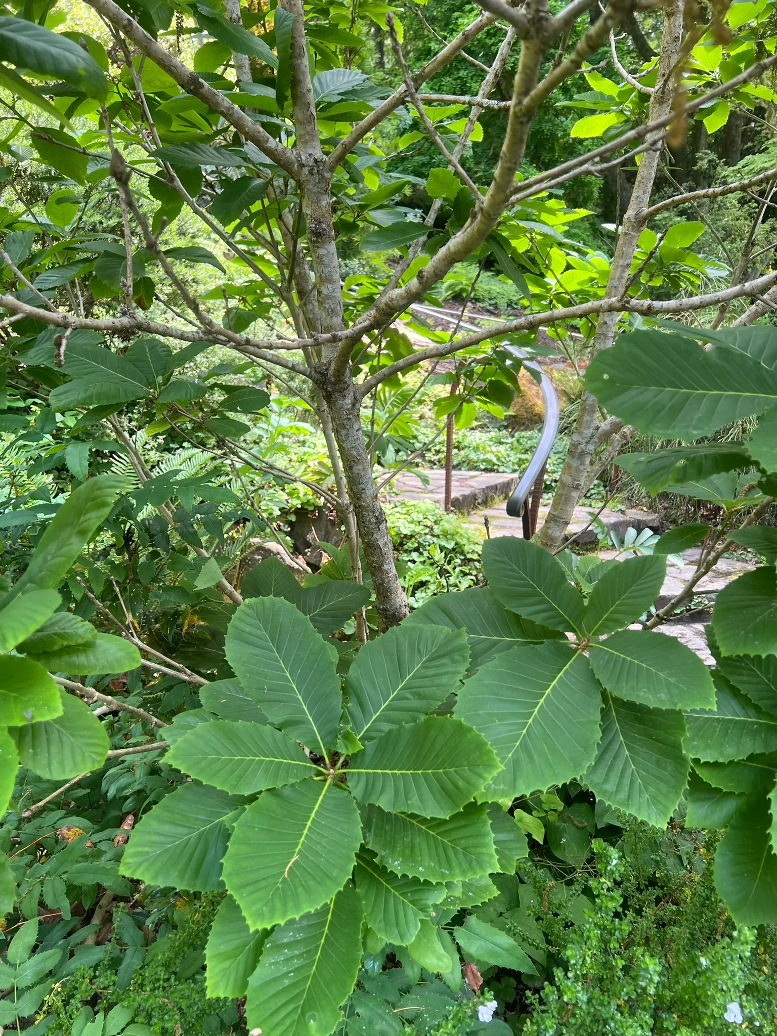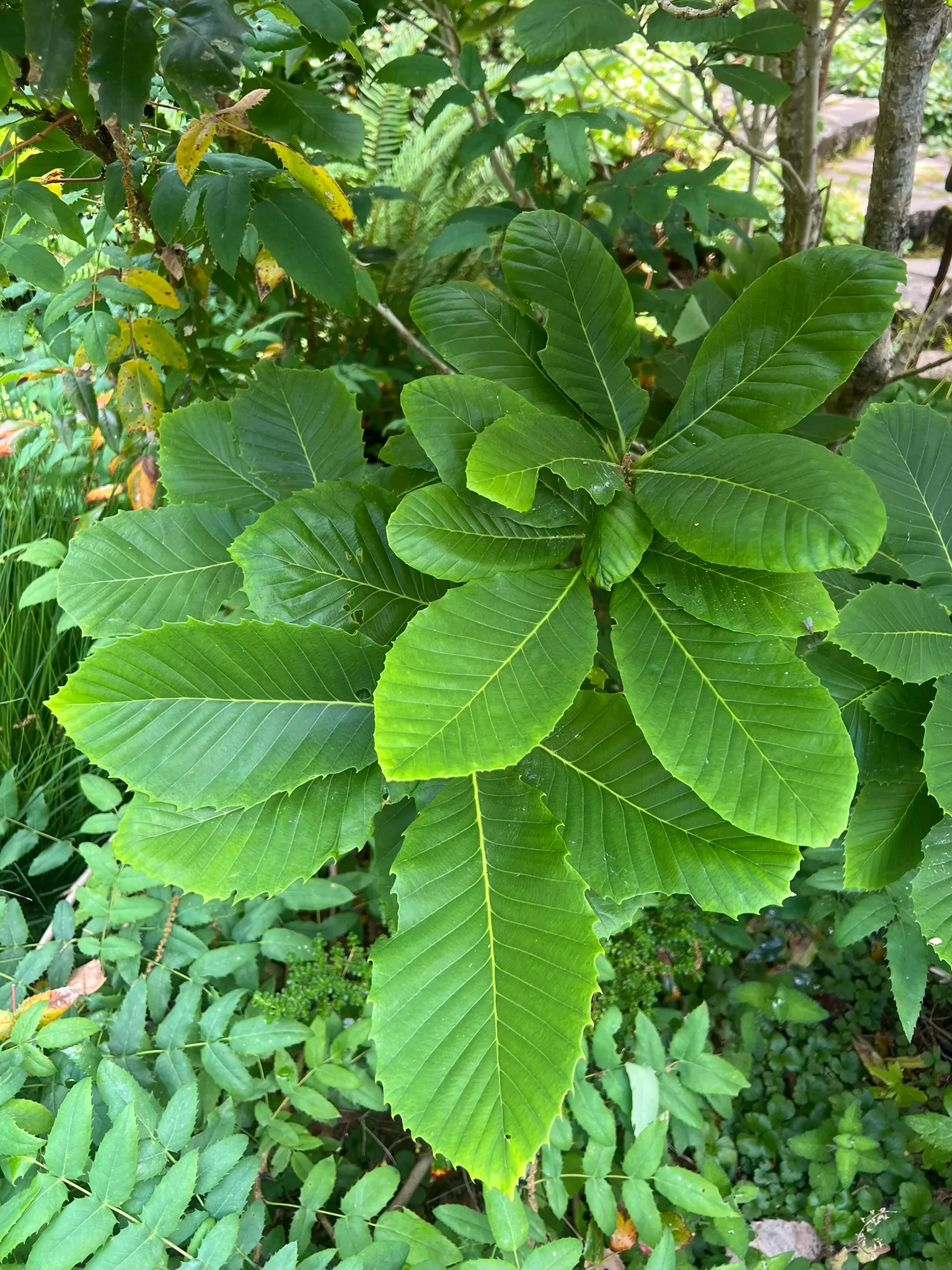 Planted in native plant gardens, woodland understory plantings, and conservation-oriented landscapes where the rhizomatous, colony-forming habit can be accommodated, spaced 4–6 feet (1.2–1.8 m) apart. The chestnut-like foliage and regional native origin make this a botanically significant specimen in collections focused on Pacific Northwest and Klamath flora. Best suited to partly shaded, well-drained sites; not suitable for irrigated lowland gardens.How to Identify