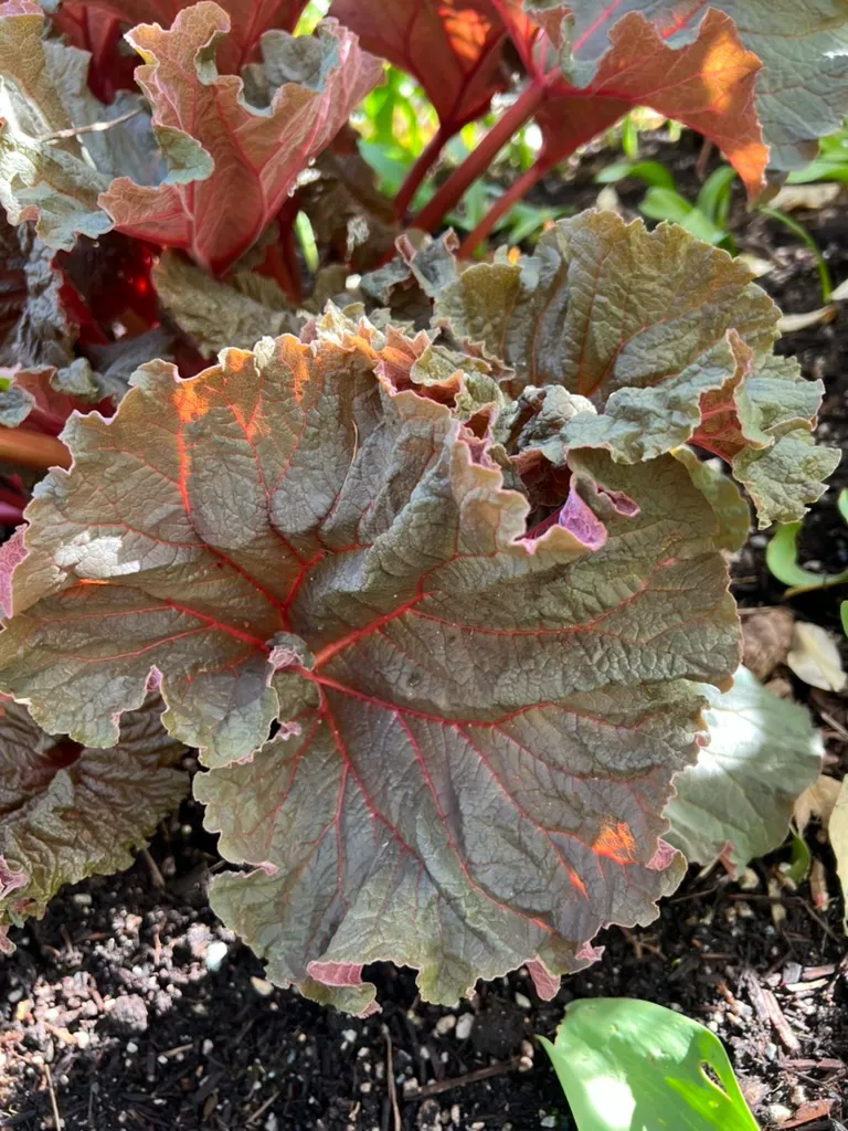 Ornamental rhubarb 'Atrosanguineum' is a bold architectural specimen for the large Pacific Northwest garden, providing a tropical scale of foliage and dramatic vertical flower spires in a completely hardy, reliably returning perennial. The enormous leaves provide exceptional textural contrast alongside grasses, Rodgersia, Gunnera, and large-flowered border perennials. The crimson spring foliage and deep red summer flowers make it among the most colorful of all large-leaved perennials. Best sited at the back of a large border, at a garden boundary, or as a standalone specimen beside water or in a bog garden. Not suitable for small gardens — requires 5–6 feet (1.5–1.8 m) of space and adequate moisture.How to Identify