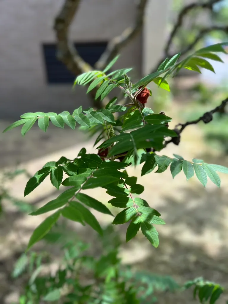 Planted for erosion control on slopes, highway embankments, and disturbed sites where aggressive suckering is an asset, spaced 8-12 feet (2.4-3.7 m) apart. Fall color, persistent winter fruit clusters, and distinctive velvety stems are the primary ornamental features. Wildlife value is high: fruit is consumed by over 30 bird species. The cultivar 'Dissecta' with finely cut leaflets is more suitable for garden settings than the species. Not suitable for foundation plantings or small residential lots due to aggressive suckering. Coppicing produces dramatic, oversized foliage for bold textural effect.How to Identify